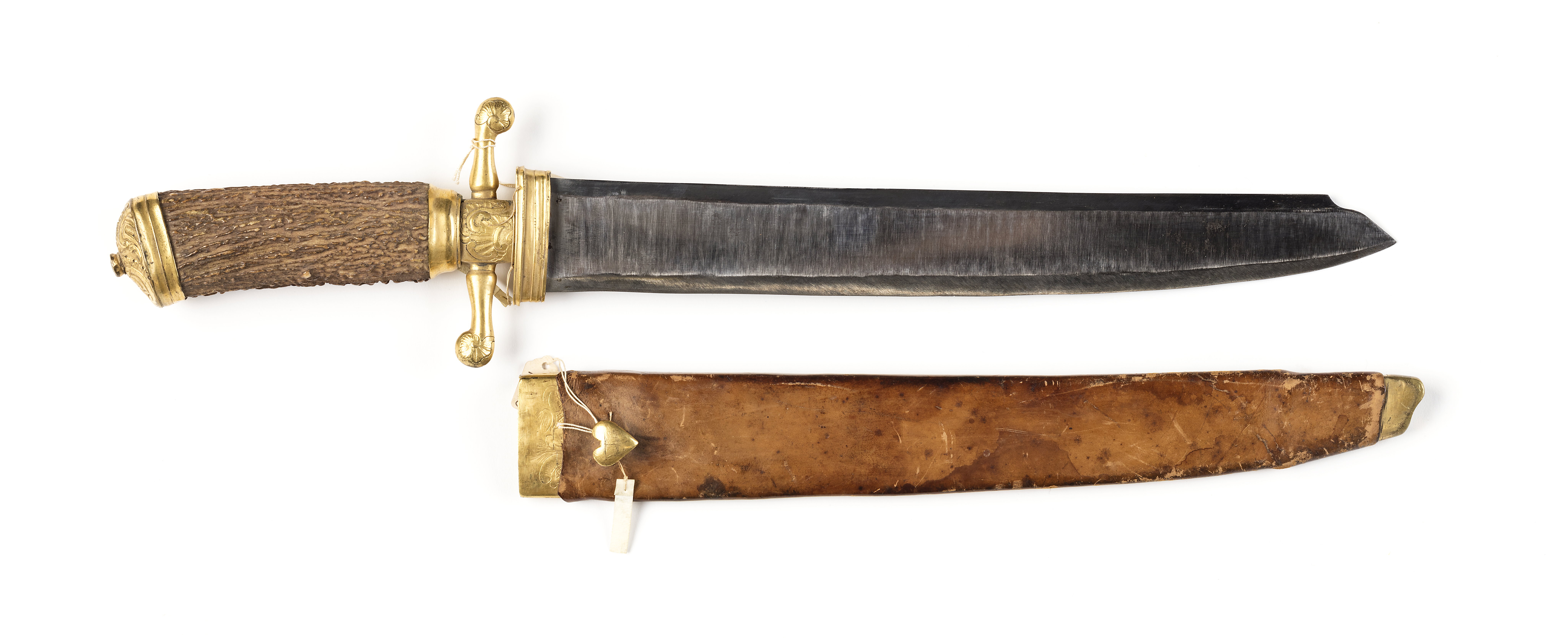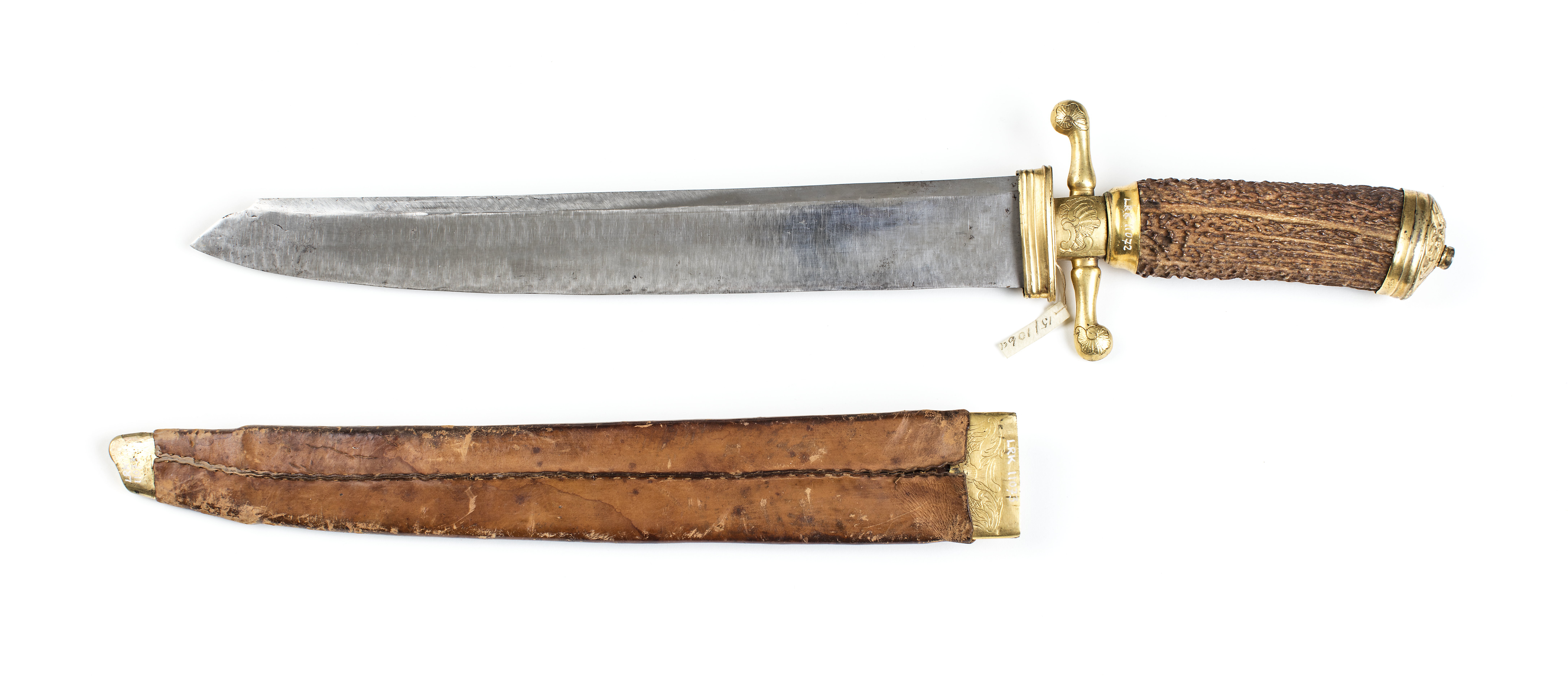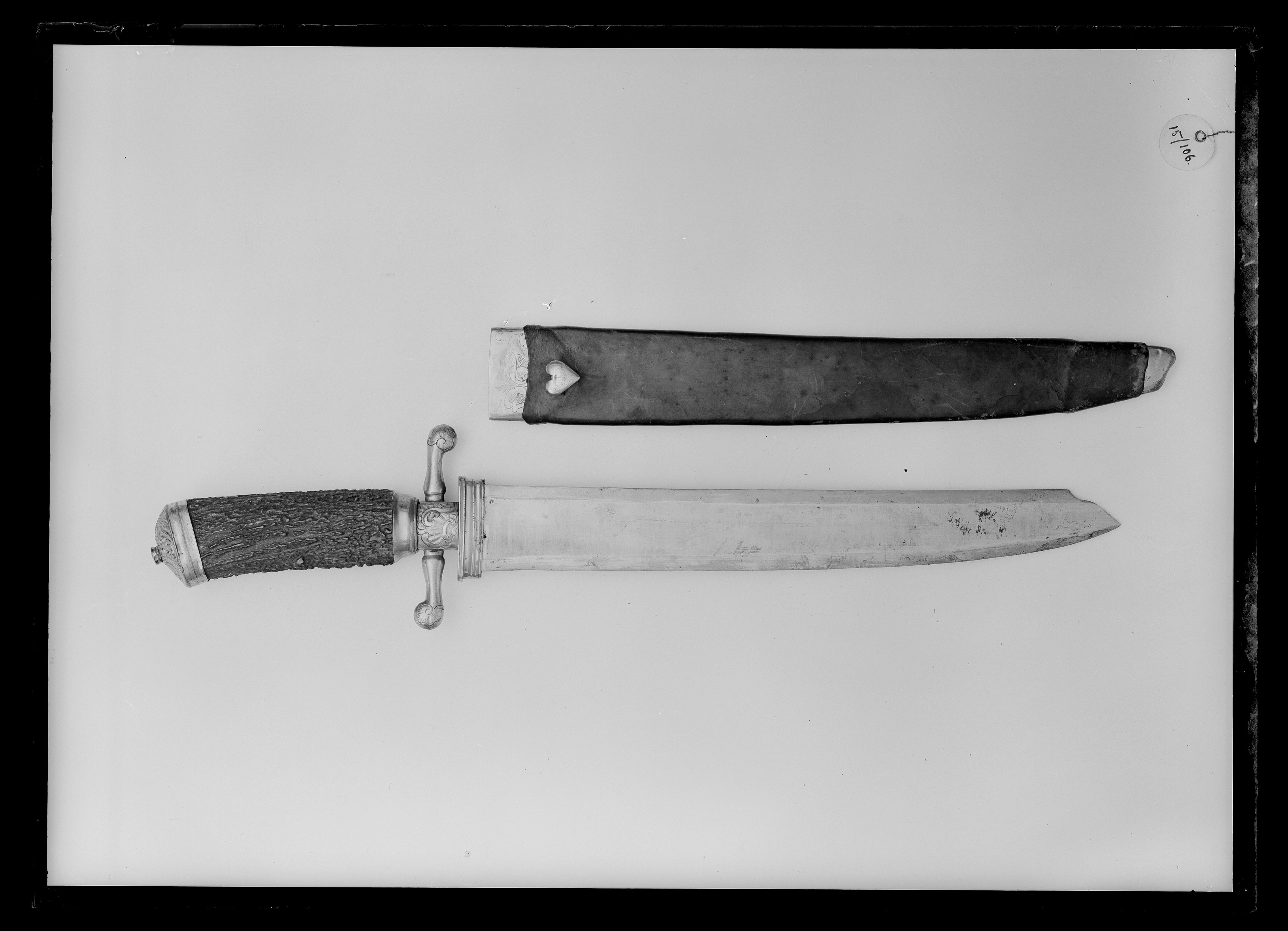 Skaft av brunt hjorthorn (ytan obehandlad) med beslag av förgylld ciselerad mässing. Kappan formad som en oval kåpa påträdd skaftets överdel, kåpans översida med asymmetriskt komponerade rokokoornament: C-formade bågar, rocailler och blad. Nitknapp låg. Skaftets nedre ände omfattas av ett, lågt slätt hylsliknande beslag, nedanför vilket ett 18 mm högt, kryss med två korta parerstänger med knoppformiga ytterändar, den främre uppåtsvängd, den bakre nedåtsvängd. Ut- och insidan av kryss och parerstångsändar med rokokoornament. Kryssets nederdel anslutande till en ca 11 mm hög hylsa omslutande klingbasen och avsedd att trädas över baljans munbleck. Blad brett tämligen tjockt eneggat och mycket svagt böjt. Utsidan slipad med bred grund hålkäl. Spetsen formad genom en konturerad, mot eggsidan fallande nedslipning.