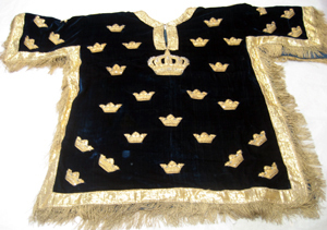 Häroldskåpa av mörkblå sammet beströdd med broderade guldkronor. Kronorna är 70x40 mm i diam samt 160x125 mm i diam. De stora kronorna sitter mitt fram, mitt bak samt en på vardera axel. Kronorna är broderade med guldtråd och med detaljer av blå silketråd och silverpaljetter samt med stenimitationer av silverlan. De små kronorna är öppna medan de stora är slutna, krönta av en korsglob. Kåpan har en rundad halsringning med ett sprund mitt fram, l. 140 mm. Sprundet knäpps upptill med en förgylld hake och en hyska. Kåpan kantas runtom av en bred guldgalon och en lång frans av drejad guldtråd, l. 70 mm. På insidan är fodrat med mellanblå linnelärft.