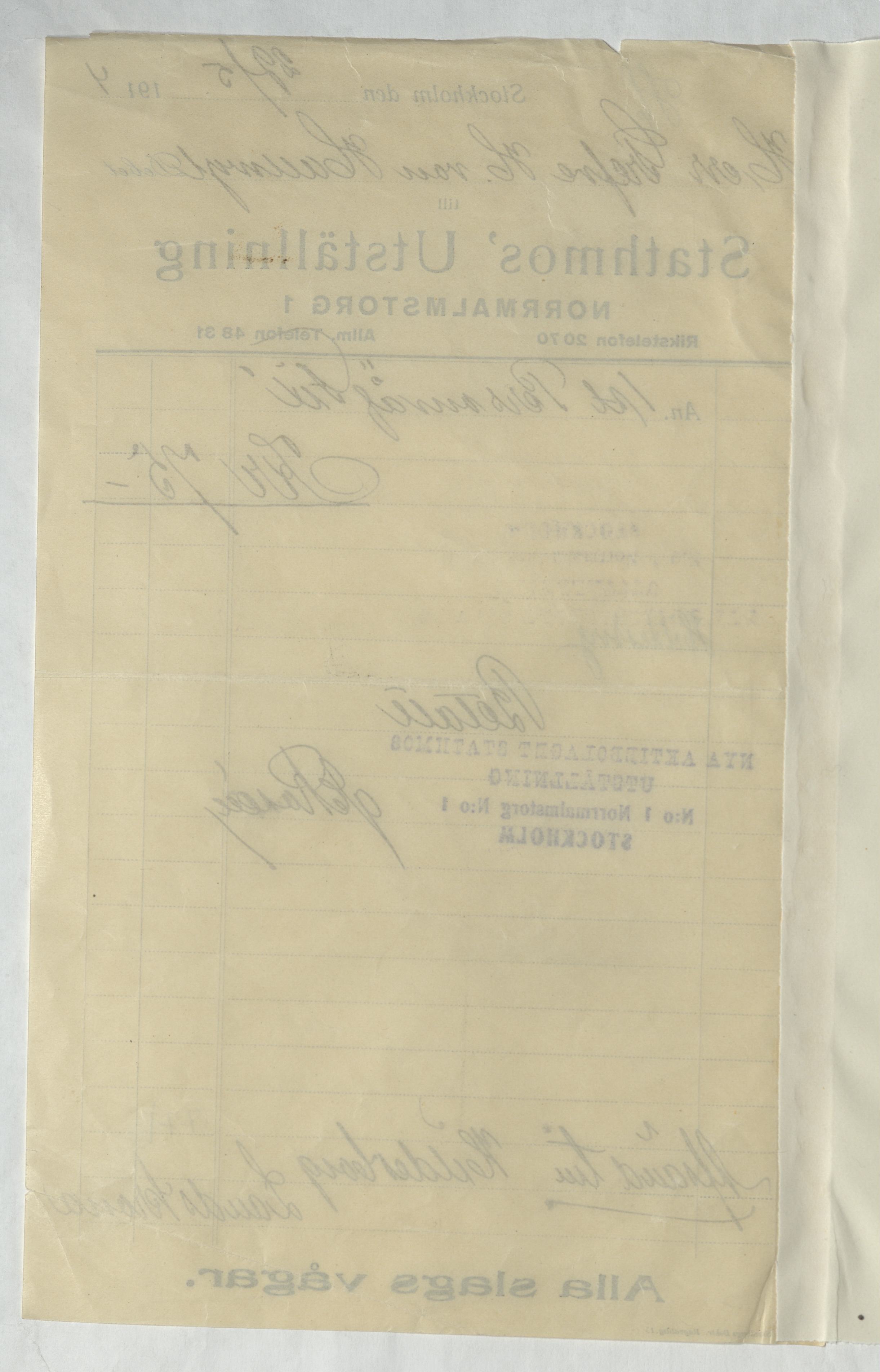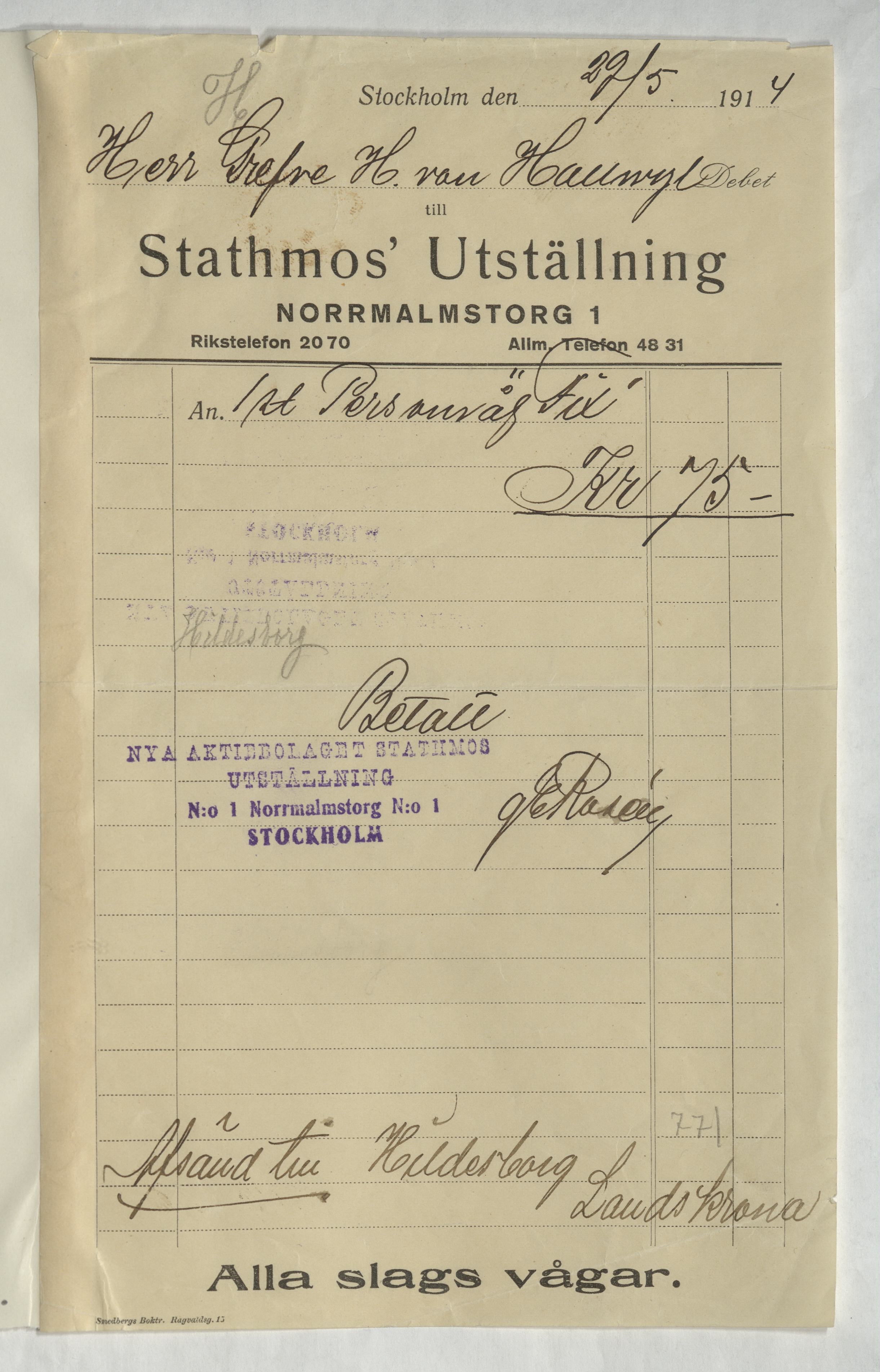 Kvitto från Stathmos Utställning. Stockholm, 1914.