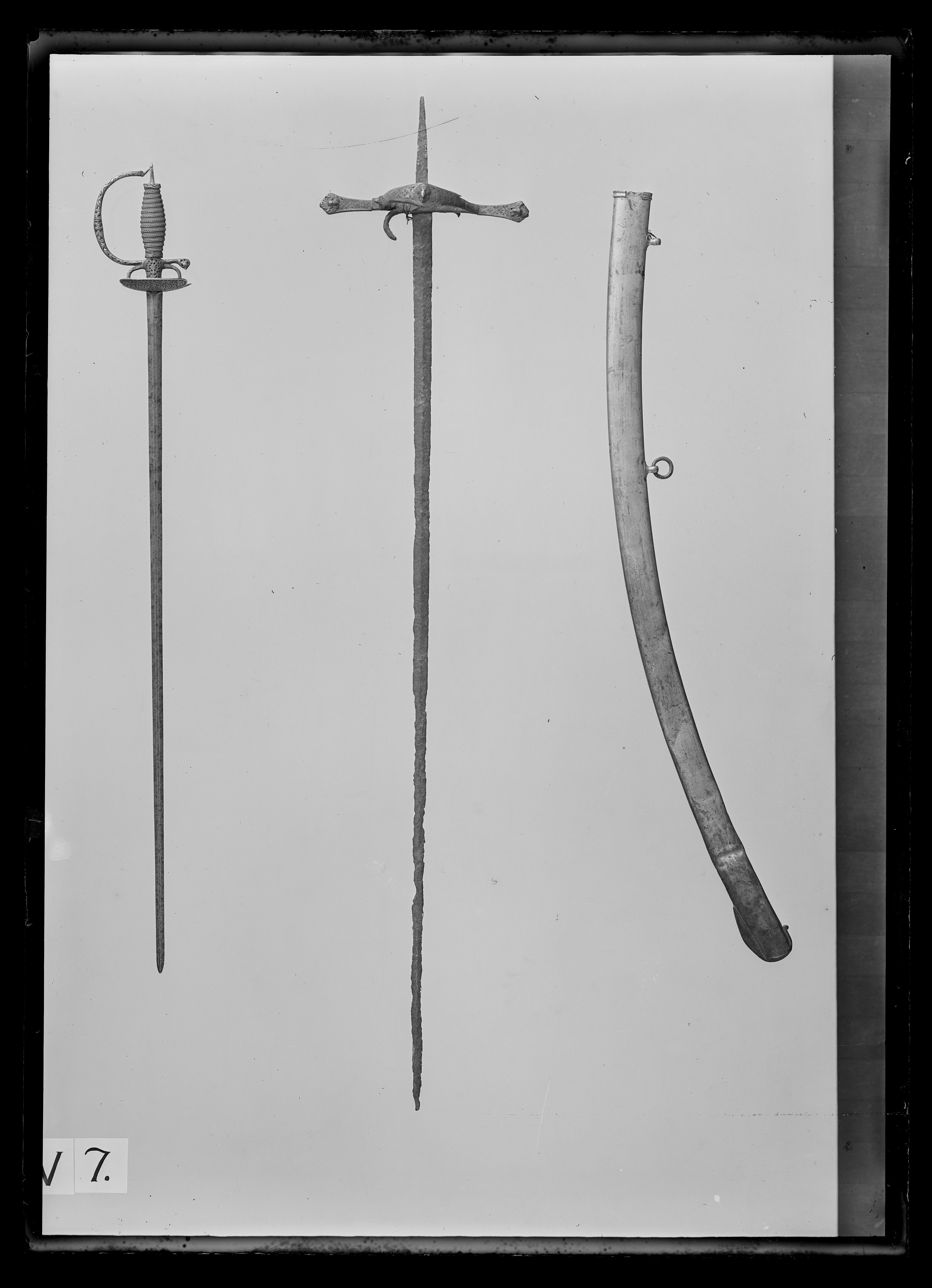 Fäste av stål med ytan anfrätt av gravrost. Knapp och kavel fattas (förkomna), av fingerbyglar återstår drygt hälften av den ena. Parerstänger raka, långa, de vidgade ytterdelarna liksom den stora kryssbygeln beslagna med silverplåt. Beslagens utsida ornerad med genombrutna fyrbladiga rosetter, inskrivna i ett rombiskt rutmönster, på kryssbygelns mitt och vid parerstängernas ändar ett gjutet silverornament i relief, föreställande ett huvud av vädur (?), omgivet på sidorna av vingar och upptill av en palmett; insidan ornerad med ett i tunna linjer graverat rankmönster. Tången med rektangulärt tvärsnitt; på tången är trädda en lös, oval, 33 mm lång, slät silverplåt och ett löst ovalt ringbeslag av silver, utmed vars mitt en tvärräfflad bård. Klinga rak, tämligen smal, med c. 50 mm lång ricasso, i övrigt slipad med två jämnbreda mötande skär. Klingan i sin helhet skadad av gravrost, yttersta hälften, från c. 480 mm från udden, synnerligen skadad.