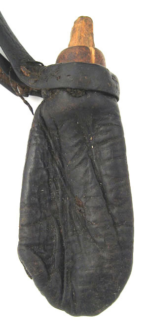 Pung sydd av svart läder med rundad nederdel och upptill pip av trä. Nerstucken i pipen en träplugg, l 29 mm. Runt pungens mynning ett fastsytt läderband, l ca 100 mm, i sin tur fästat i kruttyget.