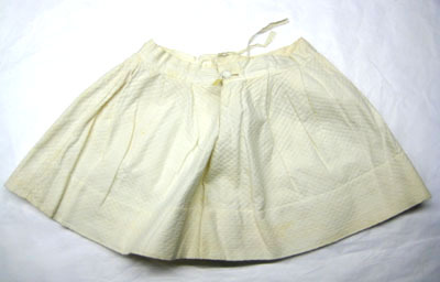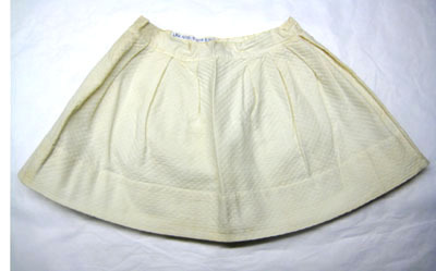 Vit kjol sydd i bomull där tyget är vävt i kypert med rombmönster (vit piké) vilket ger tyget en struktur. Linningen är av tunt bomullstyg och är 30 mm bred.Runt kjolen är veck (40 mm breda) fördelade som ger vidd till kjolen. Kjolen knäpps med en knapp som är 15 mm bred och knapphålet är 12 mm bred. Invändigt på varje sida är ett band fastsytt, 150 mm långt och 10 mm brett. Längst ner på kjolen är sömmen 85 mm.