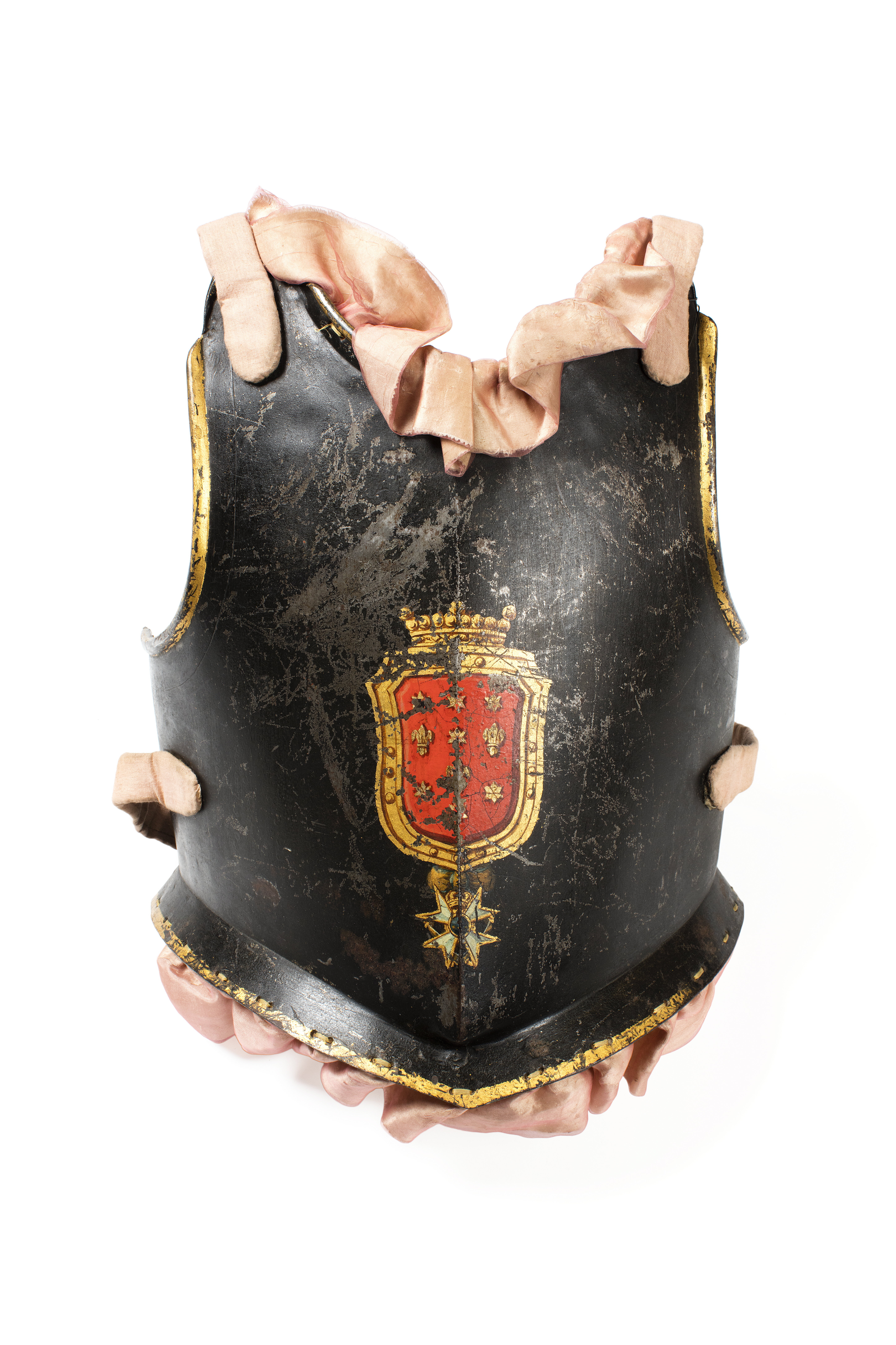 Av järnplåt, svartmålad, förgyllda kanter. Mitt på bröstet målat i guld och rött friherrliga ätten von Liewens vapensköld: i rött fält tre liljor och sju stjärnor av guld krönt av en friherrlig krona, under detta svärdsorden, h 165mm, b 90 mm. Harnesket kantat med rosa, veckat sidenband. I vardera sidan samt vid axlarna fäst läderrrem, överklädd med rosa textil. Invändigt klätt med ofärgat linne.