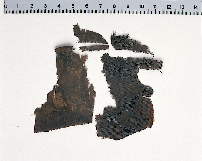 Praktdräkt, brokad med mönstrad botten av varprips och 8-skafts satin med guldbroscheringar. Fragmentet består av fem delar. Fragment i siden med brocherat blommönster i metalltråd med botten av i satin och rips. Fragment i tuskaftat siden. De ursprungliga färgerna delvis förändrade, fragmentet numera i brunt och guld. Fragmentet ingår i en samling fragment tagna som prov ur drottning Kristinas kista vid gravöppningen den 13-14 december 1965. Varprips: Varp: 2-trådigt silke med svag s-snodd. Trådtäthet: 80 trådar/cm. Inslag: Dubbla inslag med 2-trådigt eller dubbelspolat garn med parallellt liggande fibrer, saknar snodd. Trådtäthet: 18 inslag/cm med 4 tr/inslag. Material: Silke. Teknik: Varprips, fr. gros de Tours. Kommentar: Nuvarande färg är brun. Satin: Varp: 2-trådigt silke med svag s-snodd. Trådtäthet: 80 trådar/cm. Inslag: 2-trådigt eller dubbelspolat garn med parallellt liggande fibrer. Trådtäthet: 72 trådar/cm. Material: Silke. Teknik: Satin 8 skaft. Kommentar: Nuvarande färg är brun. Broscheringen: Material: Förgyllt silverlan spunnet runt en silkekärna. Förgyllt på båda sidorna, guldskiktets tjocklek <0,1 um och lanets tjocklek är 0,03 mm. Teknik: Broscheringarna är ej avbundna utan flotterar. Taft: Varp: Löst spunnet silke i s-snodd. Trådtäthet: 68 trådar/cm. Inslag: Parallellt liggande fibrer, inslaget är grövre än varpen. Trådtäthet: 32 trådar/cm. Material: Silke. Teknik: Tuskaft. Kommentar: Förmodligen samma som 32971, 32979, 32980 och 33004. Nuvarande färg är brun.