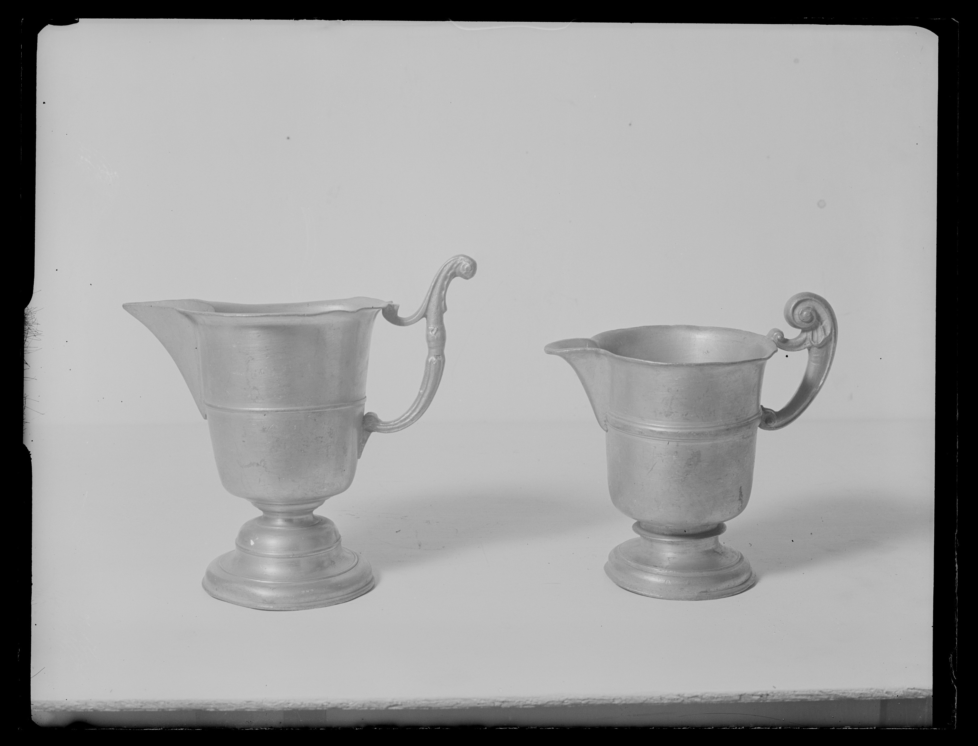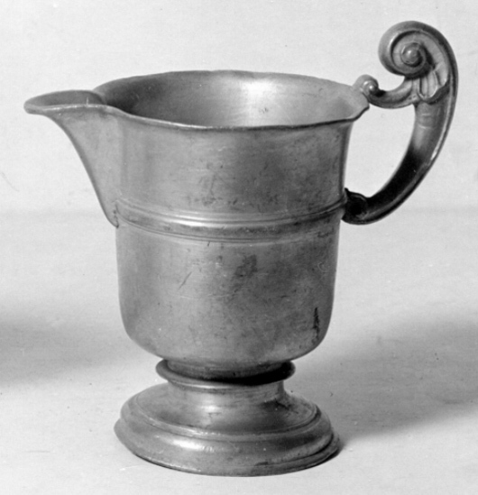Tennkanna med horisontal vulst på mitten, raka sidor och något vidgad mynning. Rund, profilerad fot med smalare, cylindrisk del under kannan. Lodgrepe i form av inåtvänd C-formad volut uppskjutande över mynningen. I kannans botten en rosstämpel med tre normalsköldar, en med öppen krona. Två sköldar visar man med stav. Flankerande bokstäver "I I". Denna kombinationsstämpel använd av stockholmsmästaren Johan Johansson 1677 (enl A. Löfgren) år 1679 (enligt Bruzelli). Under snåsen graverat "H E R S " under kunglig krona. Under grepen " STRÖMSHOLM" // 1690".