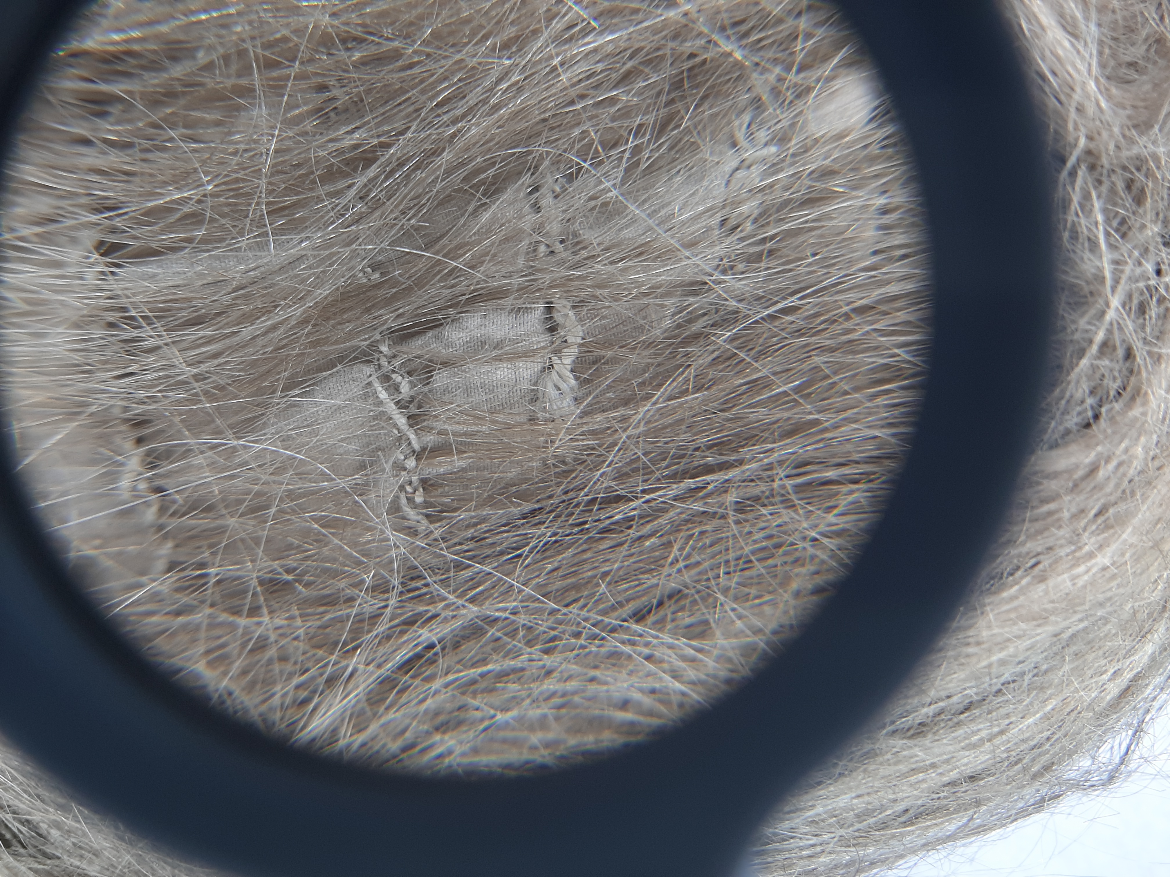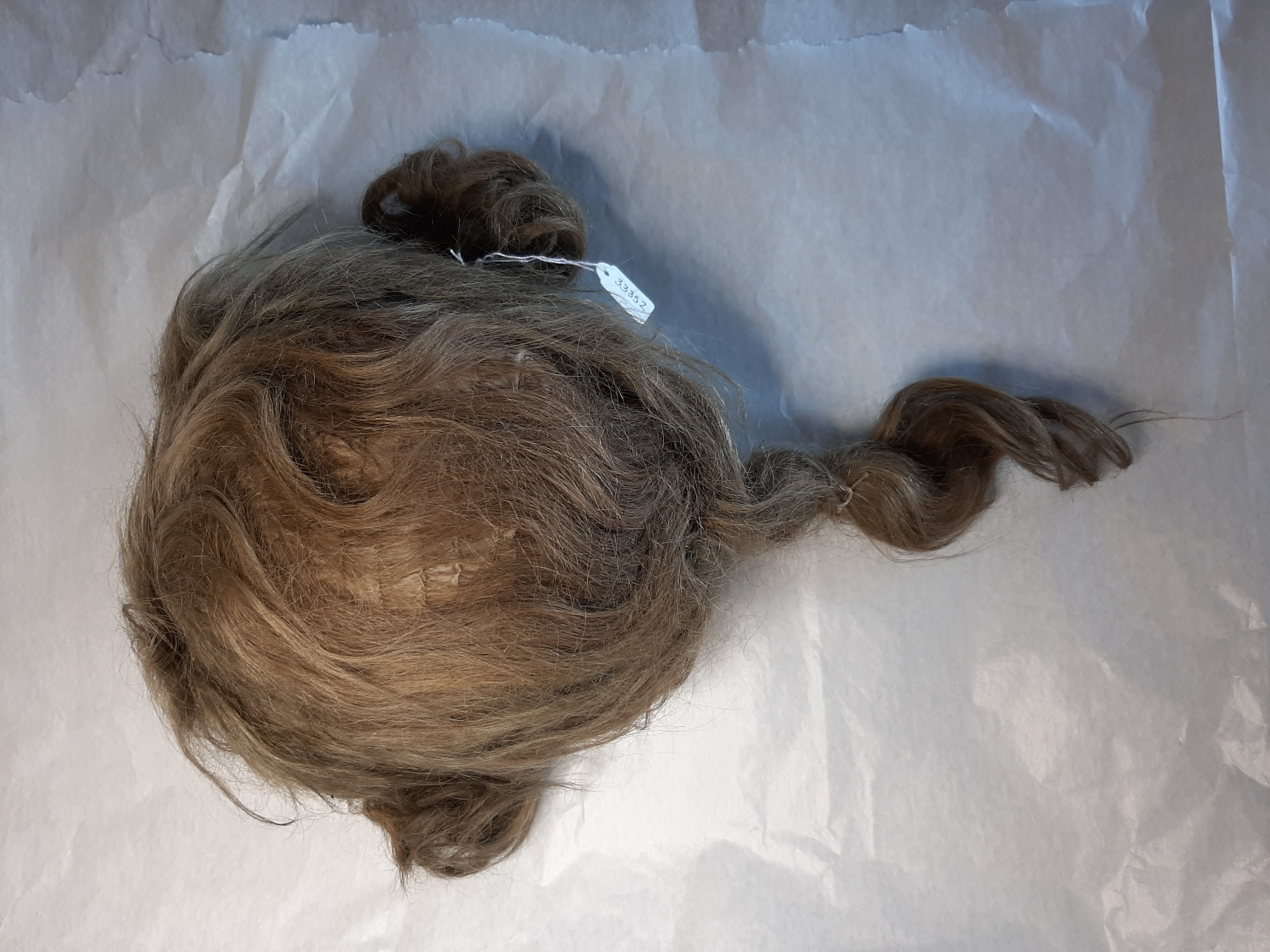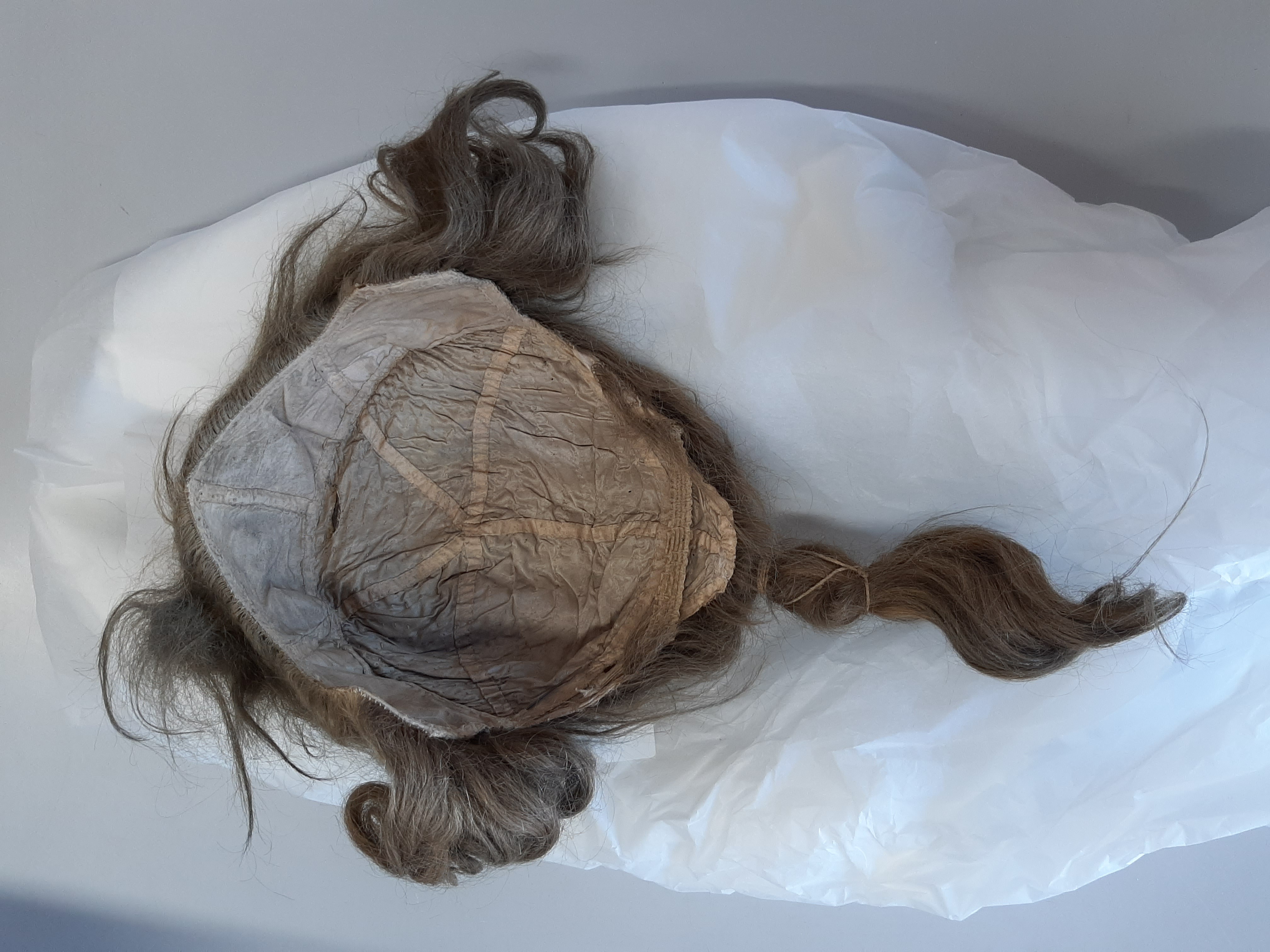 Gråbrun peruk av typisk 1700-talsmodell med svans i nacken, s.k. stångpiska, och sidohåret uppfäst med hårnålar i lockar över öronen. Håret är troligtvis äkta. Det är uppsytt på en stomme av beigt siden med flikar i sidorna, pannan och ner i nacken. I nacken finns ett resårband. Längd stångpiska: ca 200 mm. Stångpiskan är omknuten med ett snöre. På tillhörande pappersetikett med bläckpåskrift: "K[lädkammaren]// Ut. N...// Peruk...// en Ko[?]...// Gustaf...// ev Ko[?]..." Pappersetiketten är delad i två bitar och saknar helt den högra delen. Etiketten förvaras i en separat påse.