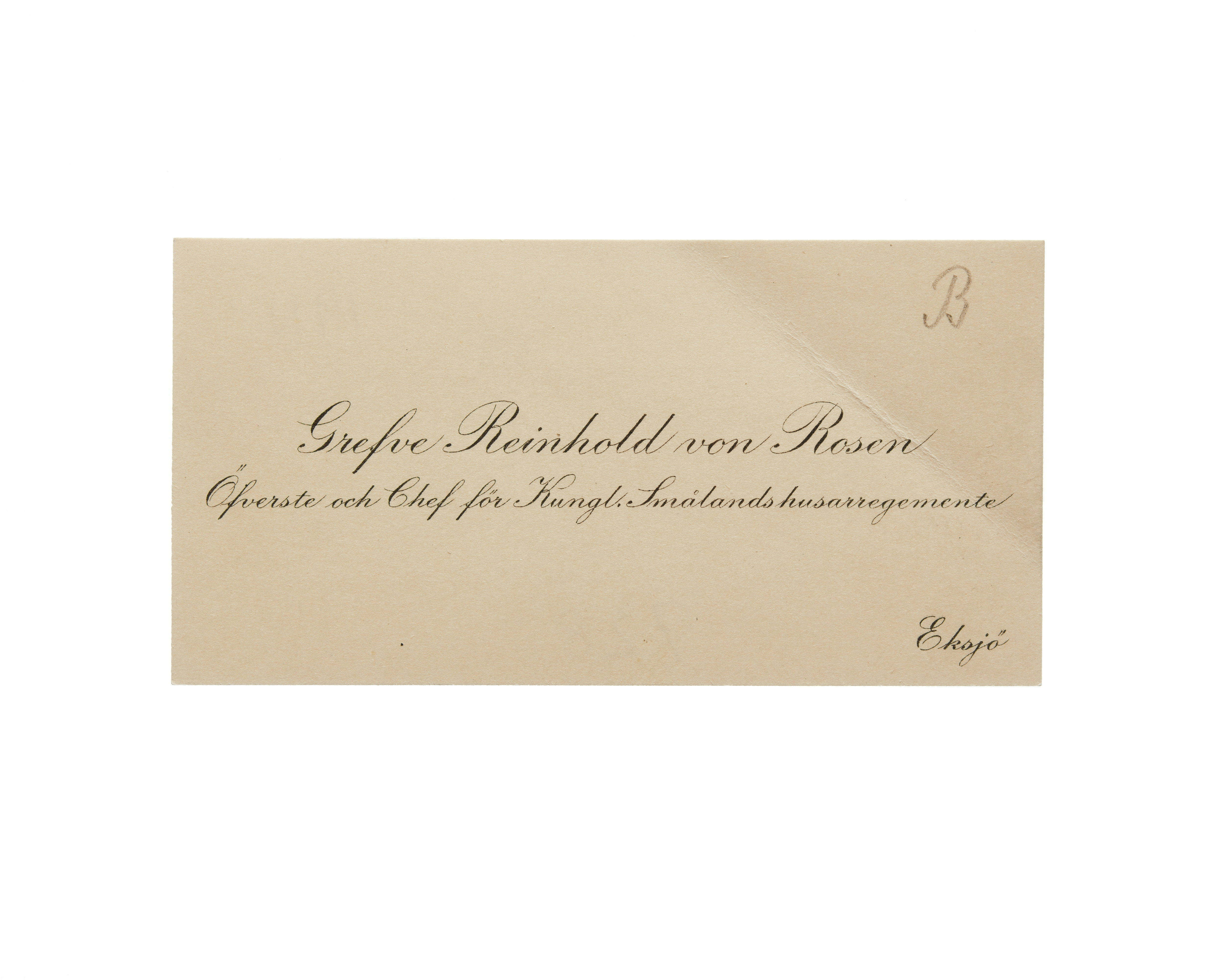 Visitkort från Greve Reinhold von Rosen, Överste och Chef för Kungl. Smålands husarregemente.