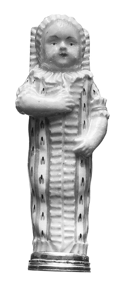 Dekor i färger på glasyren. Gulröd mössa med veckat vitt kantband samt förgylld nackrosett: vitt krås kring hals och ärmar. Barnet med högra armen på bröstet och den vänstra längst sidan samt liggande i en vit och gulrandig s. k. liggkudde, de vita ränderna med små blommor i svart och ljusblått; kring kuddens kanter ett veckat ljusrött band. Mynningsbeslag med slätt platt fällock, av förgylld mässing med profilerade kanter.