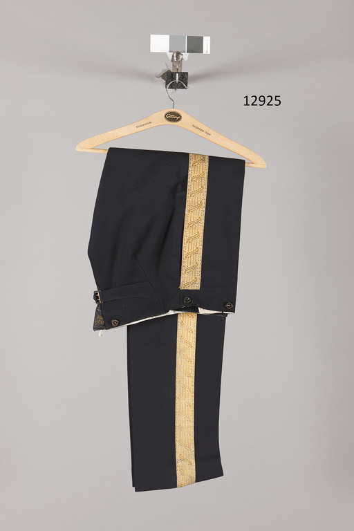 Långbyxor, modellenliga av mörkblått doerskinn (ett kläde) med guldgalon, b: 46 mm. Gylf med sex mörkblå, platta knappar d: 15 mm med på ovansidan firmamärke: "ZITTORIN & LUNDVIK", på alla utom en, märkt "FR.KAEDINGS EFTR:// STOCKHOLM". På knapphålssidan en mörkblå, platt knapp, d: 17 mm, märkt på ovansidan "ZITTORIN & LUNDVIK // STOCKHOLM". Utefter byxornas överkant ytterligare sex sådana knappar. Sidsömsfickor. Baktill ett kilformigt sprund med firmamärke, unionsvapen, en Karl XV-medalj, en Oskar II-medalj samt sliten text:" FR. KAEDINGS EFTER // KONGL. HOFLEVERANTÖRER // STOCKHOLM". Spänntampar med "SOLIDE"-sölja. På baksidan fastsytt en vit vaxduksetikett: "F. KAEDINGS EFTERTRÄDARE // STOCKHOLM 2:11/9 1908 // Herr // H. M. Konungen". Linningen fodrad med ett vitt siden och vit bomullssatäng. Grenfoder av vitt siden. Fickfoder av ljusgrå yllekypert. Framtill en slejf med två knapphål som knäpps i två av gylfknapparna. Baktill en tyghälla.