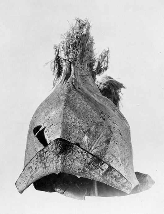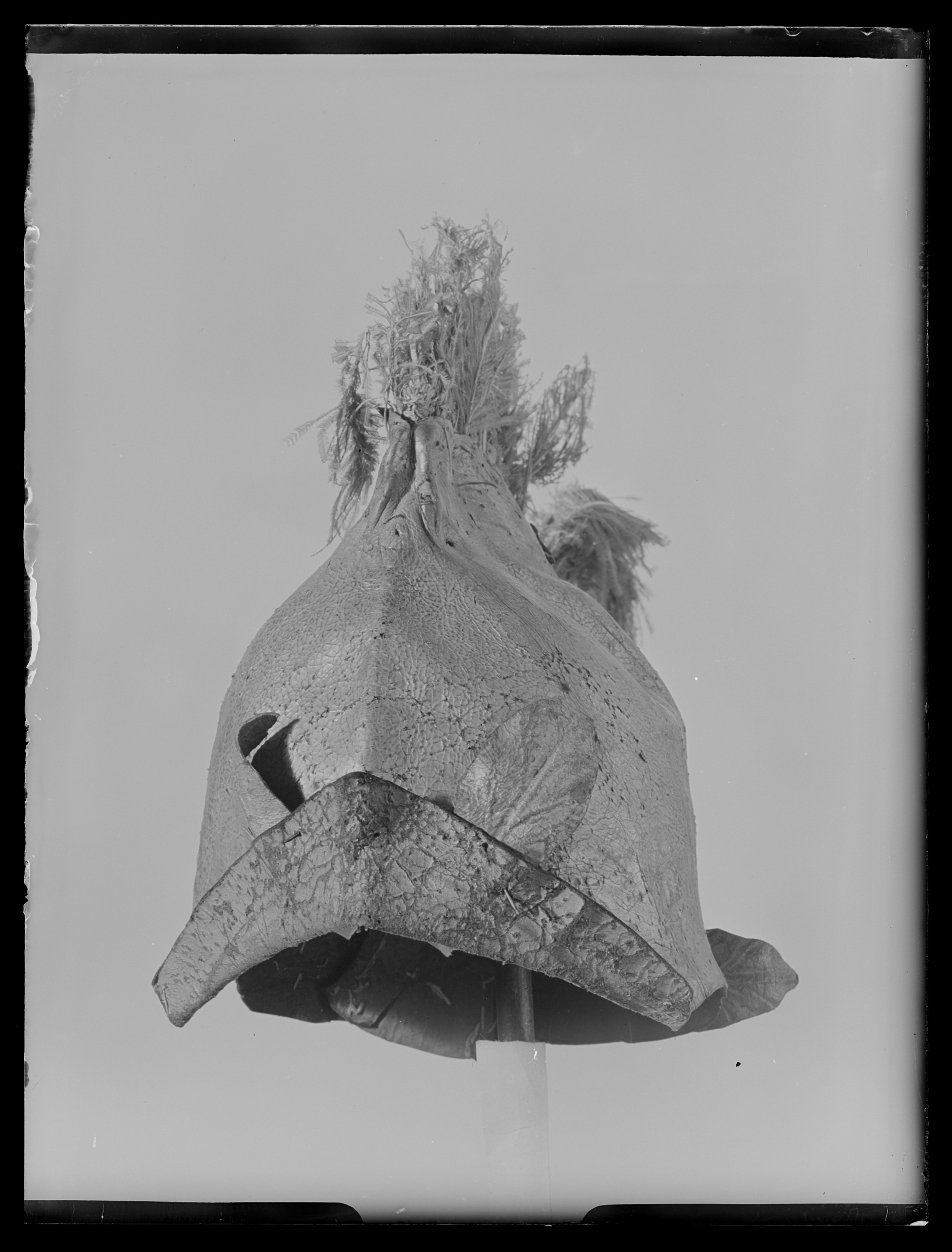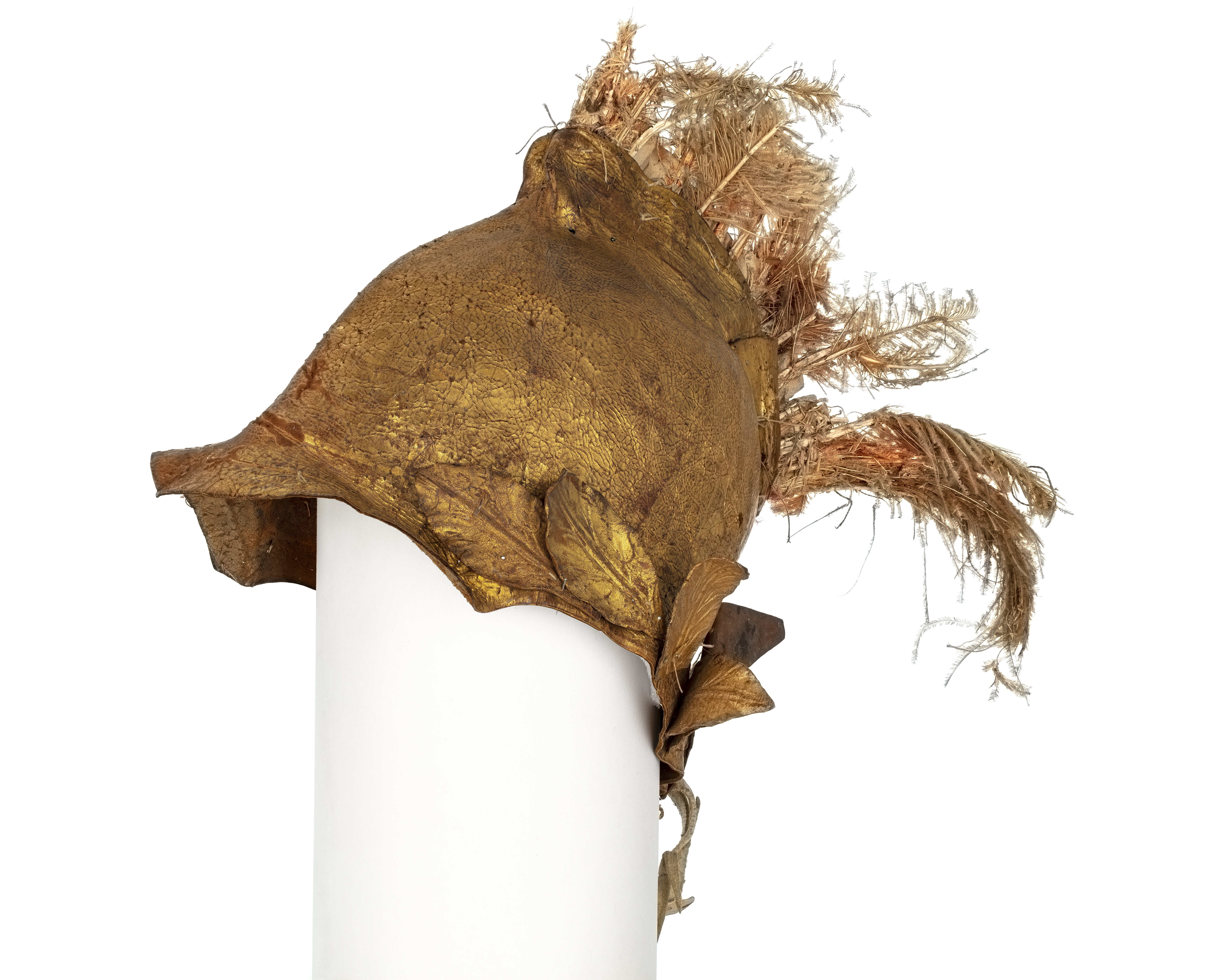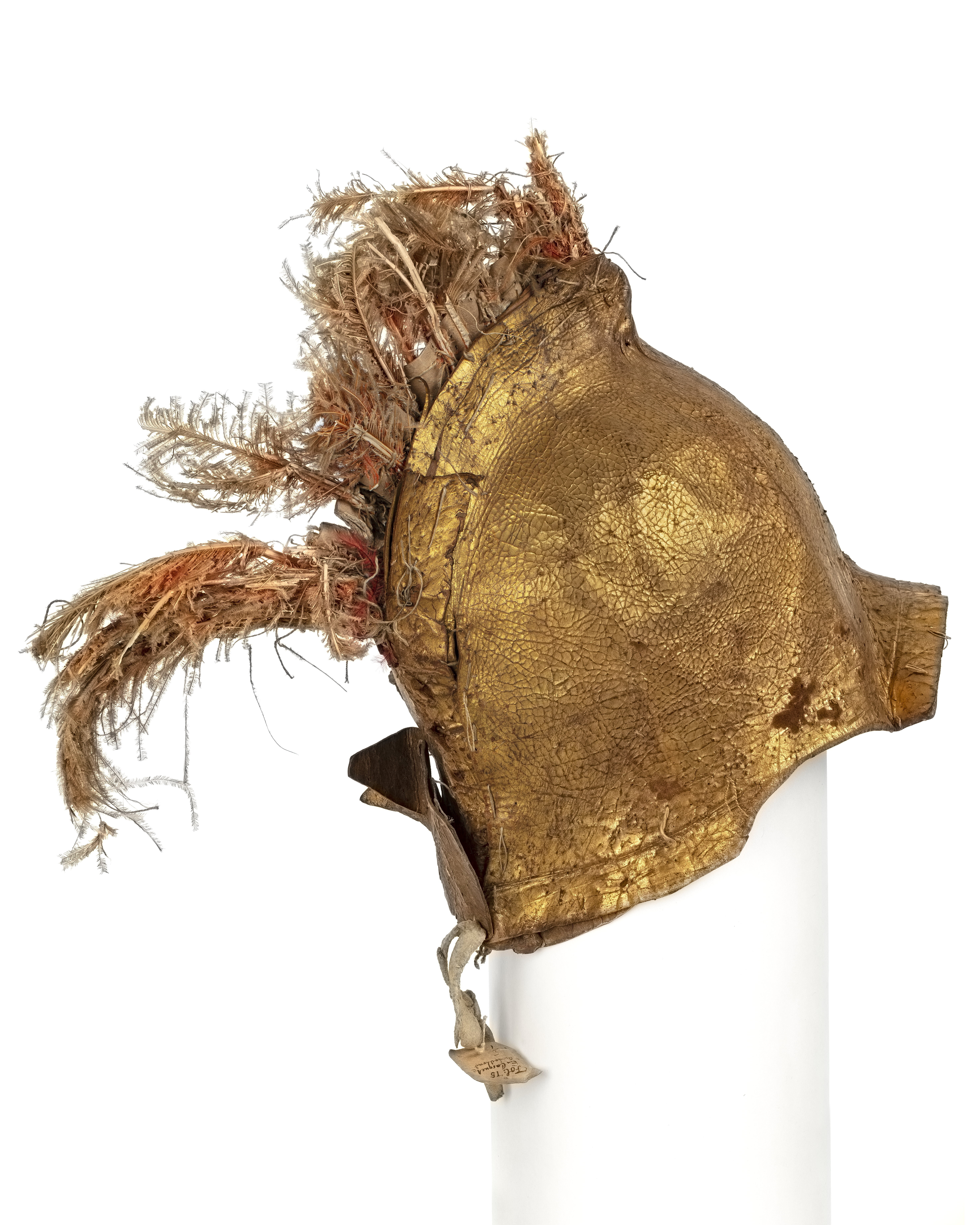 Hjälmhuva av läder på utsidan övermålad med guldfärg. Hjälmen imiterande en antik (attisk?) hjälm. I hjälmkammen rester av orangefärgade fjädrar. Hjälmen framtill uppvikt samt försedd med två blad. I nacken två över varandra lagda blad samt mitt bak en läderögla i vilken är fästad en rektangulär pappbit, målad på ena sidan, på andra bläckpåskrift: "Fo1:15 // En Casquet // omändrad". Tillverkad av hovskulptören Nicolaes Millich 1672. Har tillhört Karl XI (1655-1697).