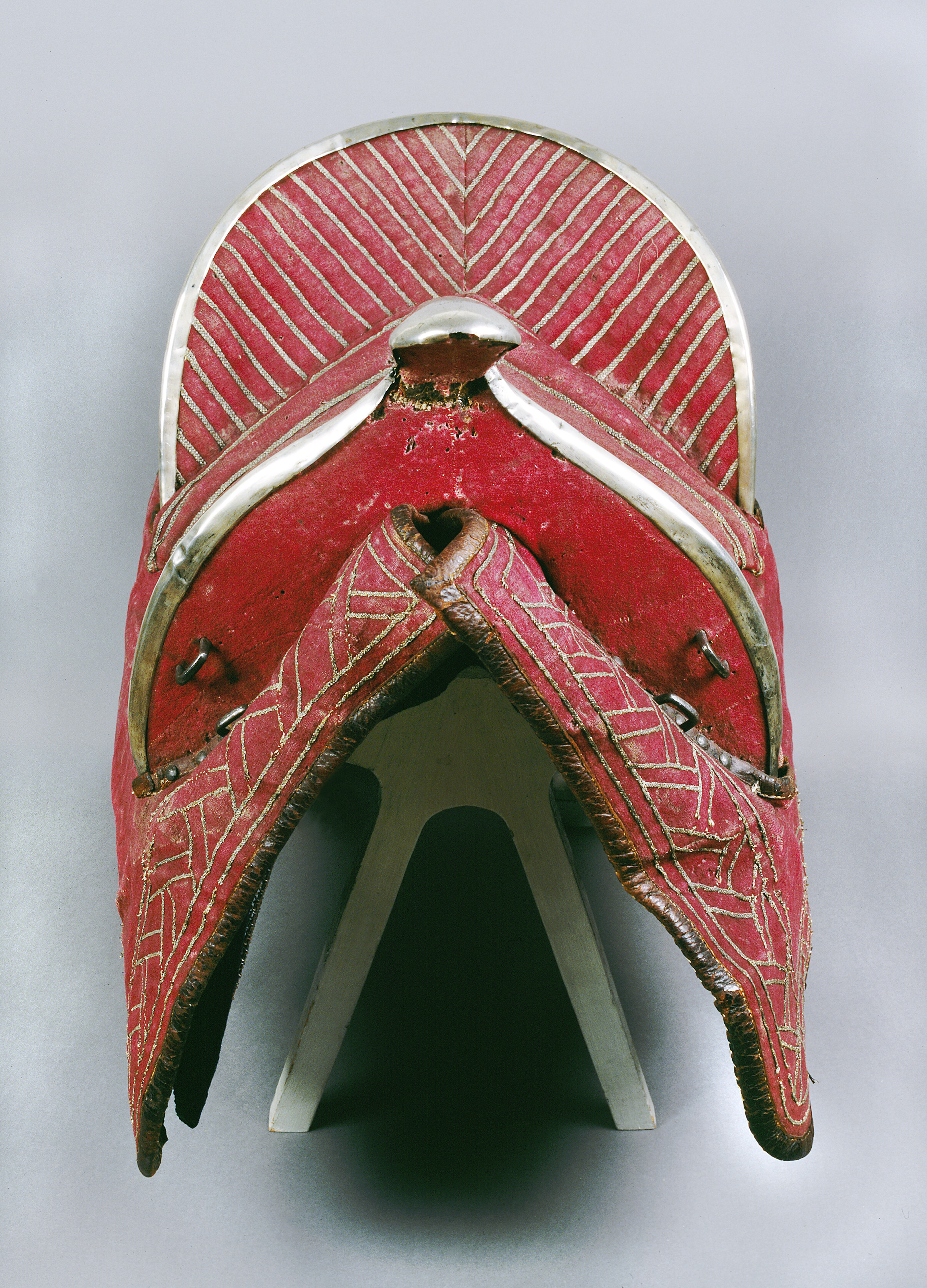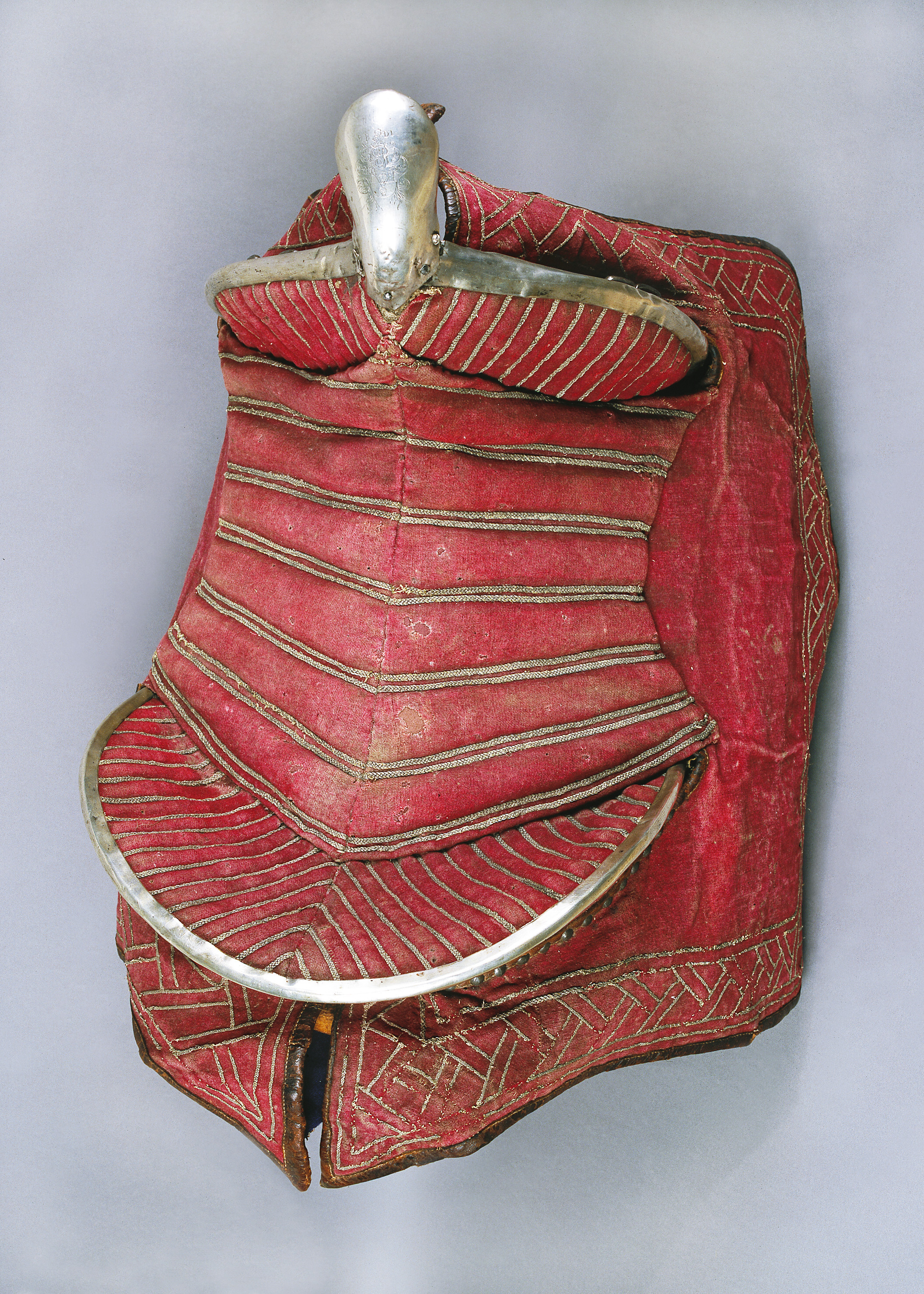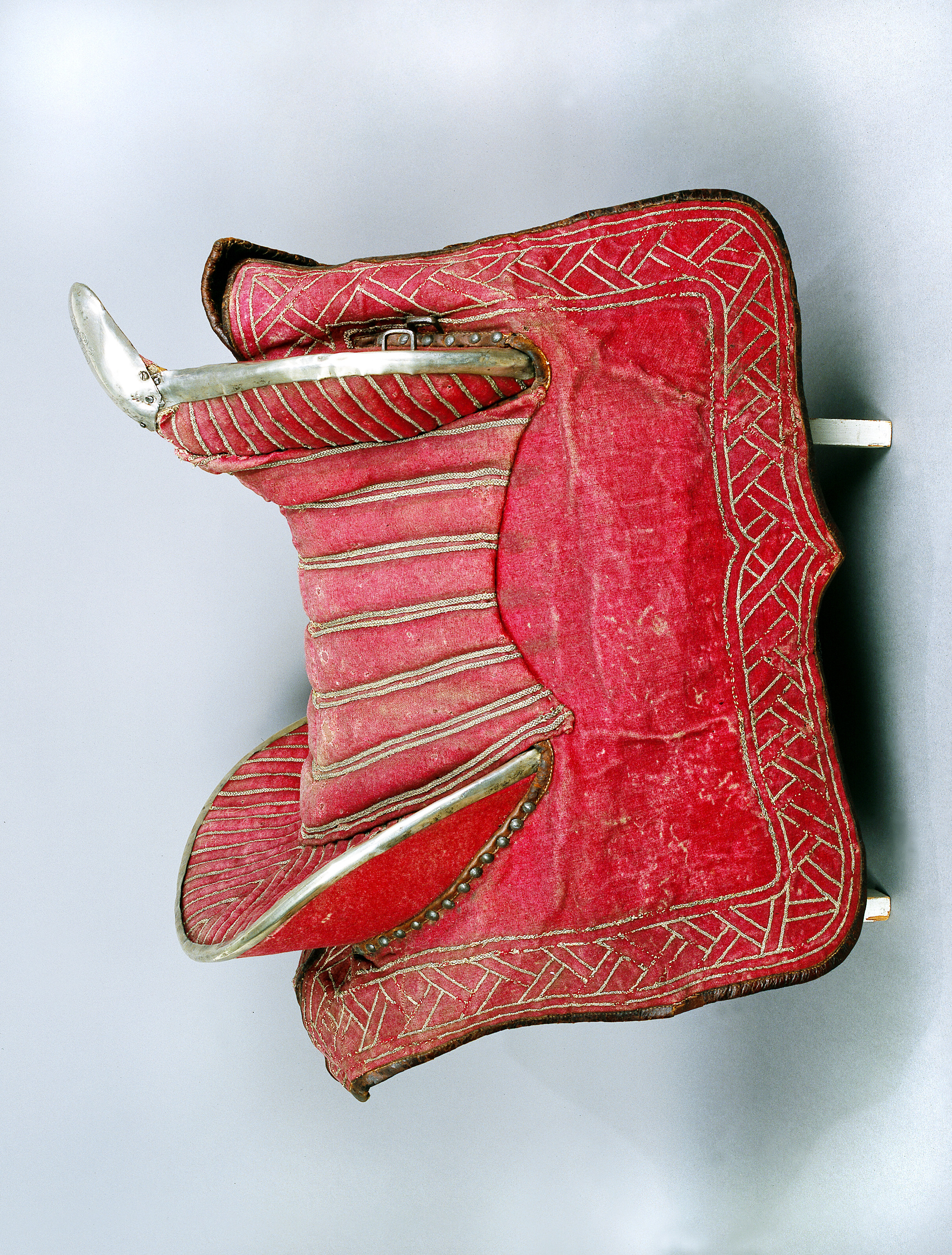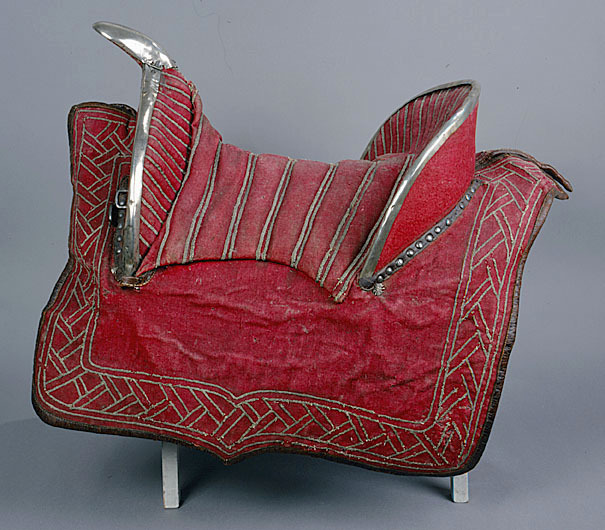 Sadel av karmosinrött kläde med rektangulära kappor kantade och fodrade med brunt läder. Sits och kappor broderade med silvertråd. Sitsen med dubbla bårder av flätad silvertråd. utmed kappans kanter en bred bård med glest broderi av smal flätad silvertråd i dubbla sektioner vinkelräta mot varandra bildande ett sick-sack mönster. Frambom 90 mm hög med sadelknapp klädd med silverplåt, framåt utdragen rundad och med plan undersida. På knappen ett graverat heraldiskt vapen och initialerna: " BB " och " DI ". Bakbommen välvd 125 mm hög. Båda bommarna med insidor med lodräta bårder av flätade silvertrådar samt med kantskoning av silverplåt. Framför frambommen 6 + 6 ståltännlikor, bakom bakbommen 13 + 11 likadana tännlikor. Framtill dubbla rektangulära byglar för hölster. Bom av trä klädd med väv och näver med rektangulära hål för stigläder samt smala vita läderremmar för fastknytande av bossa (denna saknas). Framtill söljor av stål för förbygel samt läderögla.