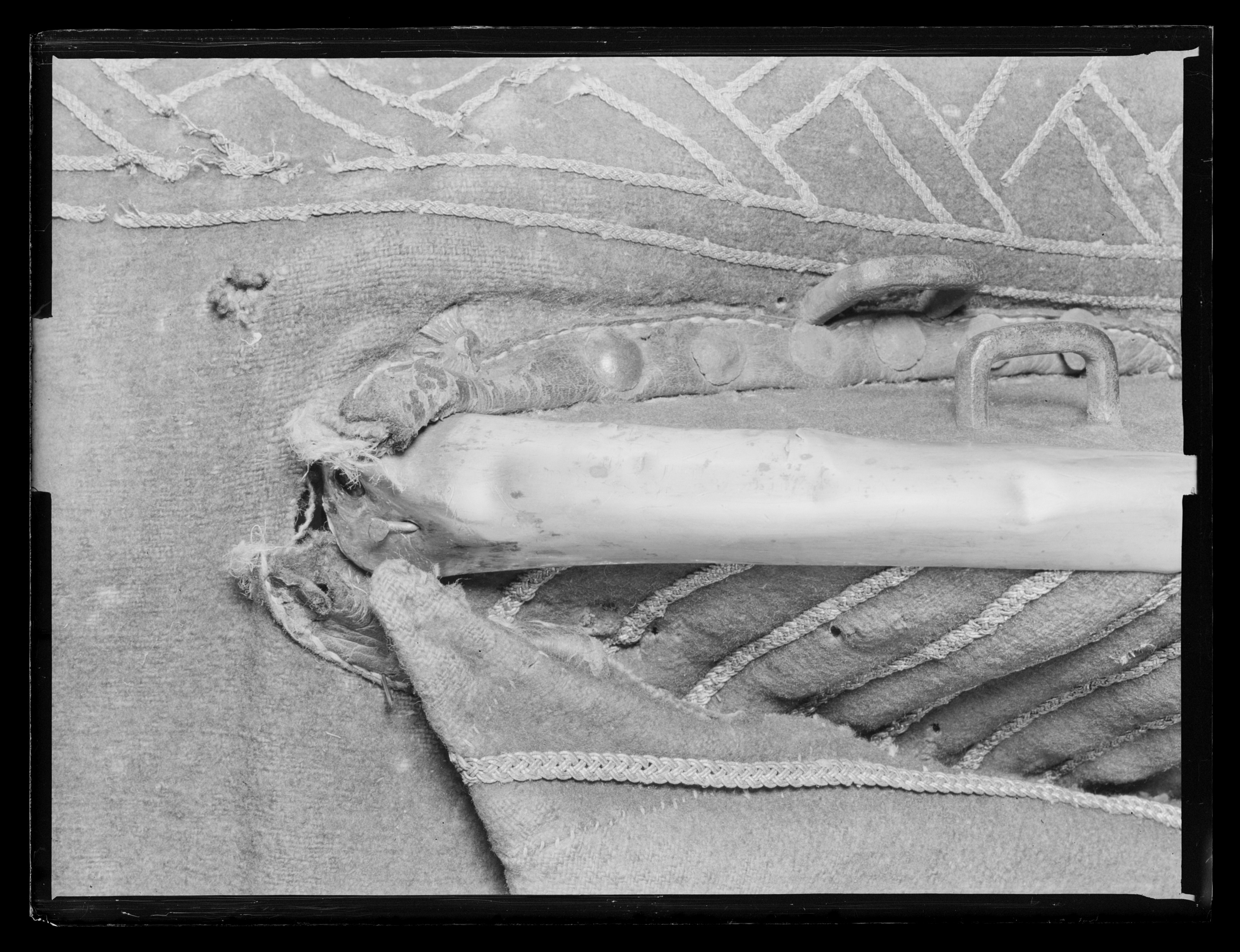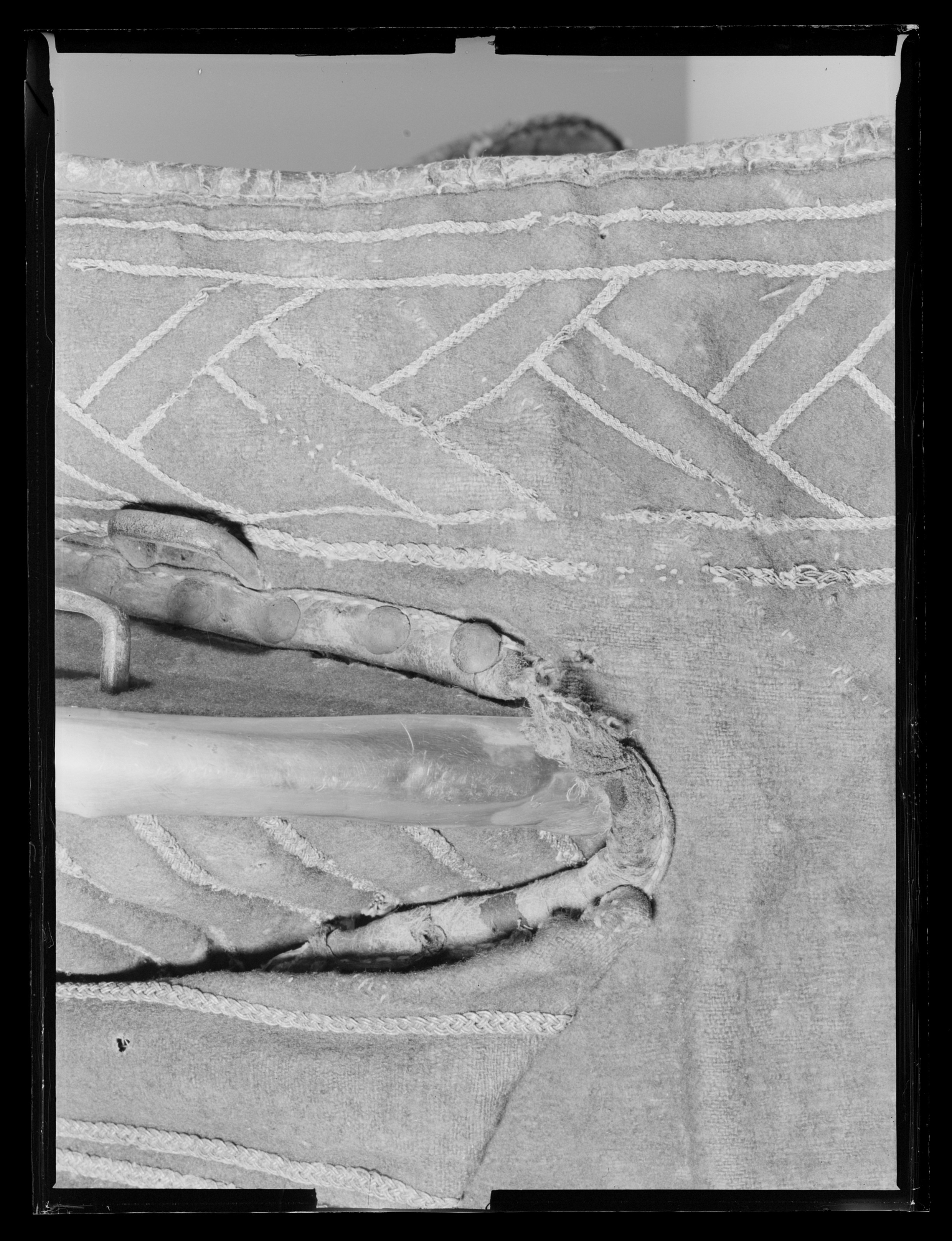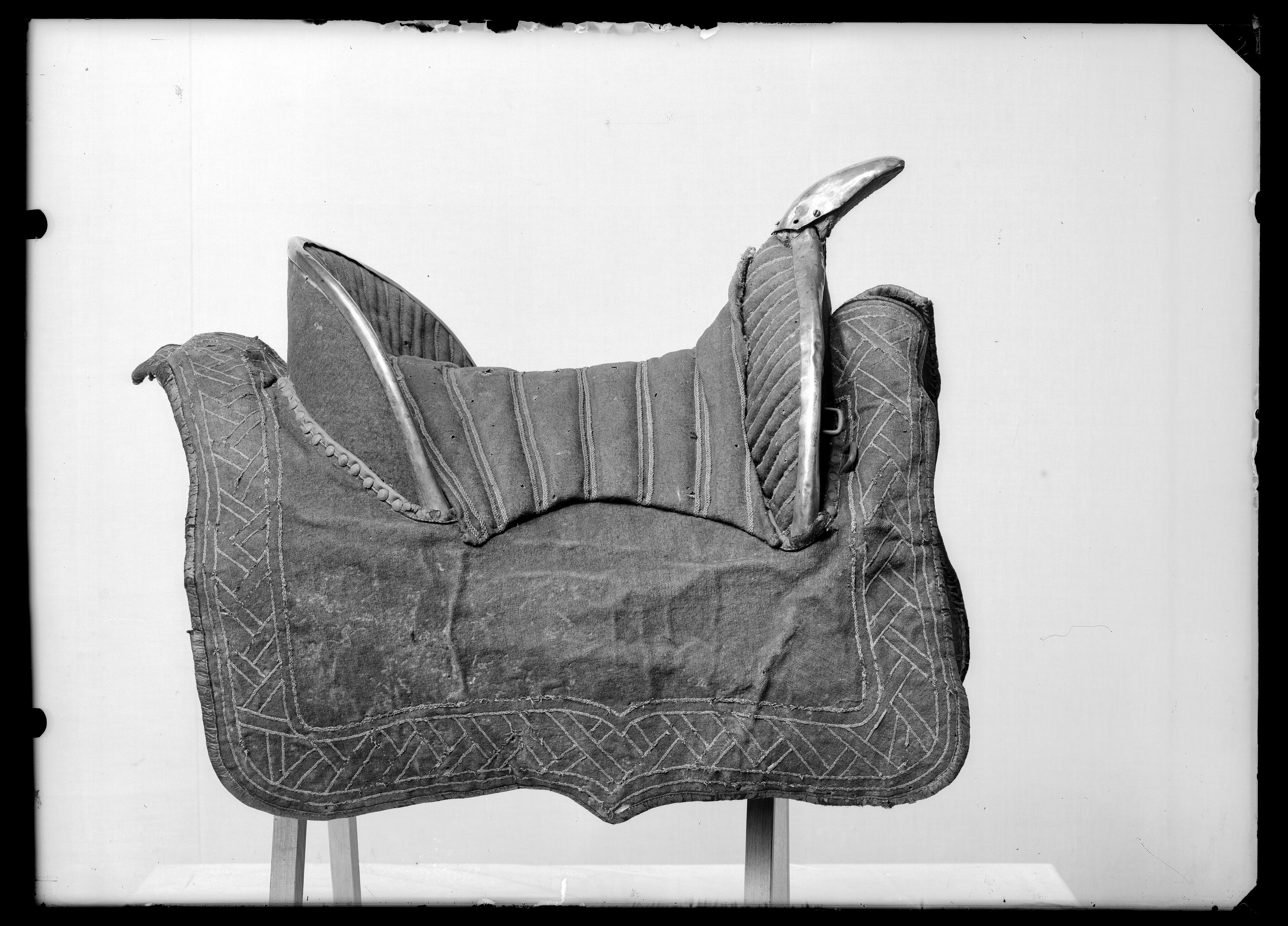 Sadel av karmosinrött kläde med rektangulära kappor kantade och fodrade med brunt läder. Sits och kappor broderade med silvertråd. Sitsen med dubbla bårder av flätad silvertråd. utmed kappans kanter en bred bård med glest broderi av smal flätad silvertråd i dubbla sektioner vinkelräta mot varandra bildande ett sick-sack mönster. Frambom 90 mm hög med sadelknapp klädd med silverplåt, framåt utdragen rundad och med plan undersida. På knappen ett graverat heraldiskt vapen och initialerna: " BB " och " DI ". Bakbommen välvd 125 mm hög. Båda bommarna med insidor med lodräta bårder av flätade silvertrådar samt med kantskoning av silverplåt. Framför frambommen 6 + 6 ståltännlikor, bakom bakbommen 13 + 11 likadana tännlikor. Framtill dubbla rektangulära byglar för hölster. Bom av trä klädd med väv och näver med rektangulära hål för stigläder samt smala vita läderremmar för fastknytande av bossa (denna saknas). Framtill söljor av stål för förbygel samt läderögla.