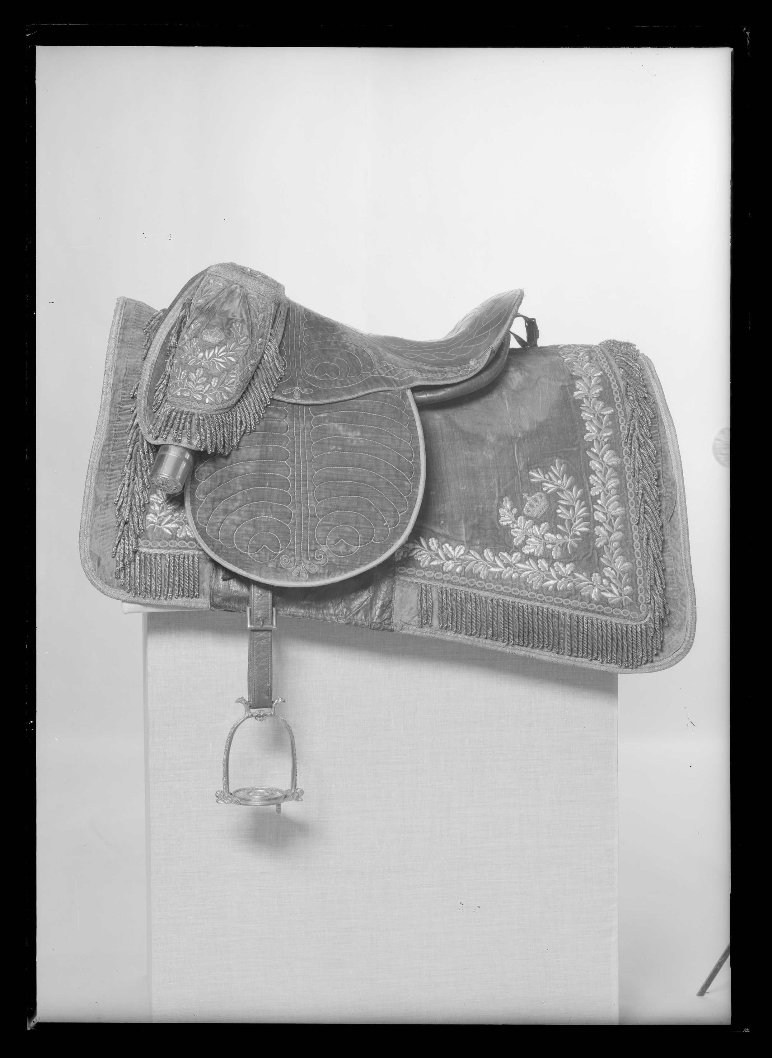 Engelsk sadel röd. Använd av Karl XIV Johan i samband med kröningen i Stockholm 1818-05-11.