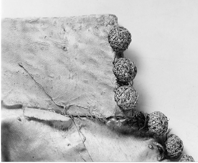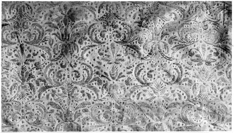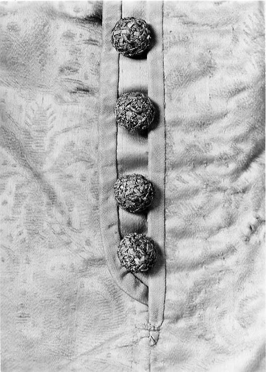 Byxorna är av rak modell och består av 4 stycken som sytts samman i sidorna, fram och bak. Höjden i sidan är 60 cm. Byxorna är svagt rynkade vid den 123 cm långa linningen (som är skarvad av 3 bitar). I sidsömmarna där staden är har man upptill lämnat 23 cm som utgör sprund för de stora ficksäckarna. Framtill har en ca 30 cm lång knäppslå sytts fast vid det 36 cm långa sprundet. Slån är försedd med 12 st knapphål (2,5 cm långa, sydda med c:a 8 stygn/cm med vitt, högertvinnat silke över 1 tråd). På högra framstycket sitter ca 18 cm från framkanten en mindre vertikalt inskuren ficka. En liten urficka finns i fodret under linningen på vänster framstycke. Byxorna knäppas på linningen med 2 st större knappar (d: 2,1 cm) som är överklädda med silvertråd. Knapphålen här är 5 cm långa (sydda med 9 stygn/cm). Alla 12 små (d: 1,2 cm) knappar sitter kvar framtill och de är också silvertrådsklädda. Linningen är sydd på motsatt led av tyget och har stadkanten invikt nedtill. Ingen av de 8 hakarna finns kvar, man kan blott urskilja deras ursprungliga placering. Byxorna är som helhet sydda av samma mönstrade atlas som utgör kappans och tröjans tyg. Dock är linningen och knäppslån fram sydda av omönstrad vit atlas. Ficksäckarna har stofferats med vit taft (59x56 tr/cm2) på de bitar som kunna tänkas bli synliga, d.v.s. övre delen av linnesäcken är på insidan fodrad med 3 påsydda taftbitar (som sytts fast på linnefodret innan dessa bitar sytts samman). Som styrsel i fickkanterna har man stoppat papper. Ficksprunden och knäppslån är skodda med smalt vitt ripsband. Som foder på insidan har man begagnat sig av blekt linnelärft (31x30 tr/cm2). Fodret har blott sömmar framtill och baktill. Fodrets bredd (104 cm) räcker runt benet. Höjden är i benet (ev. lärftens bredd?) ca 75 cm. Inga extra kilar har behövts sättas i grenen.Linnefodret går upp i linningen och är lagt i veck (åt höger hela vägen) för att erhålla passform. Man har gjort sig den mödan att i linningen fodra det lilla stycket mitt fram vid knapphålen med vit taft. Vit taft (49x45 tr/cm2) utgör också den 4-4,5 cm breda skoningen nertill vid byxbenen. I höger ben består denna av 2 bitar, i vänster av 3. Mellan linnefodret och atlasen ligger nertill vid byxbenen en c:a 4,5 cm bred remsa av grövre linnelärft (16x13 tr/cm2). Mellanfoder saknas. Byxornas mönster är avpassat efter plaggets form, sålunda är de t.ex. avslutade med en horisontell bård nertill och en vertikal i sidorna. Som man fortfarande kan skönja har byxorna ursprungligen upptill garnerats med 14 bandrosetter (14 st "Sölfr. Favors band, framuti roser häftat") 7 på varje sida. Dessa har dock liksom silverspetsarna tagits bort. Byxorna är mycket illa medfarna och har en mängd hål. På vänstra sidan, strax under linningen framtill finns ett urbränt hål. Ungefärlig tygåtgång av atlas av 53 cm bredd: Tröja och byxor tillsammans: ca 5,40 meter. Kappa (inkl. foder): ca 13,20 meter.