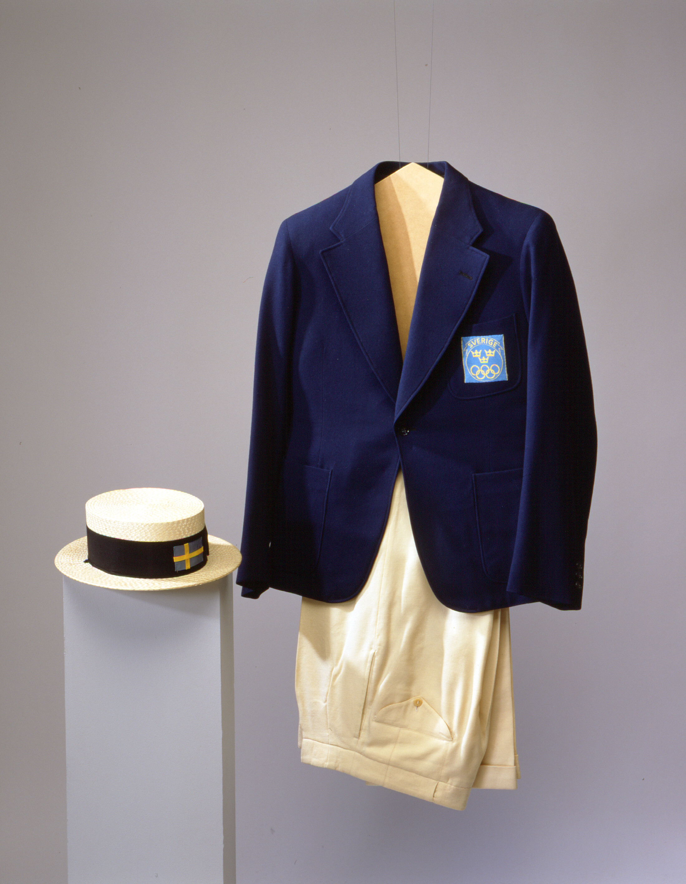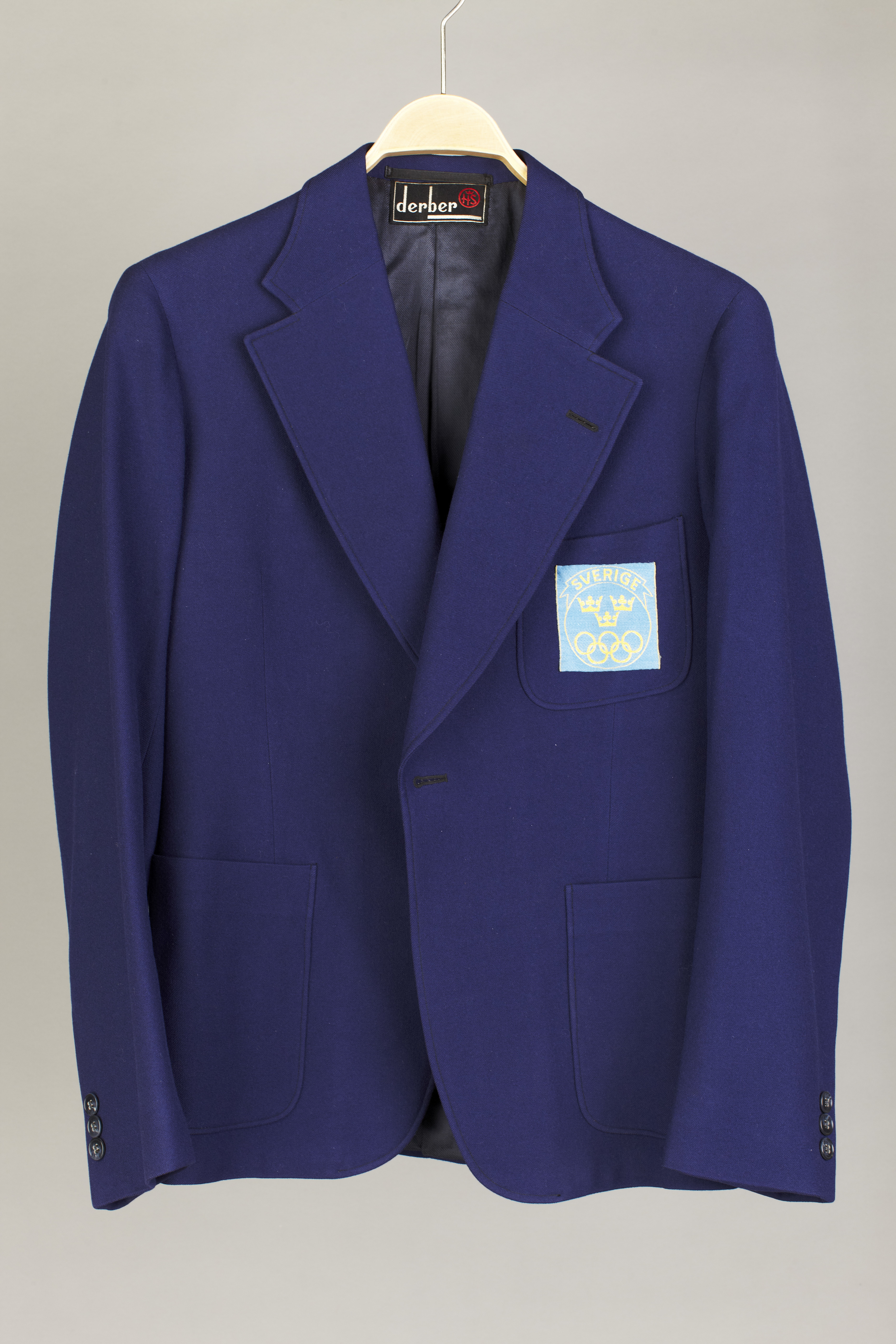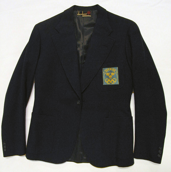 Kavaj av marinblå ylle, figursydd, enkelknäppt, med fällkrage, fodrad. Delad rygg. Smala våder i sidorna gör kavajen insvängd. Enkelknäppt med endast en knapp av spräckligt, blått plastmaterial, diam: 19 mm. Fällkrage samt långa, breda slag. I vänster slag ett knapphål. Kragens baksida fodrad med mörkblå flanell. Raka axlar med påsydda ärmar. Ärmarna utan slag och sprund men med tre knappar vardera, diam: 15 mm. Kavajen saknar sprund bak. Stolpfickor utan lock, påsydda, samt på vänster sida en bröstficka av samma typ. På bröstfickan emblem i ljusblått med i gult ordet " SVERIGE " samt därunder tre kronor och under dessa de olympiska ringarna. Foder av blå yllediagonal, samt i ärmarna vitt sidenfoder med ränder i grupper om fyra ränder i varje. Två innerfickor vilka förslutes med knappar av samma typ som ovan, diam: 15 mm. I kragen hälla samt etikett med tillverkarens namn: " derber" samt inom en cirkel H S under en krona.