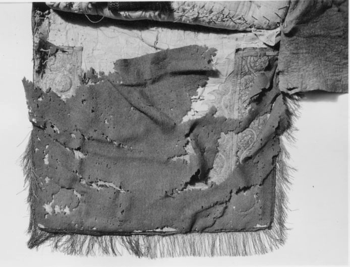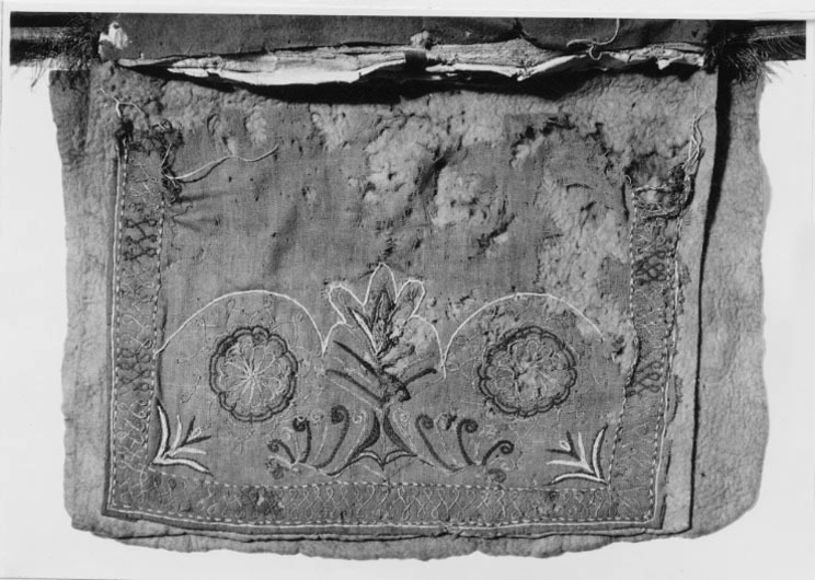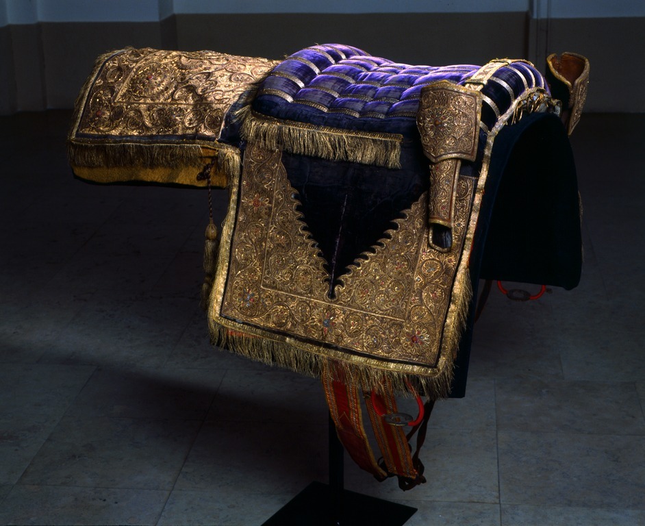 Sadel bestående av stoppad sits med svagt välvda bommar klädd med mörkt blåviolett sammet samt längsgående fastsydda band av vävd guldtråd. På frambommen tre söljor av samma material. Rektangulära kappor klädda med blå sammet samt utom ett triangulärt fält på mitten med yttäckande broderi med guldtråd och blå, röda och guldpaljetter i form av rankor och blommor. Fodrade med rött tuskaftat ylle samt ett löst foder av läder. Bakom sadeln vidhängande ryggstycke av samma utförande som kapporna. Kapporna och sitsen kantade med guldfrans. Bossor klädda med naturfärgat linne med djuphäftning.