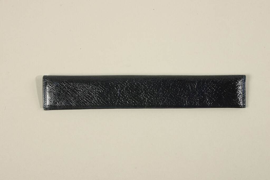 Kamfodral av mörkblått läder som viks dubbelt. Inuti fodrad med blå sidenripstyg. Uppdelad i två fack.