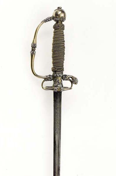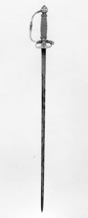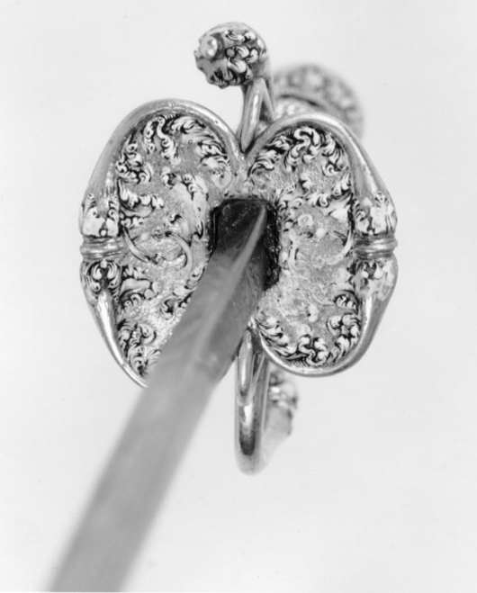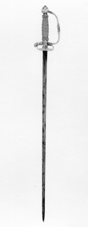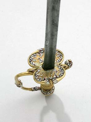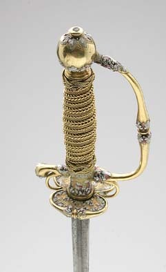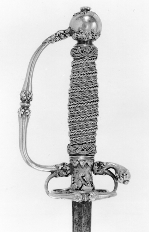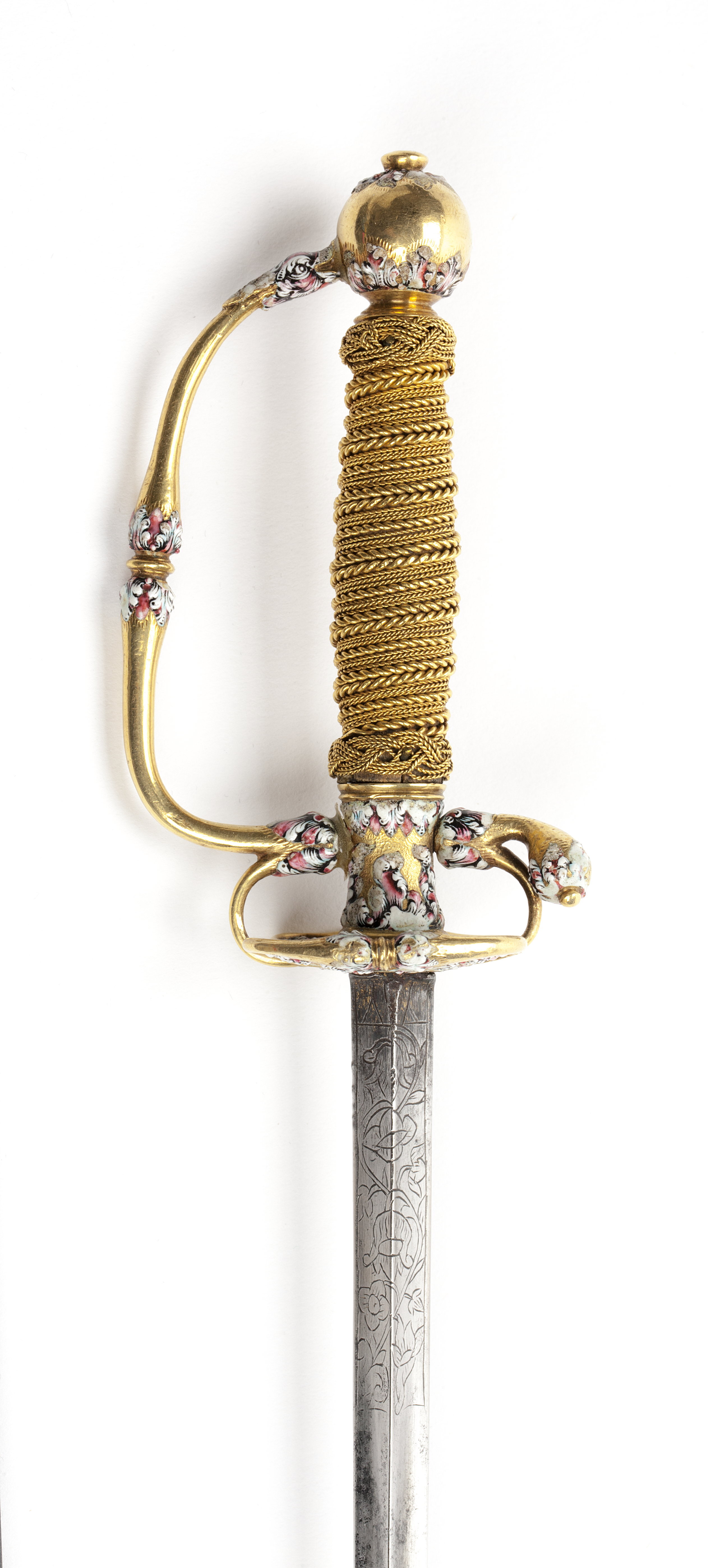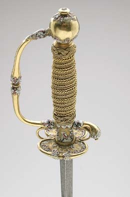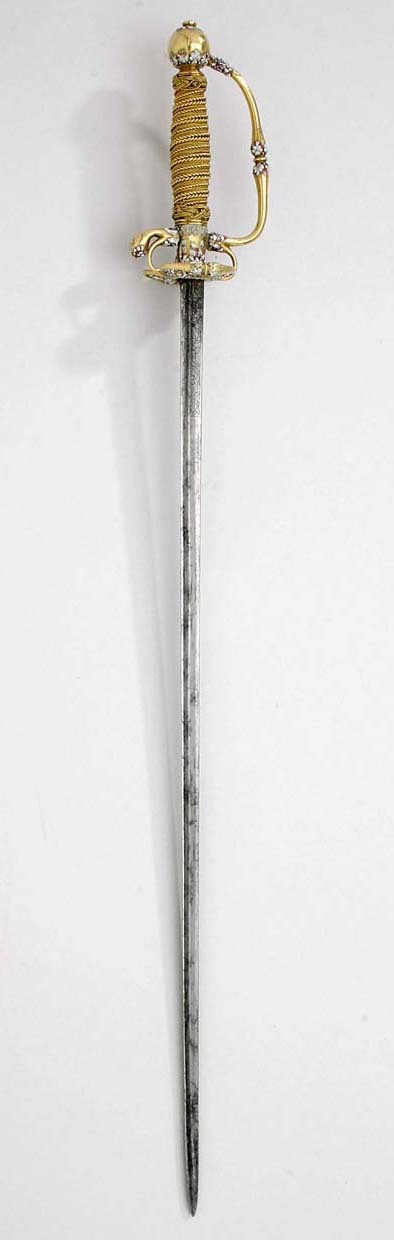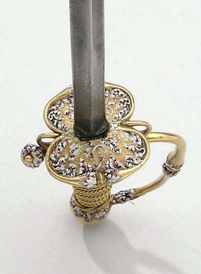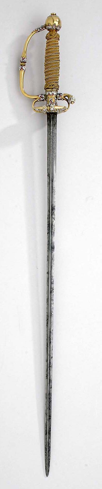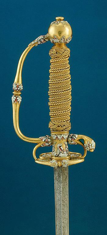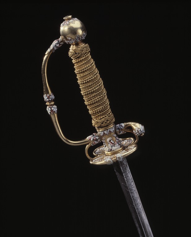 Fäste av guld med dekor av vit, röd och svart emalj. Kulformig knapp med rund, låg nitknapp. Knappen dekorerad med kransar av emaljblad upptill och nedtill. Handbygel intappad i knappen och där formad till ett djurhuvud av emalj. Handbygeln övergående i bakre parerstång, kort nedåt-utåtböjd med droppformig ytterände med emaljdekor i likhet med knappens. Släta, bågformiga fingerbyglar. Njurformiga parerplåtar, den yttre obetydligt större med bladdekor av emalj utmed kanterna, vilka är släta och förstärkta. På plåtarnas ut- och insida spegelmonogram C av vit emalj. På parerplåtarnas kanter två motställda ansvällningar med emaljdekor i likhet med den på handbygelns mitt. Krysset med något insvängt mittparti. Kavel med lindning av tjockare och tunnare guldtråd, två tjockare och mellan dem tre tunnare. Lindningen upptill och nedtill avslutad med en flätad krans av tunn, tvinnad guldtråd. Klinga rak, treeggad, s.k. stukatklinga med etsad ornering från basen intill 50 mm. Närmast basen ett litet, rektangulärt fält, förgyllt med bladornament. Orneringen i övrigt i form av en blomranka med stiliserade blommor, bl.a. tulpaner, orneringen tvärt avslutad.