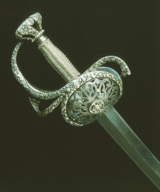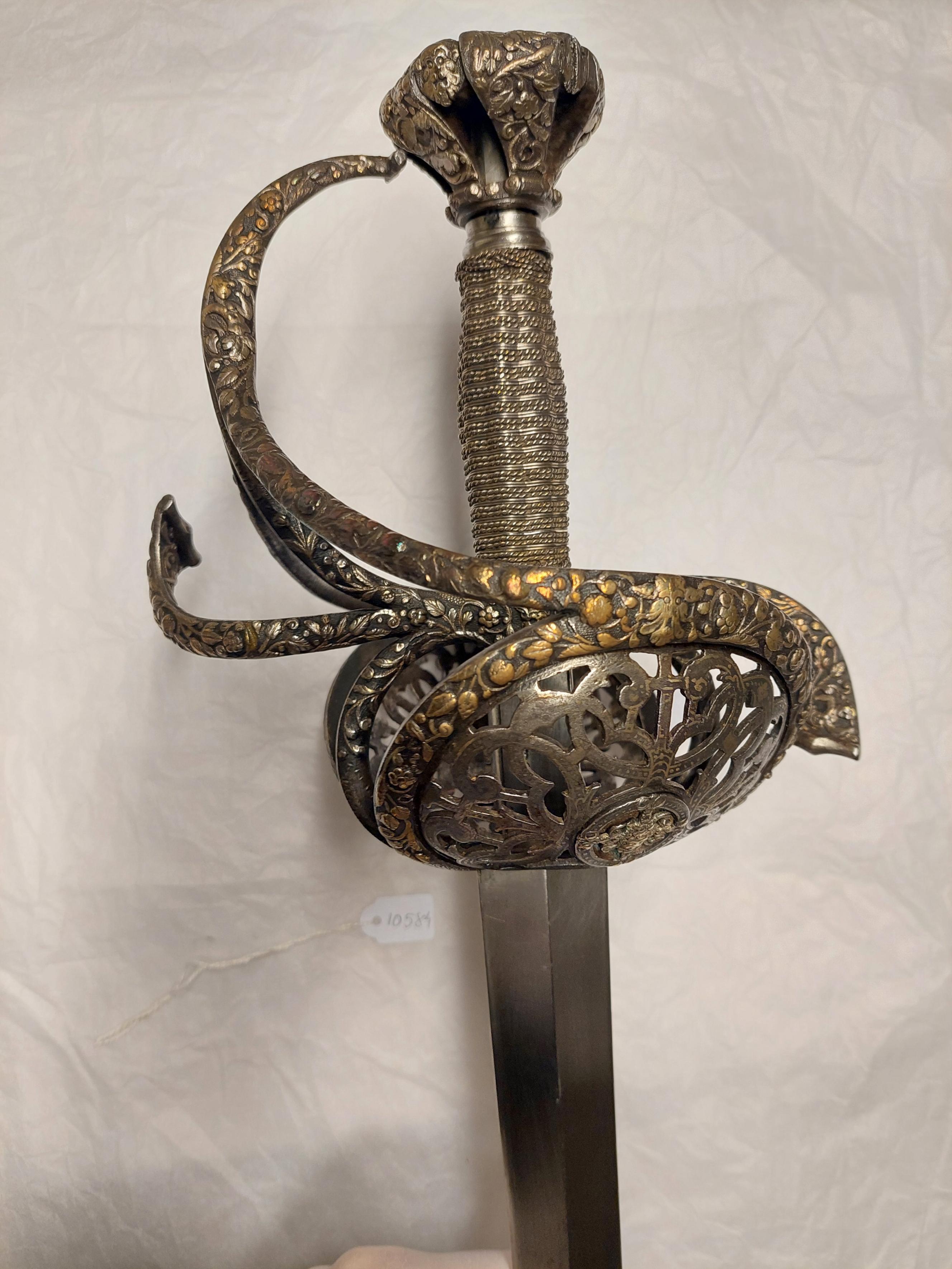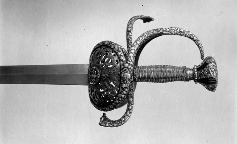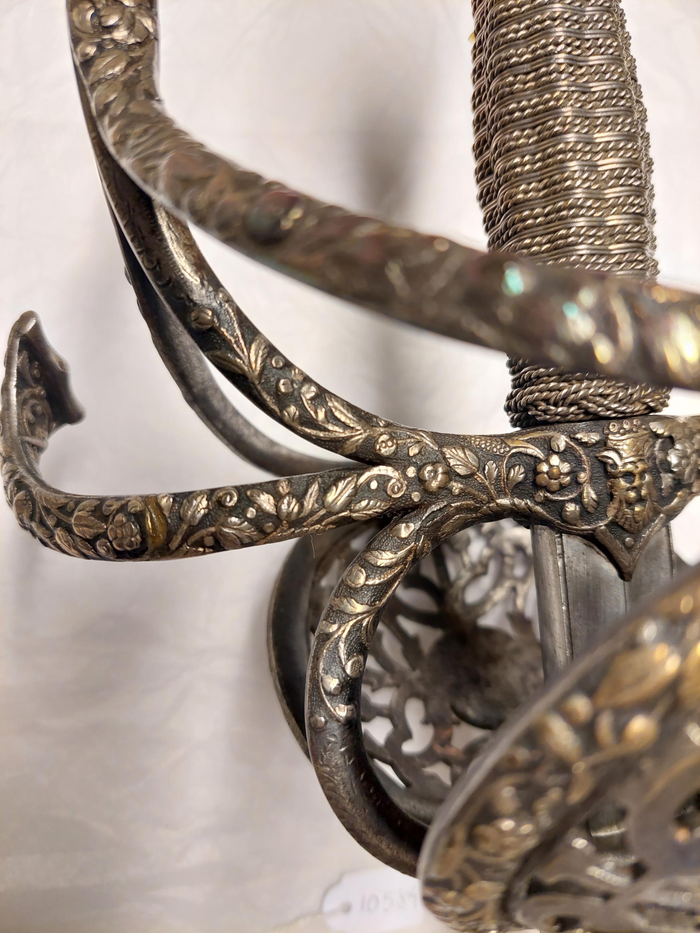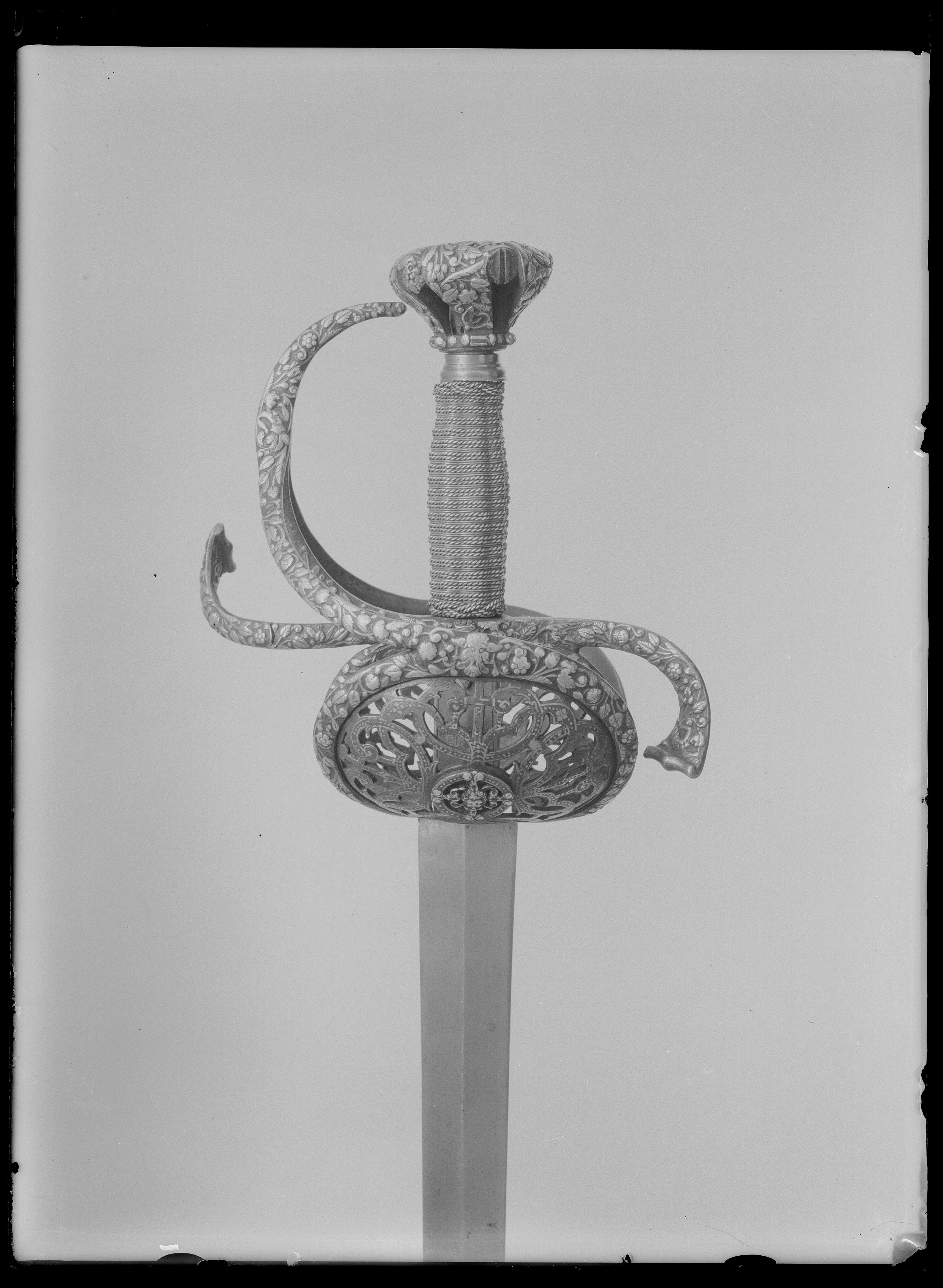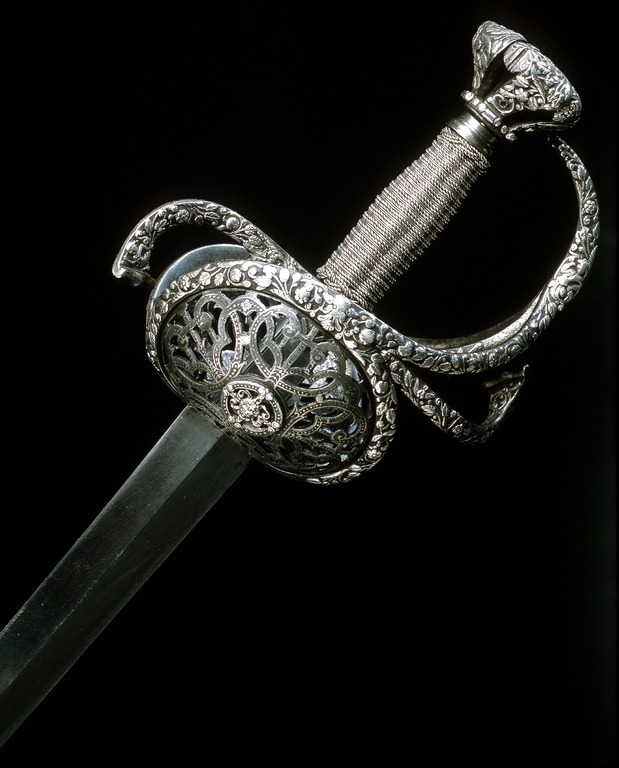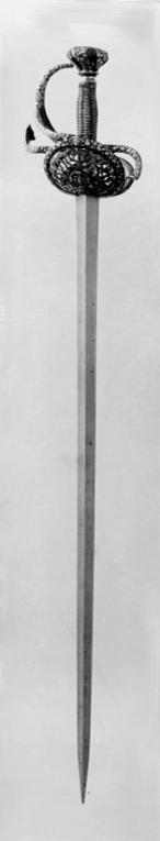 Fäste av delvis genombrutet stål med hela ytan täckande ornering av små maskaroner, omgivna av blad-och blomornament i påslaget, snidat silver. Knapp omvänt päronformig, tryckt. Den platta överdelen övergår nedåt i fem åtskilda, insvängda delar. Vid niten en femsidig, slät platta av stål. Parerstänger kraftiga, platta, den främre böjd uppåt - inåt, den bakre nedåt - utåt. Pareranordningen i övrigt symmetrisk, bestående av bågformig handbygel, höga, platta fingerbyglar och ovala, snett uppåt-utåtriktade, bukiga parerplåtar med genombruten bandornering. På ut- och insidan en från handbygelns mitt till parerplåtarnas övre kant gående sidobygel. Kavelns stomme vertikalräfflad och lindad med omväxlande tvinnad och slät silvertråd, upptill och nedtill en flätad krans av tvinnad silvertråd. Mellan den övre kransen och knappen en profilerad, slät hylsa av stål. Klinga rak, tvåeggad, slipad med två jämnbreda skär, markerat spetsig udd och ca 50 mm lång ricasso. Utan ornering. På vardera sidan av ricasson inslaget en klingsmedsstämpel, "sittande kung" med svärd (LRK vägl. 1921:17), Jacob Brach, Solingen.