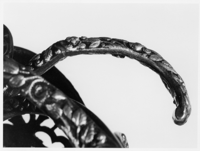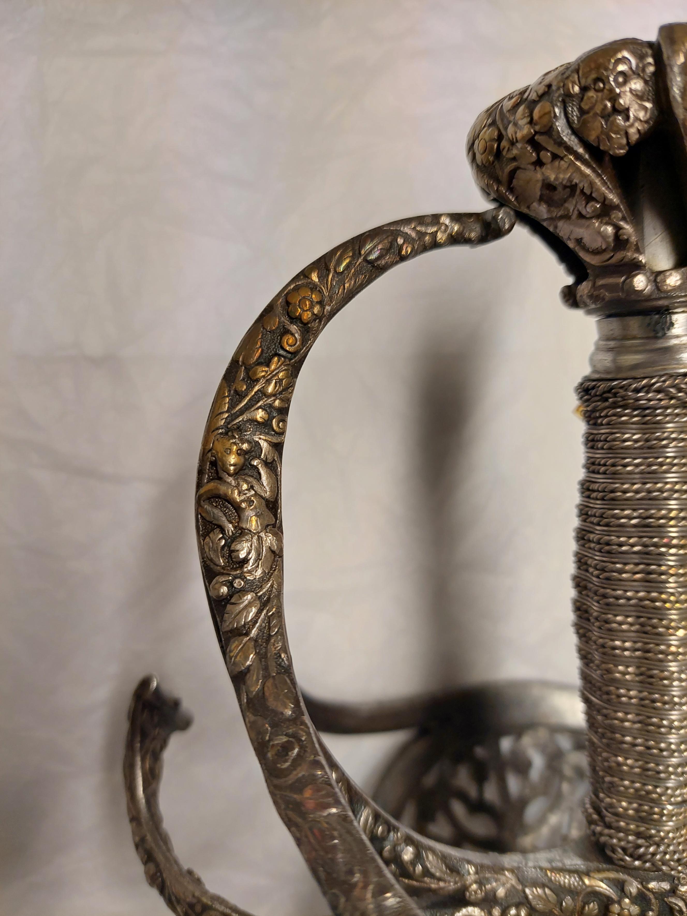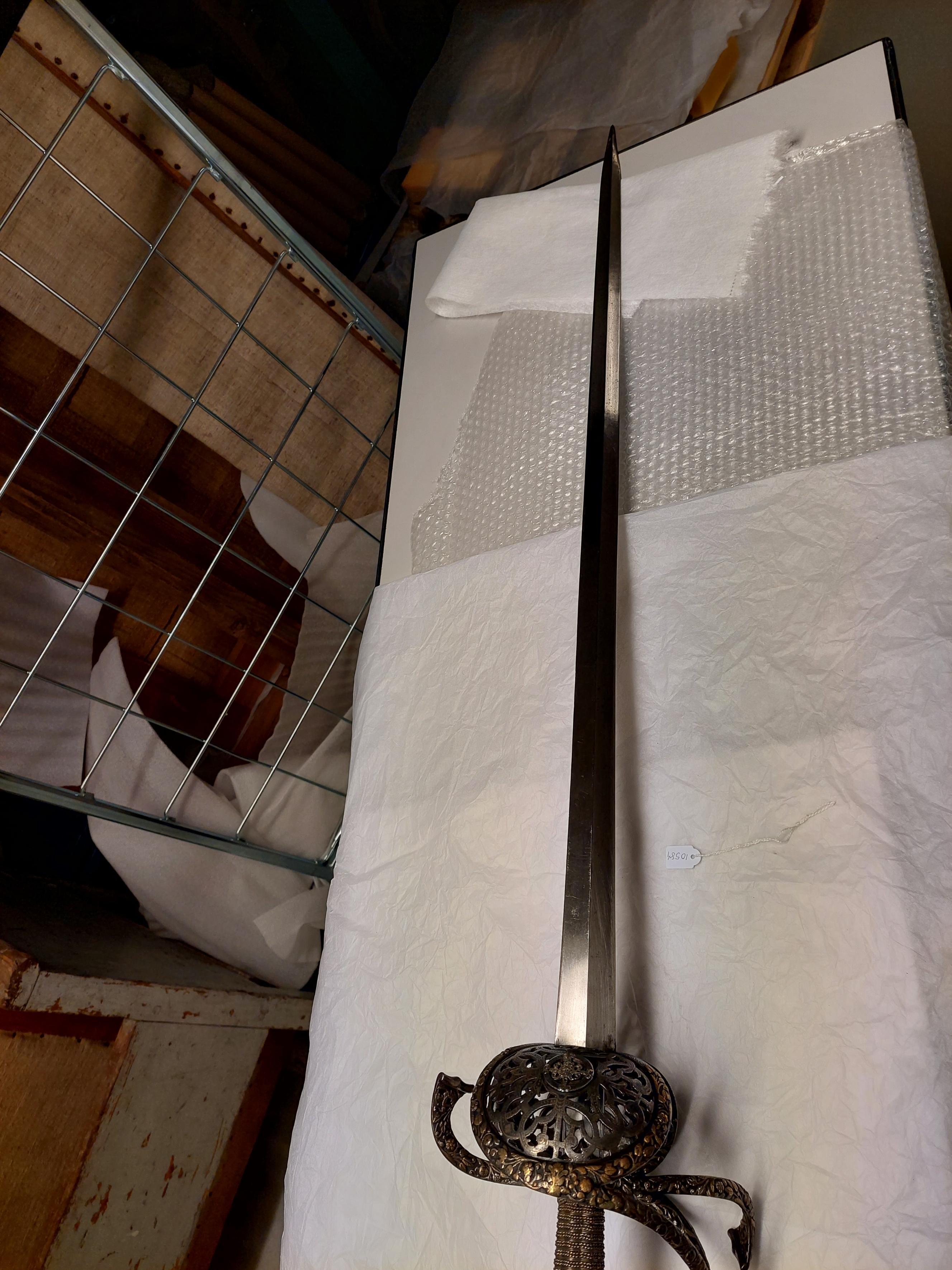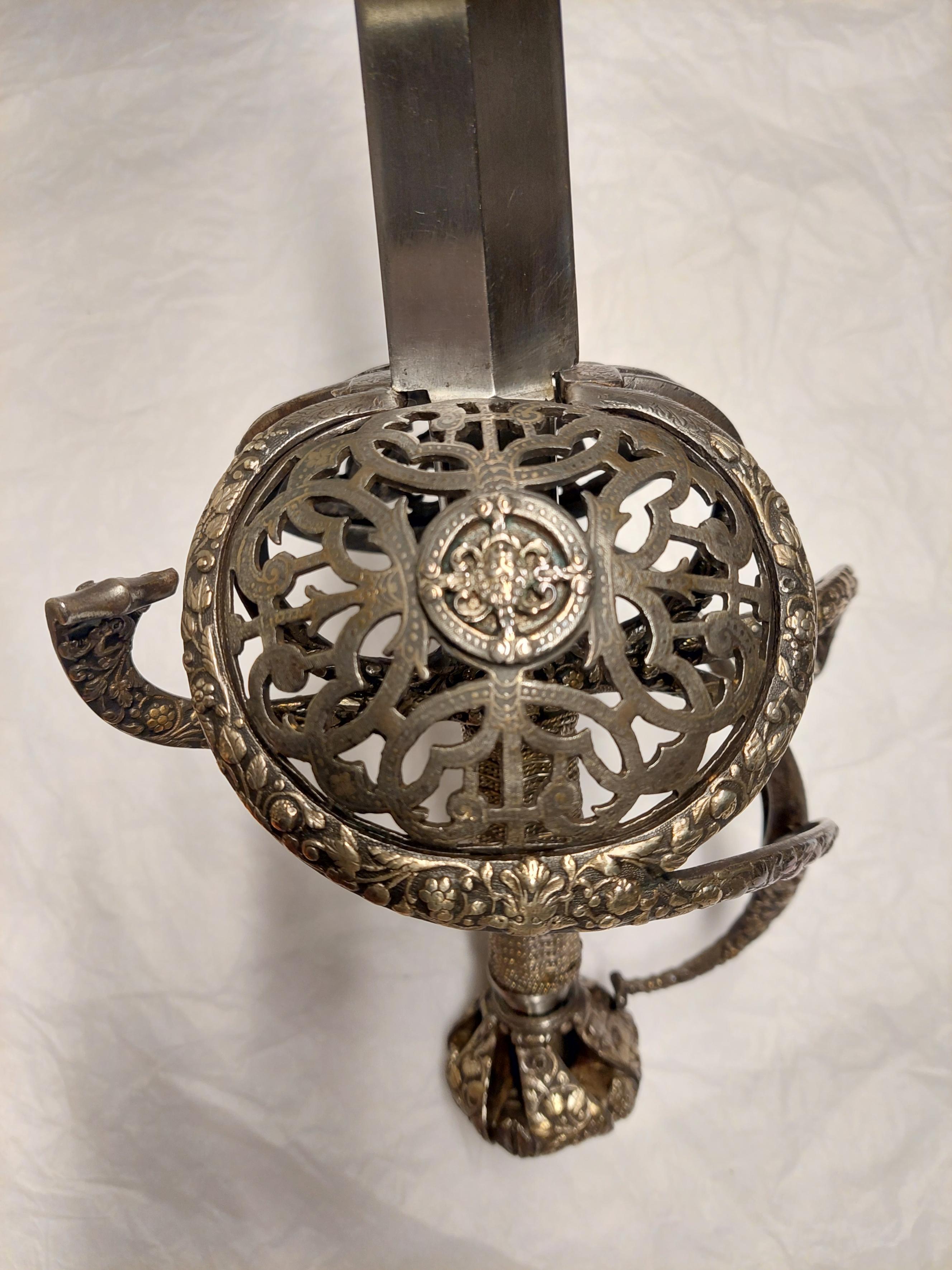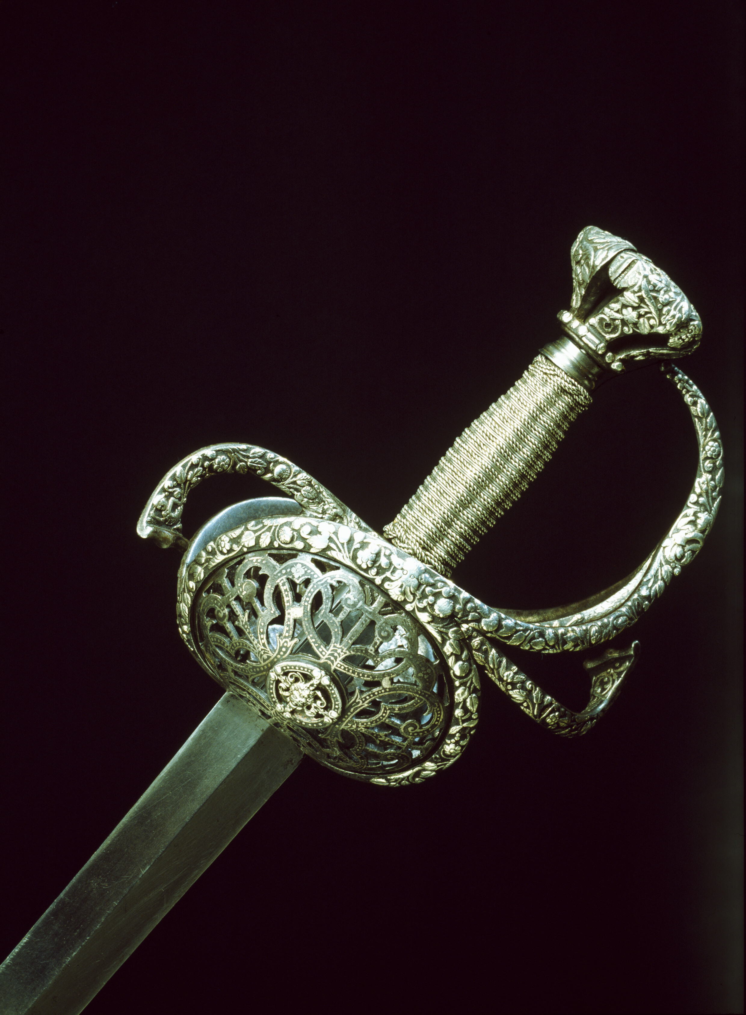 Fäste av delvis genombrutet stål med hela ytan täckande ornering av små maskaroner, omgivna av blad-och blomornament i påslaget, snidat silver. Knapp omvänt päronformig, tryckt. Den platta överdelen övergår nedåt i fem åtskilda, insvängda delar. Vid niten en femsidig, slät platta av stål. Parerstänger kraftiga, platta, den främre böjd uppåt - inåt, den bakre nedåt - utåt. Pareranordningen i övrigt symmetrisk, bestående av bågformig handbygel, höga, platta fingerbyglar och ovala, snett uppåt-utåtriktade, bukiga parerplåtar med genombruten bandornering. På ut- och insidan en från handbygelns mitt till parerplåtarnas övre kant gående sidobygel. Kavelns stomme vertikalräfflad och lindad med omväxlande tvinnad och slät silvertråd, upptill och nedtill en flätad krans av tvinnad silvertråd. Mellan den övre kransen och knappen en profilerad, slät hylsa av stål. Klinga rak, tvåeggad, slipad med två jämnbreda skär, markerat spetsig udd och ca 50 mm lång ricasso. Utan ornering. På vardera sidan av ricasson inslaget en klingsmedsstämpel, "sittande kung" med svärd (LRK vägl. 1921:17), Jacob Brach, Solingen.