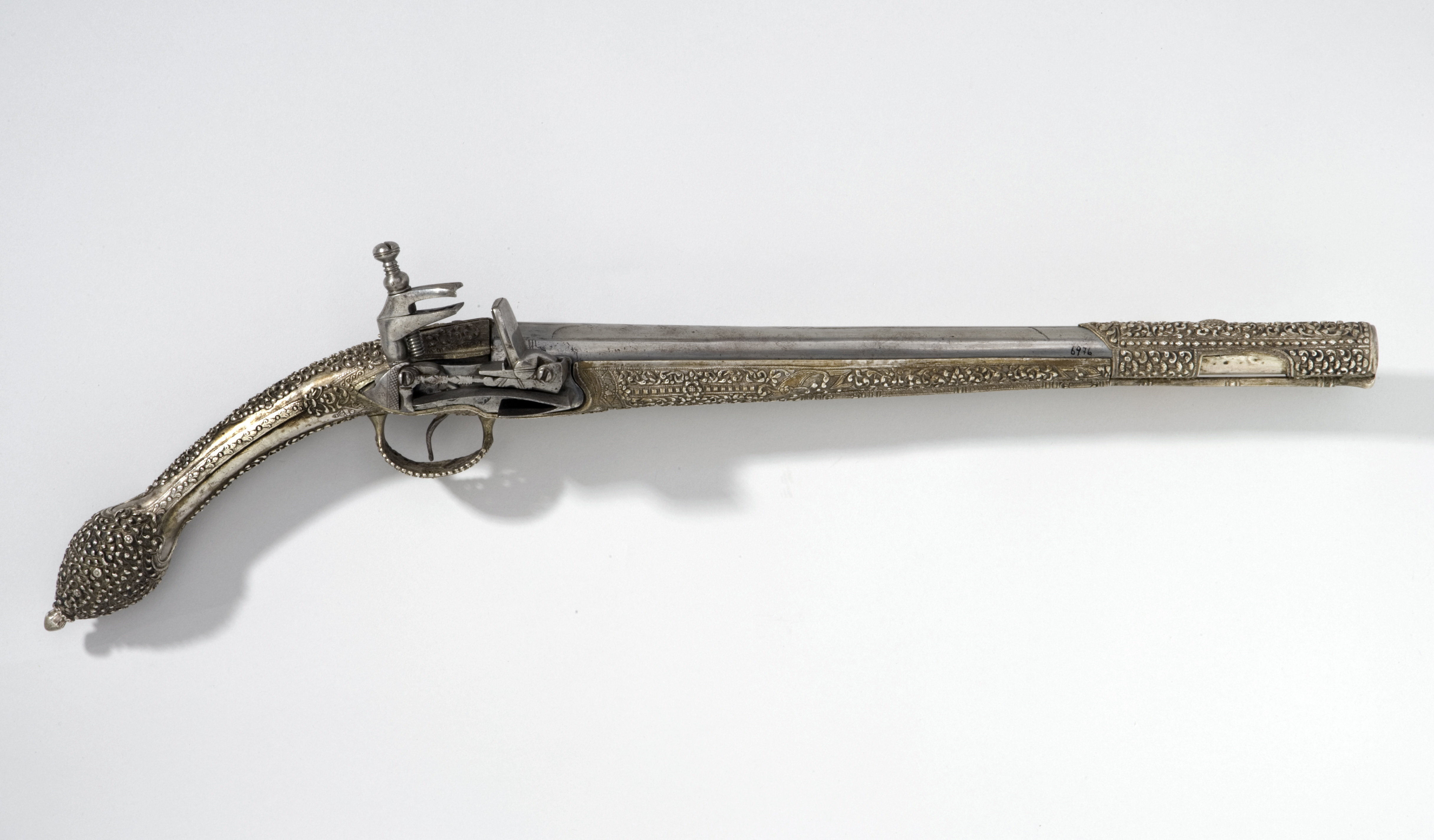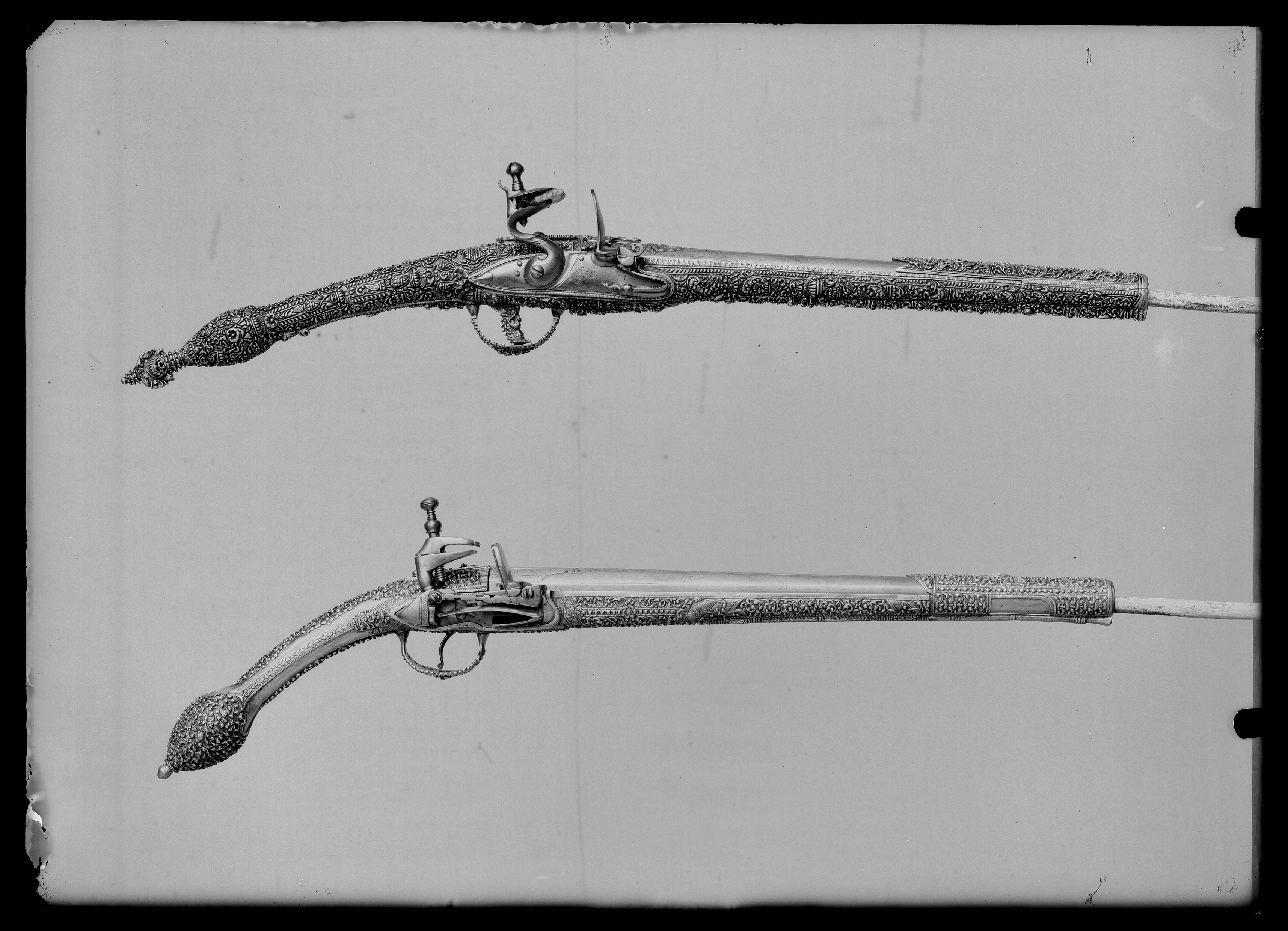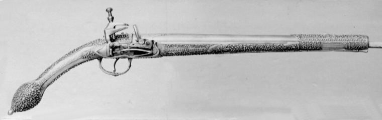 Pipa av stål, slätborrad, rund med svagt åttkantigt kammarstycke och svag trumf. På kammarens undersida otydliga stämplar, på ovansidan enkla graverade rankor (hårt nötta) samt en ribba, avslutad ett stycke från mynningen. På ribban otydlig text: "ILSLAII" (?). Svansskruvblecket täckt med tunn platta av silverlegering med rankdekor i högrelief. Riktmedel: Spolformigt korn på pipbandet. Snapplås, alla Catalana med hög profilerad käkskruv. Stock av trä överklädd med tunn plåt av silverlegering med yttäckande ornering av rankor i driven och graverad hög relief. Smal kolv, svagt nedåtböjd och utdraget oval kolvkula. Runt främre delen av pipan ett 114 mm brett pipband av samma material som övriga stocken, på ovansidan med ett spolformigt stolpkorn och bakåt spetsigt utdraget. Varbygel av silver. Tillbehör: Laddstock av silver