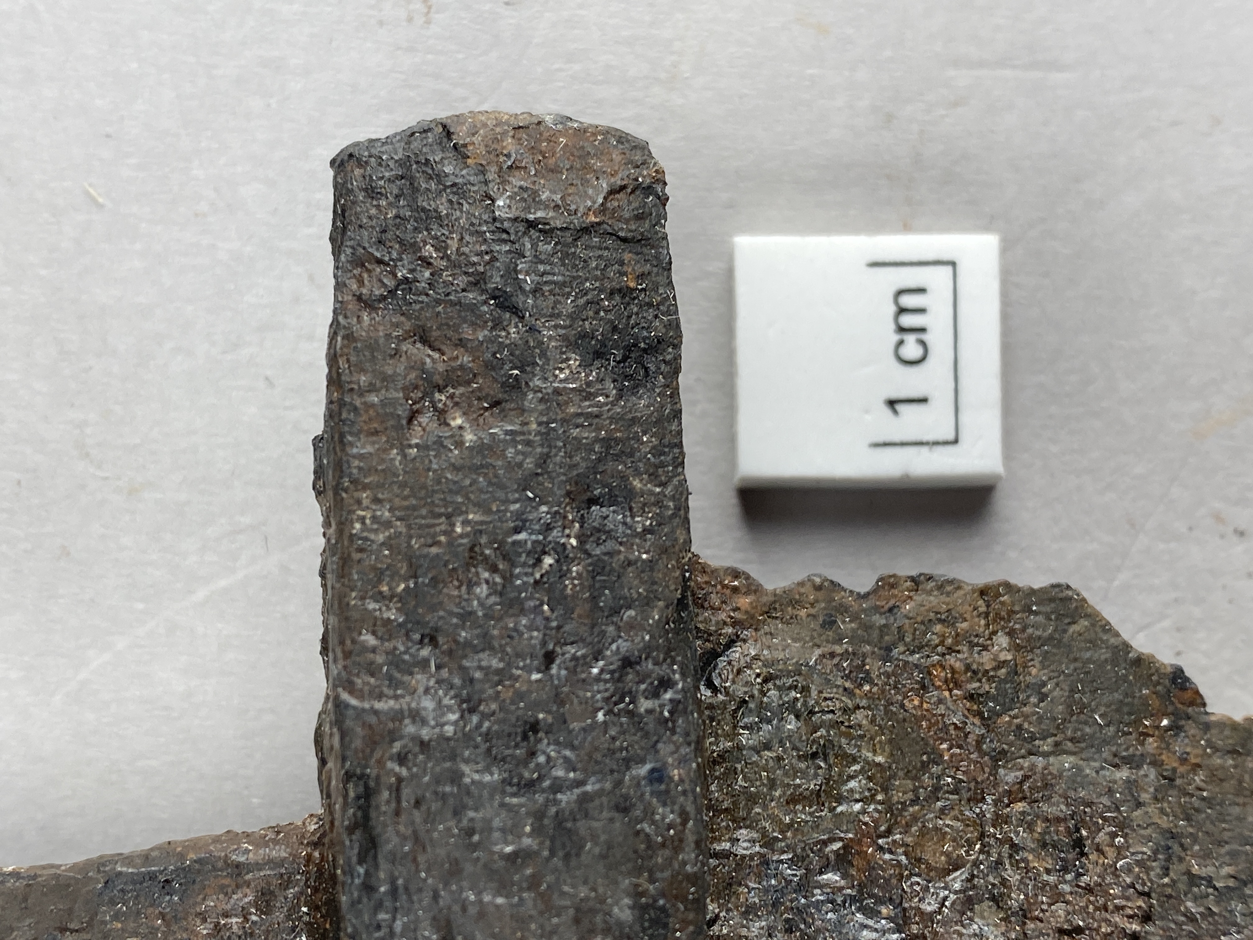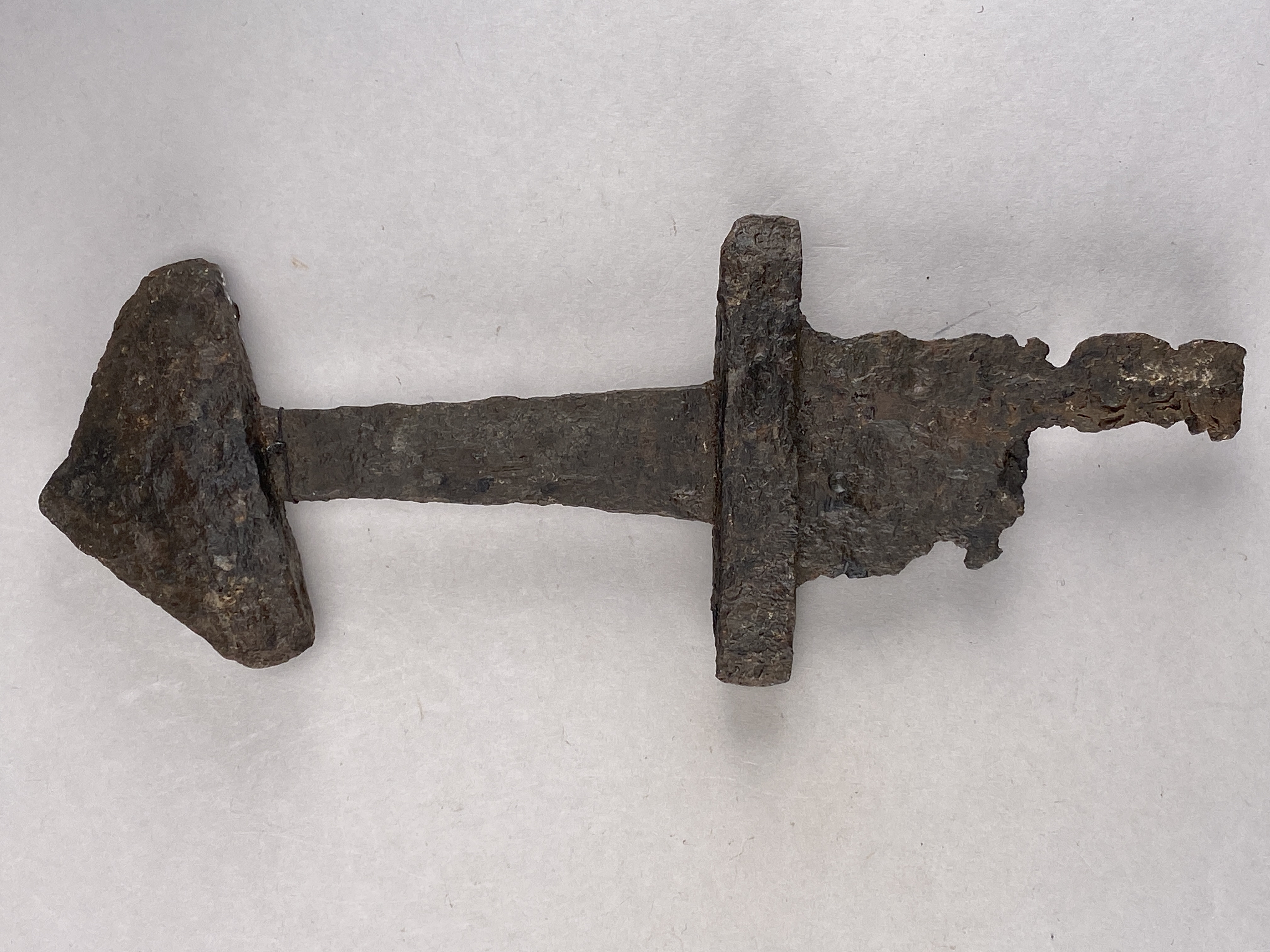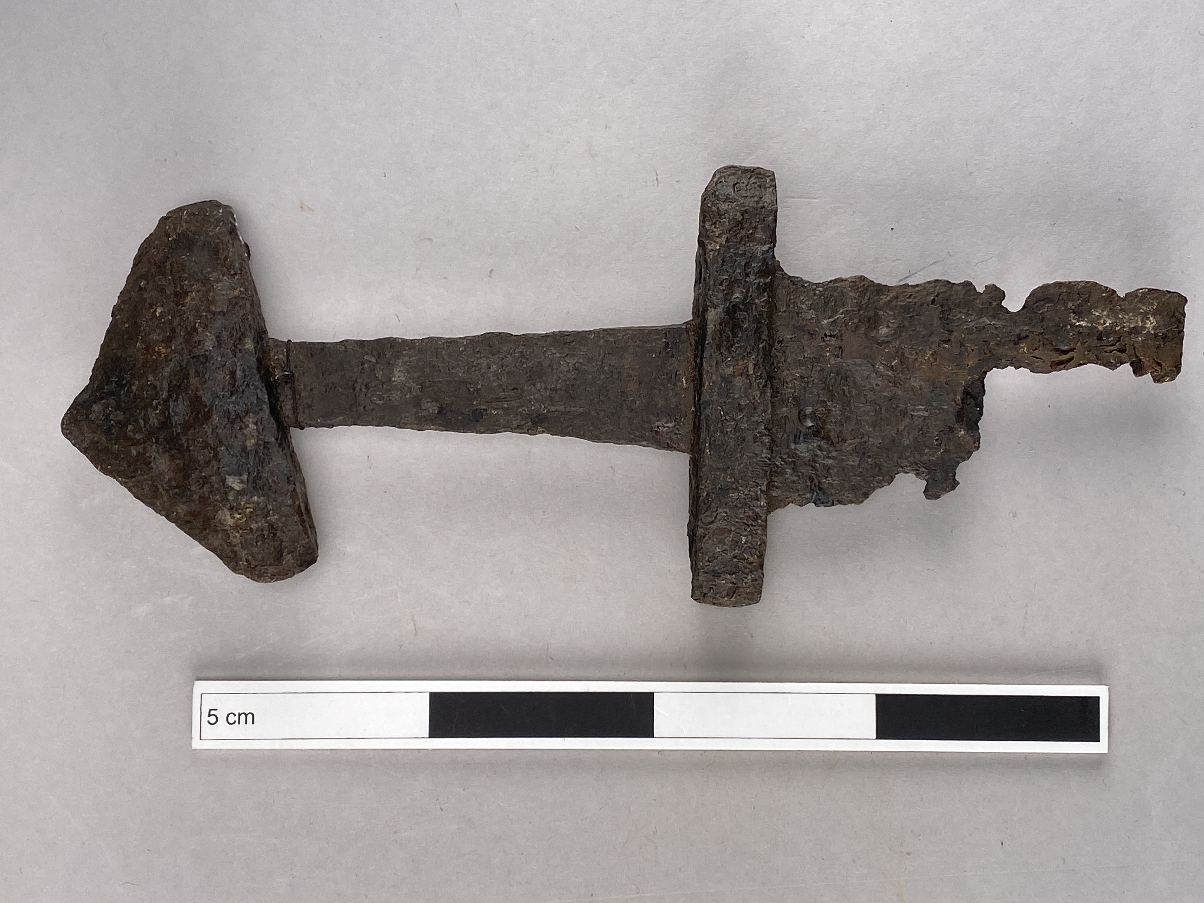 Fragment av 1 tveeggat svärd med hjalt av Petersens typ H. Över och underhjalt har varit ornerade med tvärgående linjer, sannolikt för inkrustering.