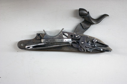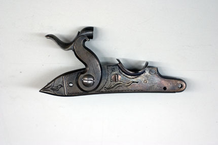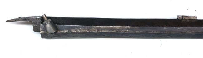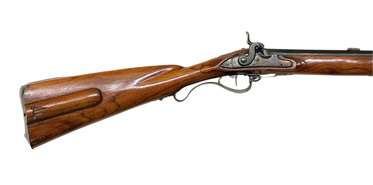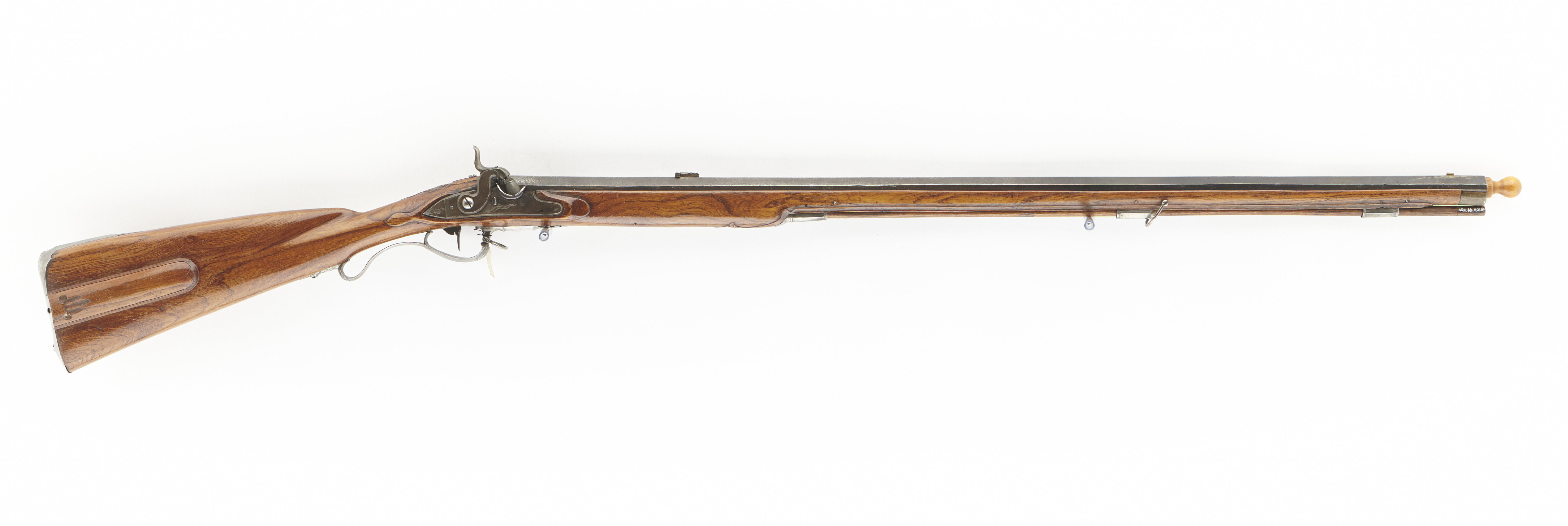 Åttsidig, brunerad, åttaräfflad pipa av stål, ovansidan och varannan sida något smalare än de övriga. Svagt böjt, blankt svansskruvblad med rundat ändblad. På kammarens vänstra sida stämplat närmast pipbasen P och därframför 2 ggr ISPC (Stöckel 3619-3622). På kammarens högra sida rundad snäcka med tändhattsnippel. Riktmedel: Siktskåra från krysskruvens hål till siktet, H-formigt kulissikte av stål, änden mot pipbasen med utåtriktade vingar med streckdekor, blyskärm. Stolpkorn av mässing. Fästning: Tre häften. Pipan fäst med krysskruv, två pipstift av stål samt däremellan främre rembygelns skruv. Flintlås ändrat till slaglås av gultonat stål, plant låsbleck med fasade kanter, försänkt bakspets, graverad sicksack-kantbård samt enkel bladslinga, framför hanen skjutsäkring med ovalt huvud med lodrät mittås. S-formigt svängd platt hane med fasade kanter. Fästning: Två låsskruvar. Svagt böjd avtryckare, konturerat avtryckarbleck. Helstock av ask (?), kolv med rundat kindstöd och kolvlåda, rokokodekor vid svansskruvblad, kindstödets båda ändar och vid spetsrörkan. Stocken signerad "P L S" på v sida vid varbygelns bakre stolpe. Näsband av horn, övriga beslag av stål. Kolvkappa med lång plant flik på kolvryggen, brett åsade kanter, litet ändblad, två fästskruvar. Helt sidbleck, plant med fasade kanter, graverad kantlinje och bladdekor. En + två fasetterade rörkor, triangulär spets med bladdekor. Varbygel med plan bygel och brett fasade kanter, bladdekor, vid framstolpen fält med fyra svängda, skålade ränder och däremellan ringpunsade ytor. I framstolpen fäst den bakre rembygeln. 8-formig främre arm med brett fasade kanter, avslutning med platta med dekor som vid framstolpen samt treflikigt blad. Kluven bakre stolpe, fri bakre arm med dekor som vid framstolpen baktill, fästplatta med parallella tvärstreck samt liten spets, en fästskruv. Tillbehör: Laddstock av trä, l: 825 mm, framtill skodd med horn, l: 24 mm, i bakänden ett invändigt gängat stålrör, l: 123 mm.