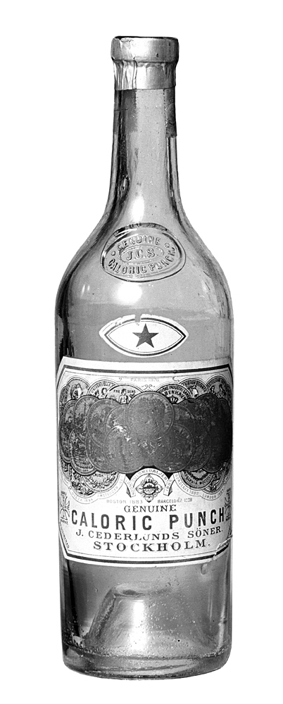 GENUINE CALORIC PUNSCH I-stjärnig, J. Cederlunds Söner, Stockholm, nio helbuteljer Av färglöst glas. Cylindriska, med sluttande skuldra och smal cylindrisk hals med stärkring; bottnen konisk, högt uppskjutande. På skuldran stämpel i relief; etikett stor, fyrsidig, på denna mot vit botten prismedaljer i guld och blågredelint, dessutom text i mörkbrunt samt på etikettens baksida med skrivstil text i svart. Ovanför denna en liggande spetsoval etikett, varpå en femudig stjärna i guld. Kapsylfragment av förtent bly, ofärgat, under kapsylen rester av banderoll i rött med Svenska Statens skattemärke à 40 öre. Höjd: 28,5 cm.; diameter: 8,1 cm.