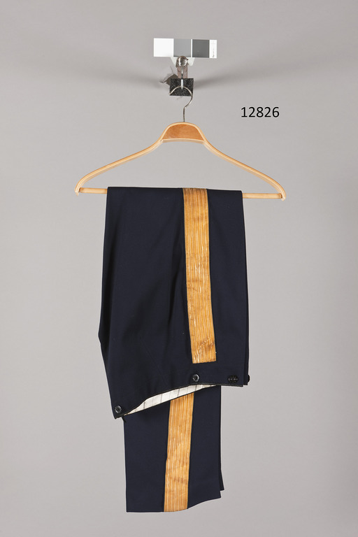 Mörkblå långbyxor av kläde. Gylf med tre plana, svarta plastknappar dekorerade med femuddiga, gula stjärnor, d: 15 mm, ett knapphål och plan knapp upptill som klätts med svart bomullssatäng, d: 15 mm. På knapphålssidan av gylfen en plan plastknapp, svart, dekorerad med femuddiga stjärnor, d: 18 mm. Utefter byxornas överkant ytterligare sex sådana plastknappar. Byxorna upptill passpoalerade med svart bomullssatäng. Två sidsömsfickor. Revärer av guldgalon, b: 54, sydd på en bit kläde i mörkare blå ton än byxornas kläde. Linningen fodrad med vitt siden och vitt siden med grupper av smala svarta ränder. Fickorna fodrade med vit bomullssatäng. I linningsfodret lappar av glättad säckväv. Baktill ögla av svart bomullssatäng.