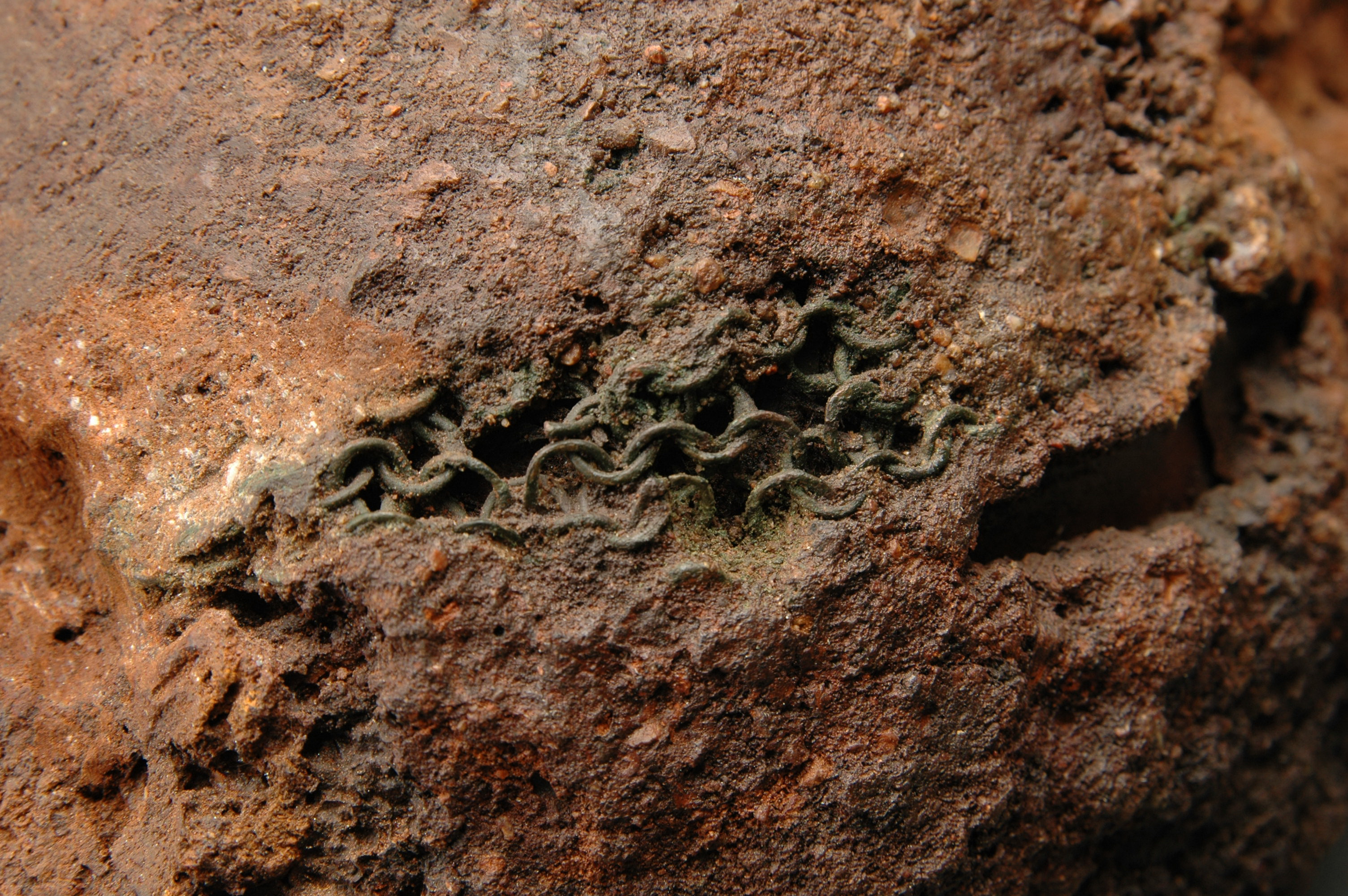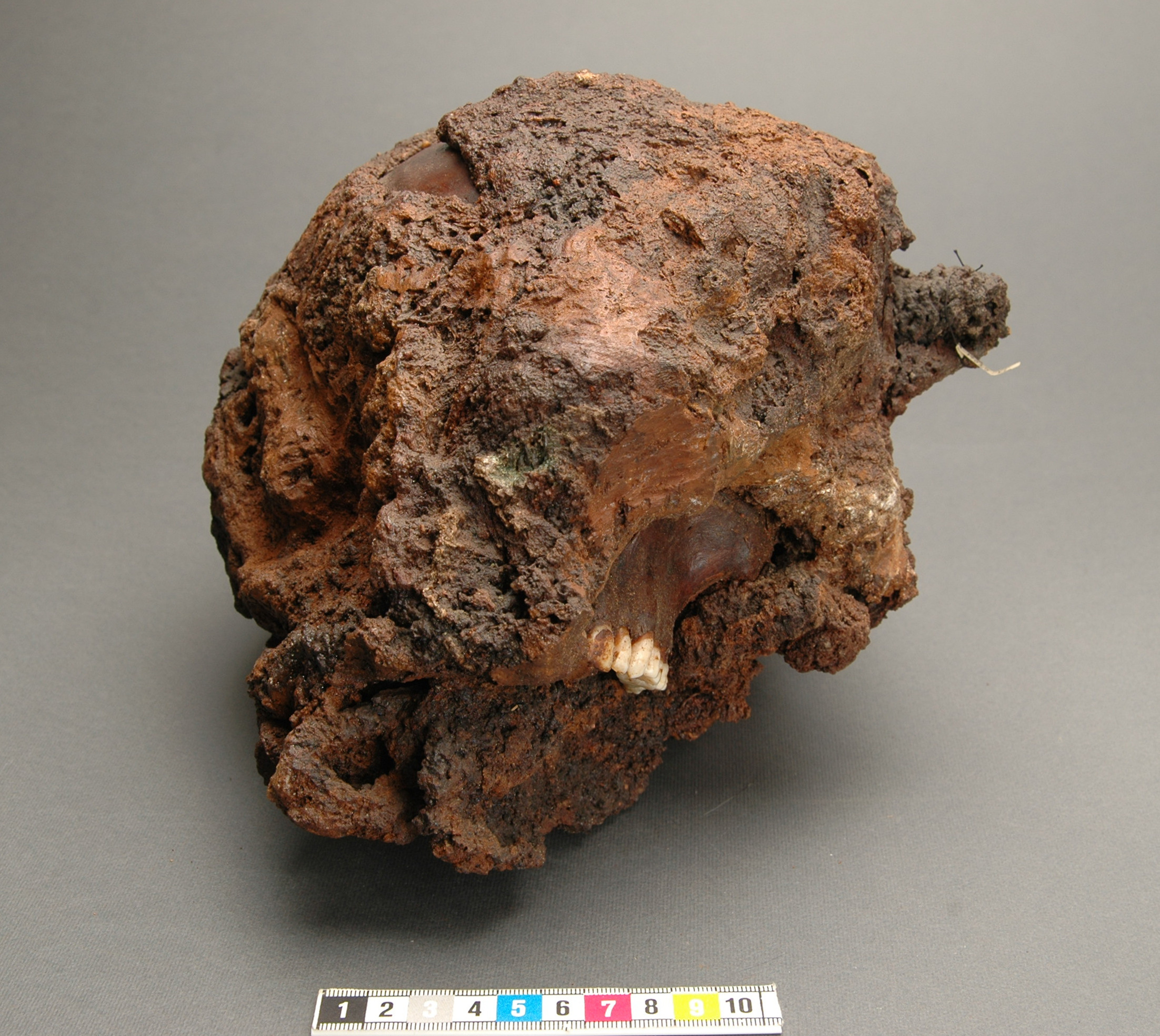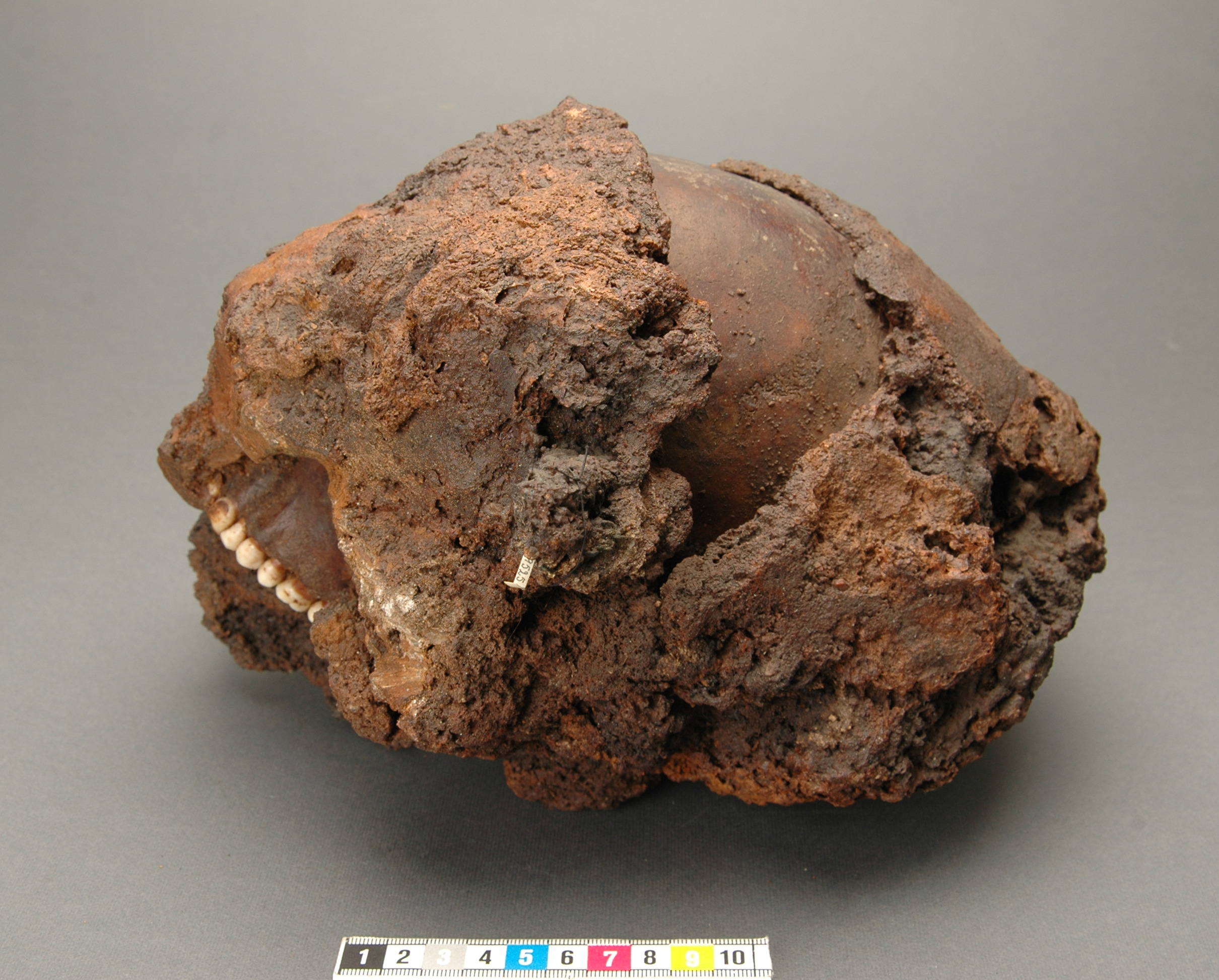 Huva med bronsinläggningar, omsluter ett kranium utan underkäke. Delar av hjäss- och nackpartiet. blottade. 30 benfragment (kranium, fingerben), fyra tänder.