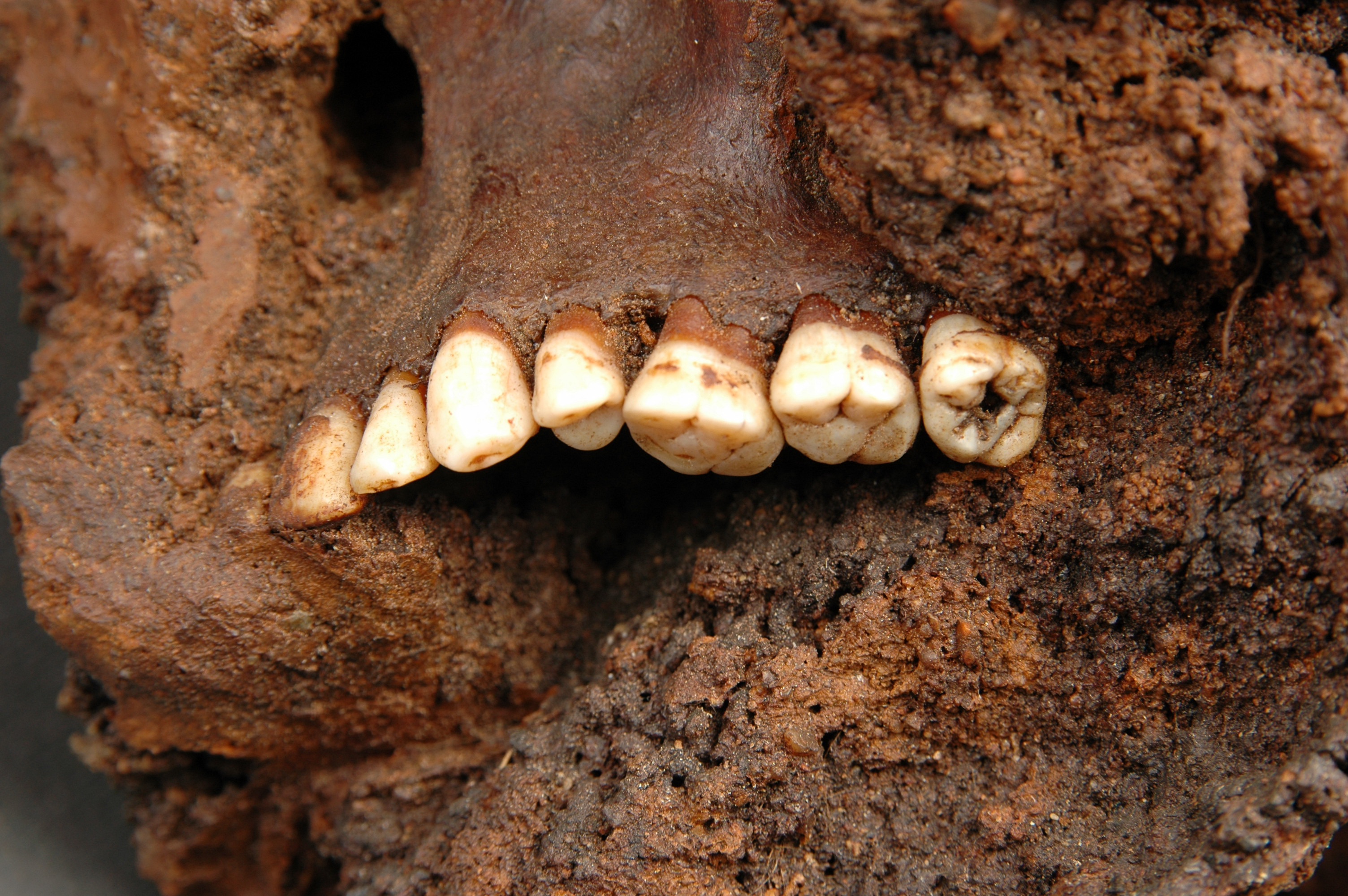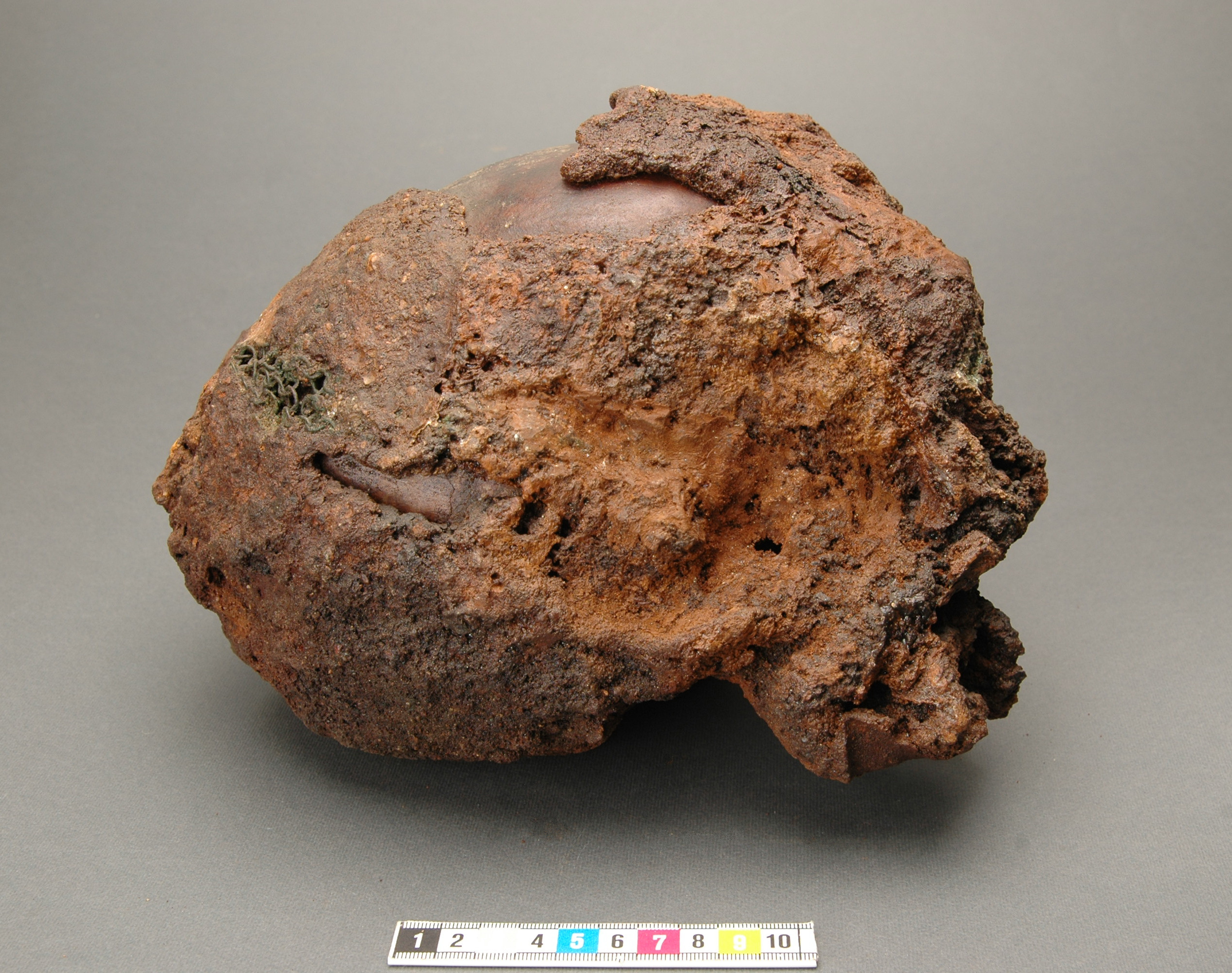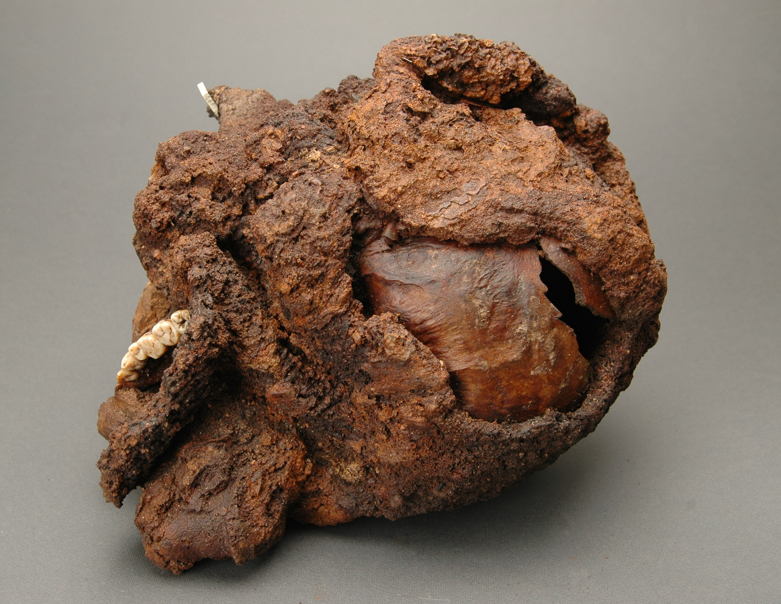 Huva med bronsinläggningar, omsluter ett kranium utan underkäke. Delar av hjäss- och nackpartiet. blottade. 30 benfragment (kranium, fingerben), fyra tänder.