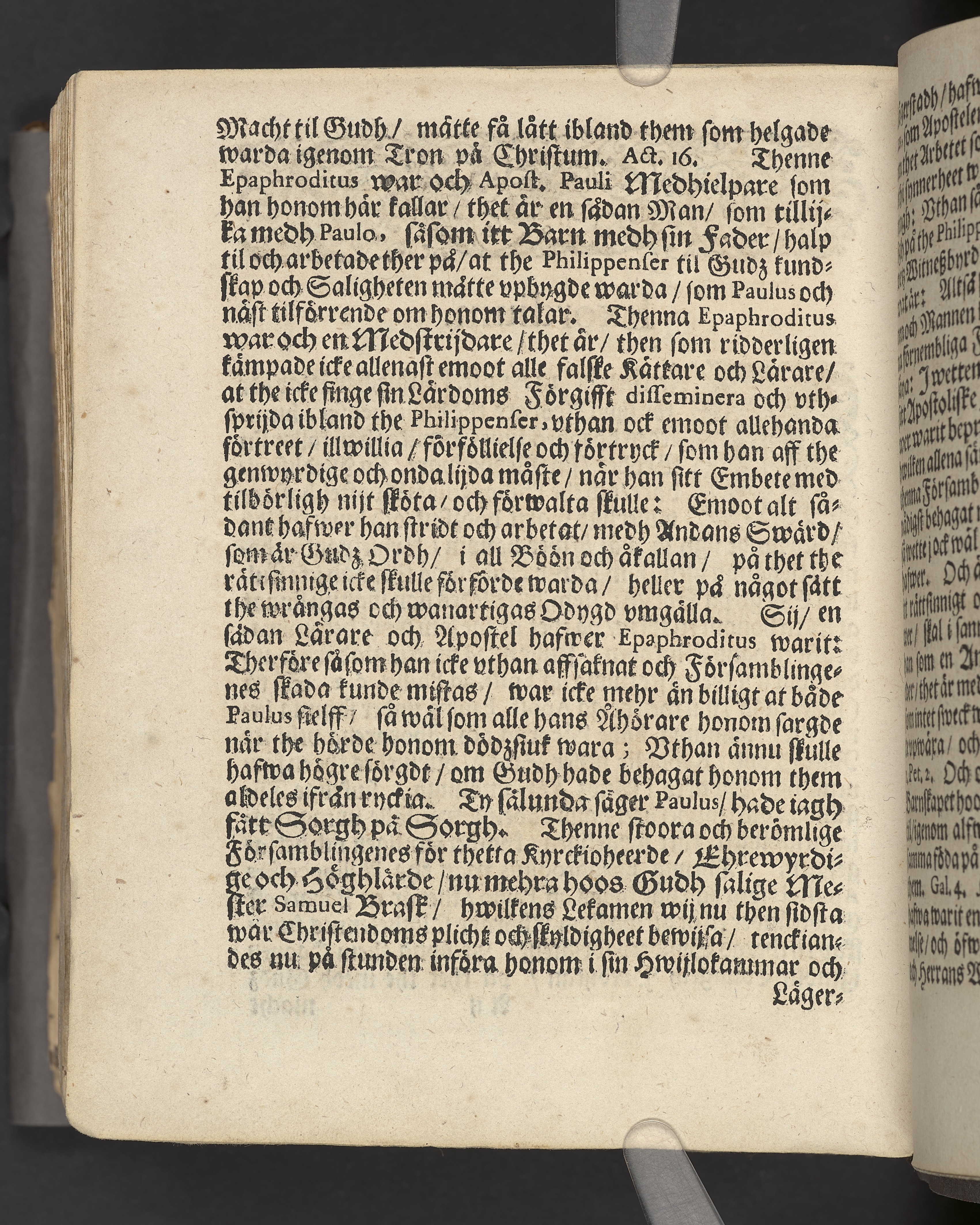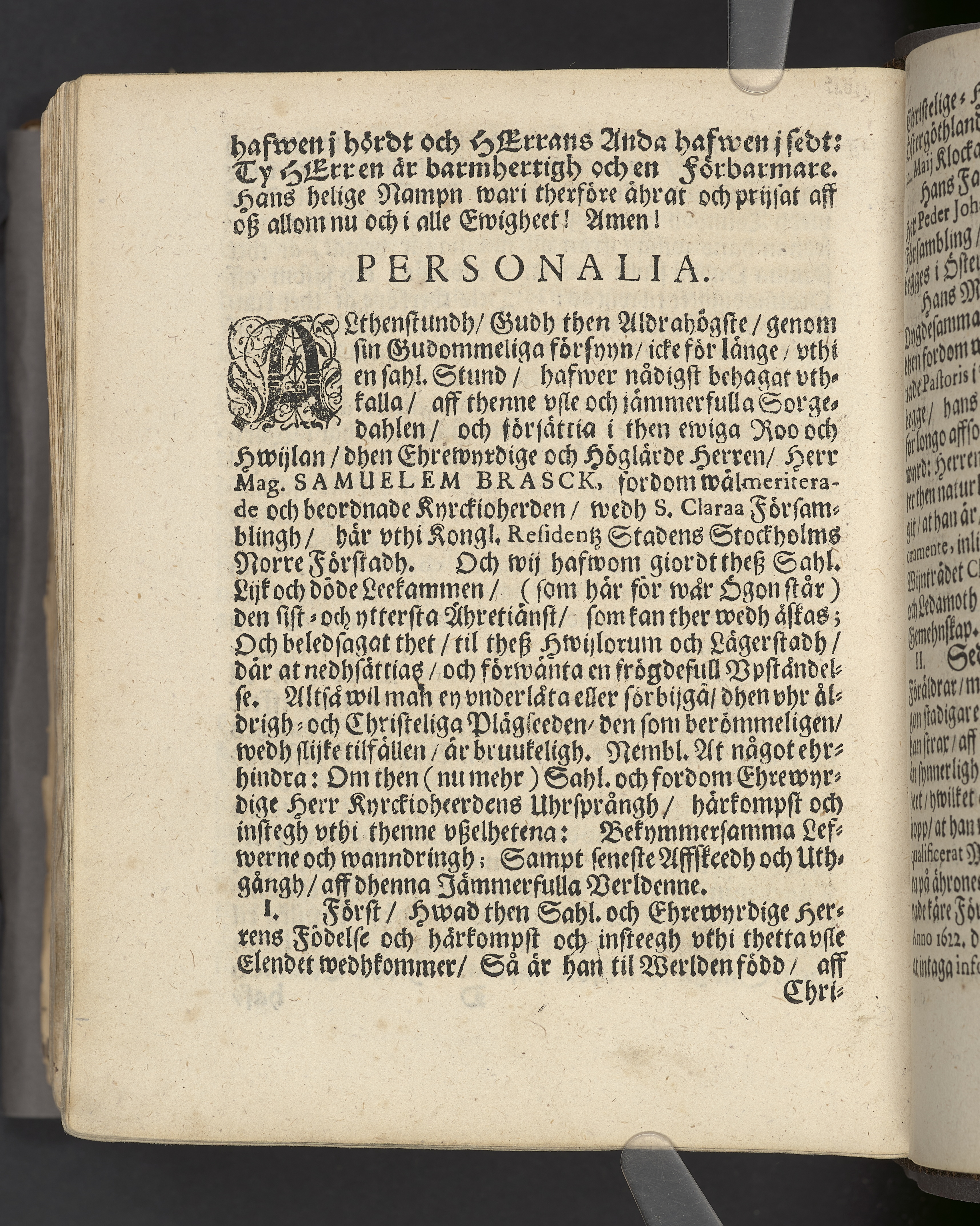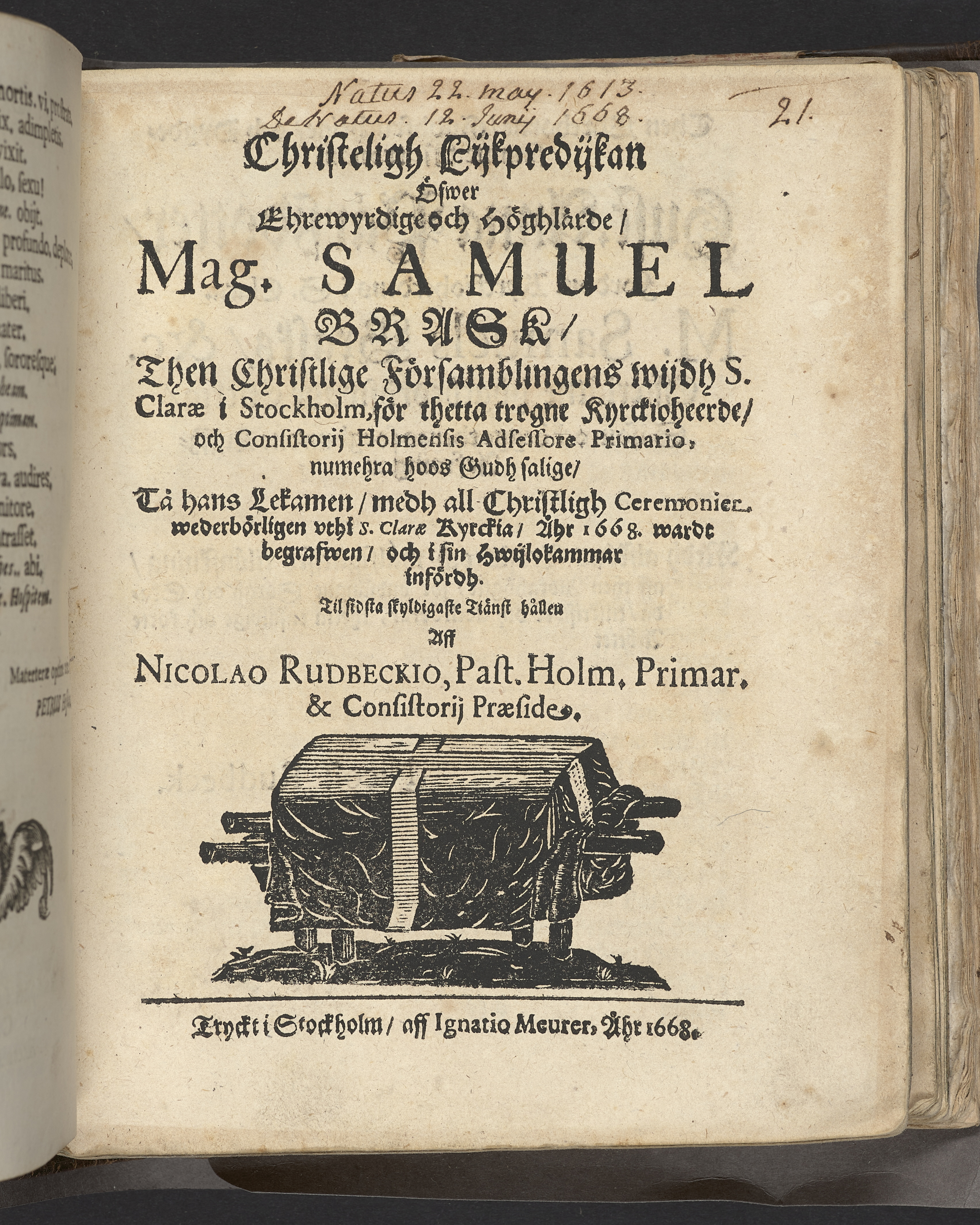 Christeligh lijkpredikan öfwer ehrewyrdige och höghlärde, Mag. Samuel Brask, then christlige församblingens wijdh S. Claraæ i Stockholm, för thetta trogne kyrckioheerde ... tå hans lekamen, medh all christligh ceremonier wederbörligen vthi S. Claræ kyrckia, åhr 1668. wardt begrafwen ... hållen aff Nicolao Rudbeckio ... Tryckt i Stockholm, aff Ignatio Meurer, åhr 1668.