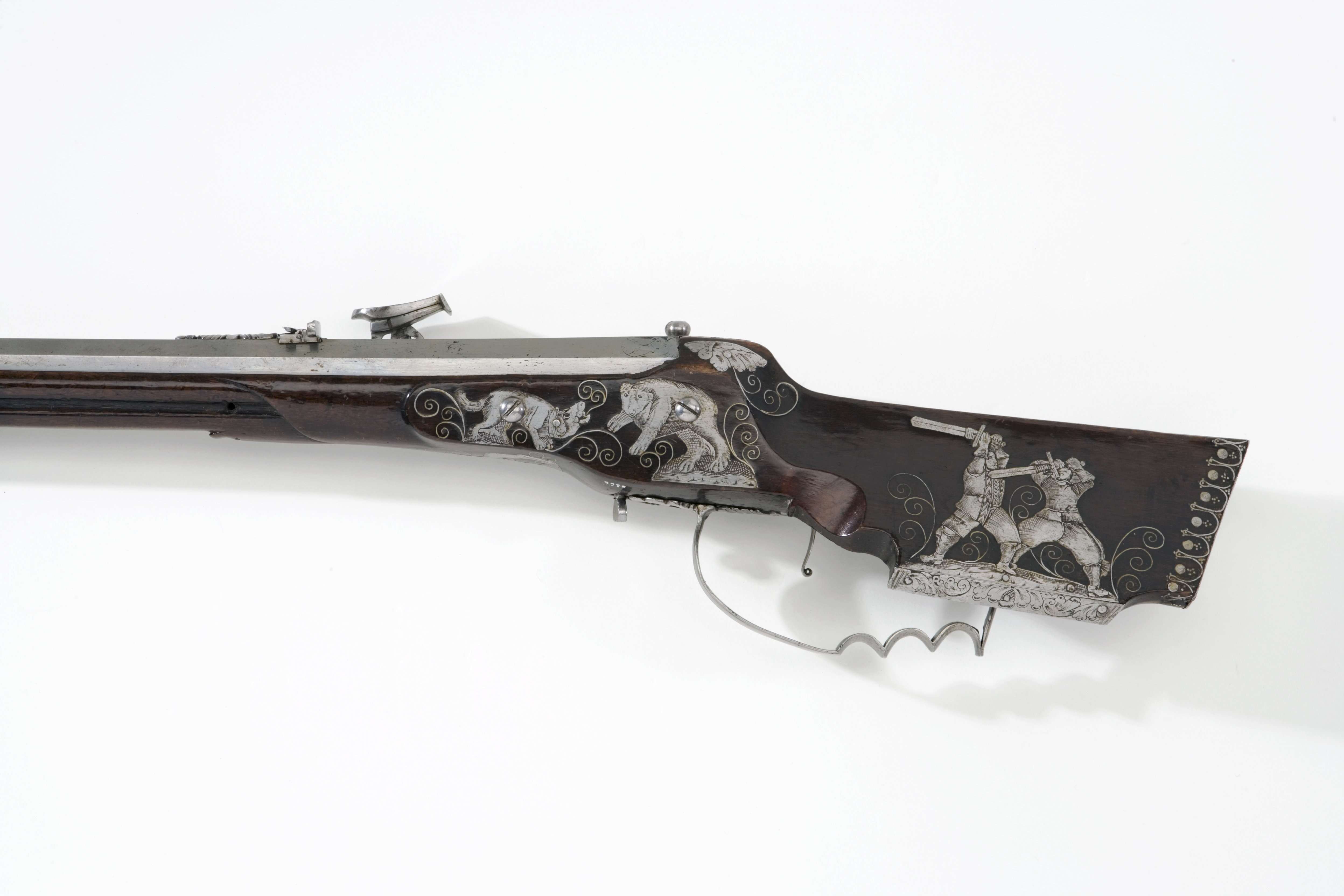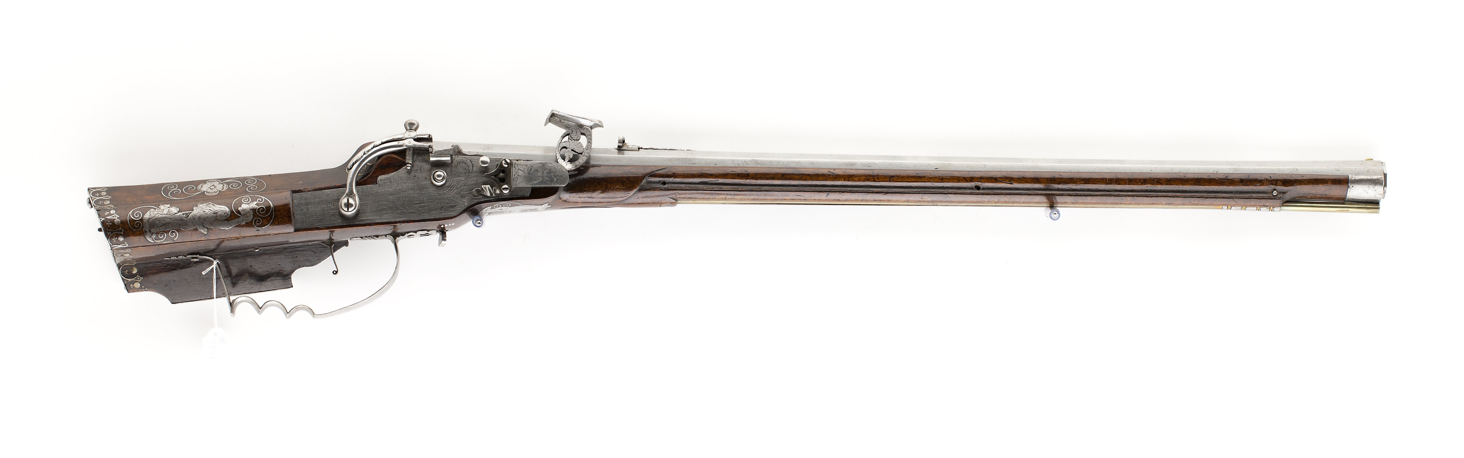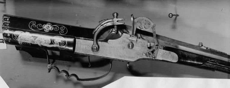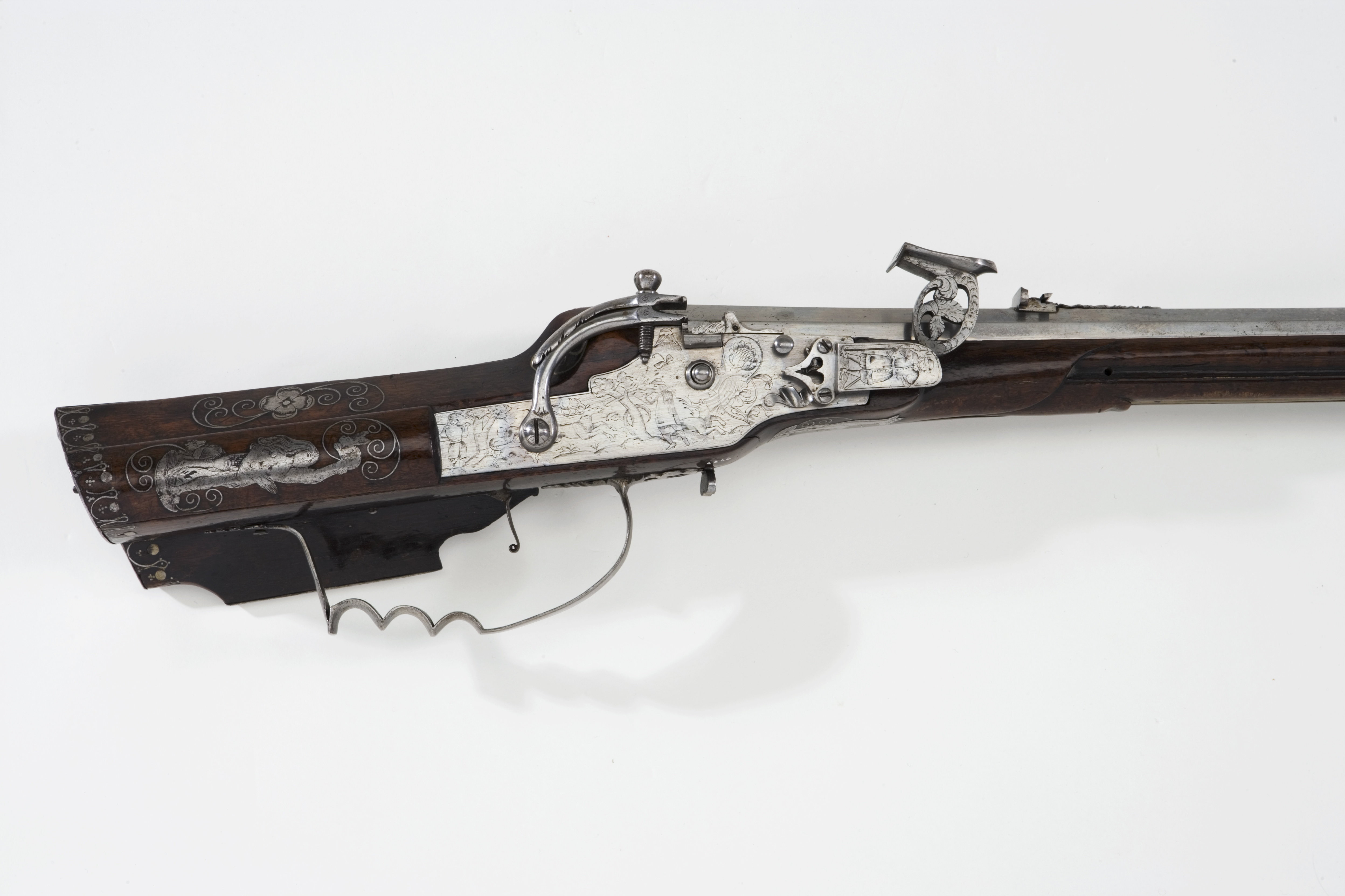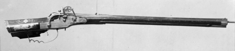 Åttsidig pipa av stål, åtta räfflor. Graverad dekor i form av blad på kammaren och kring mynningen. På kammaren en rund mässingsstämpel med I R ovanför ett tredubbelt treblad (Stöckelnr 3565, vägl. 1921:205). Riktmedel: Klaffsikte av stål med framförliggande, profilerad gren med ekollon. Stolpkorn av mässing. Fästning: Snapplås av baltisk typ, ändrat från hjullås. Plant låsbleck av tysk typ, bakåt avsmalnande i två fall. Graverad dekor i form av hjortjakt. Böjd hane med lös, pålagd överkäke med konturerade sidor. Hjulaxeln igensatt med stålpropp med runt huvud. Den ursprungliga hanen ändrad till eldstål med oval, genombruten hals. Elståls-hanfjädern täckt av platta, graverad med krigare med hillebard. Genombruten studel över eldstålsfoten. Invändigt är hjulstudeln liksom kedjelänken avlägsnad. Fästning: Rak avtryckare, som verkar i vertikalled. Brun, glanspolerad helstock av valnöt med kolv av tysk typ. Inläggningar på kolven i form av stålband och graverade stålplattor.Bakplåt av stål. Kolvlådelock av trä med inläggningar i form av en kvinna, hare och räv. På anslaget två kämpande män med svärd. Två låsskruvbrickor i form av en hund (?) och en björn. På stockens undersida framför varbygeln inlagt en hjort. Näsband och genombruten rörka av stål. Varbygel med tre fingerlägen, kraftig båge framtill, genombrutna armar. Tillbehör: Laddstock av mässing.