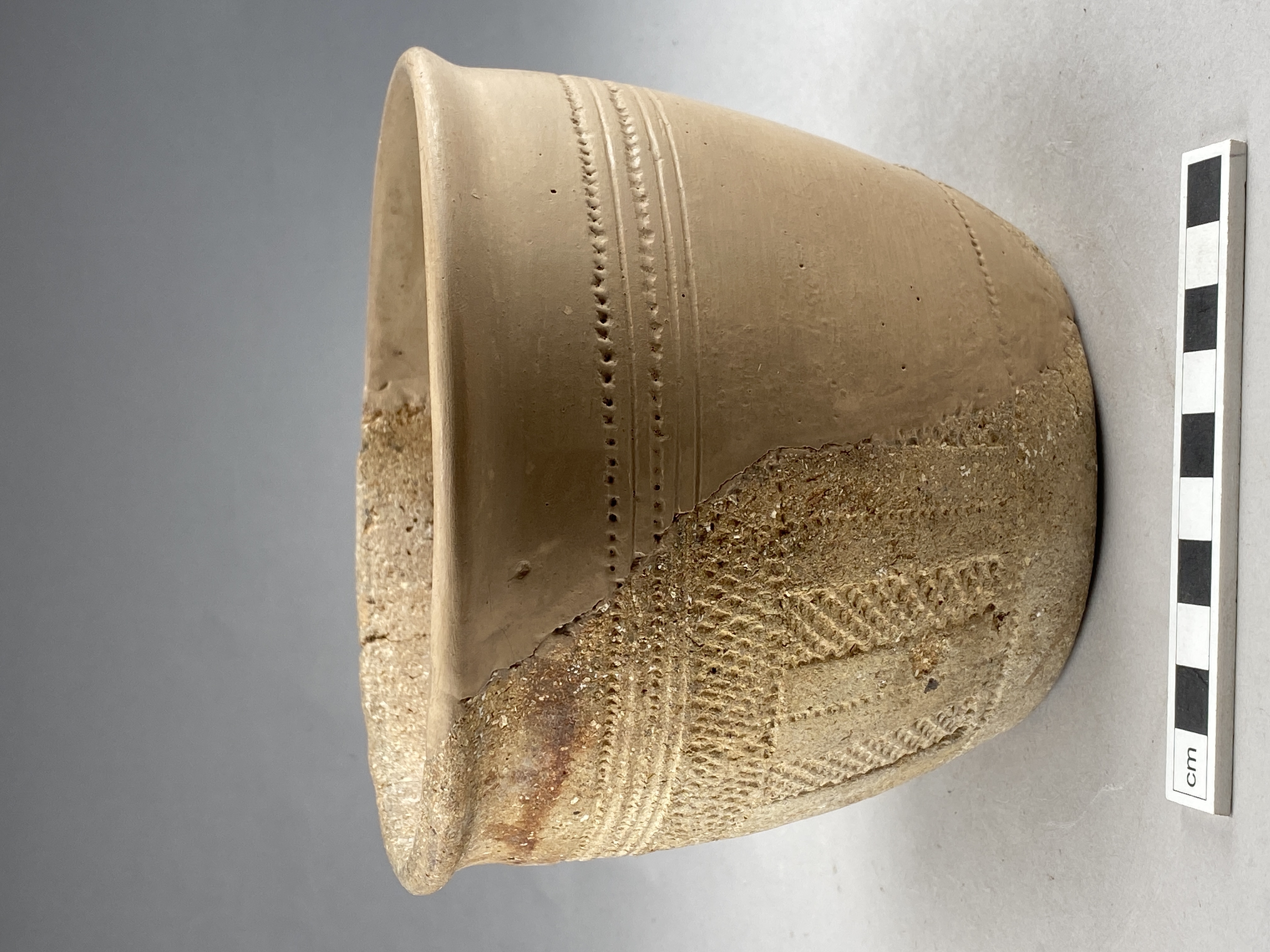 Ornerad med inpressade stämpelintryck med våffelmönster. Magrat med täljsten ev. asbest. Under mynningen syns en rostfärgad bård som är en rest av ett järnband som suttit där.