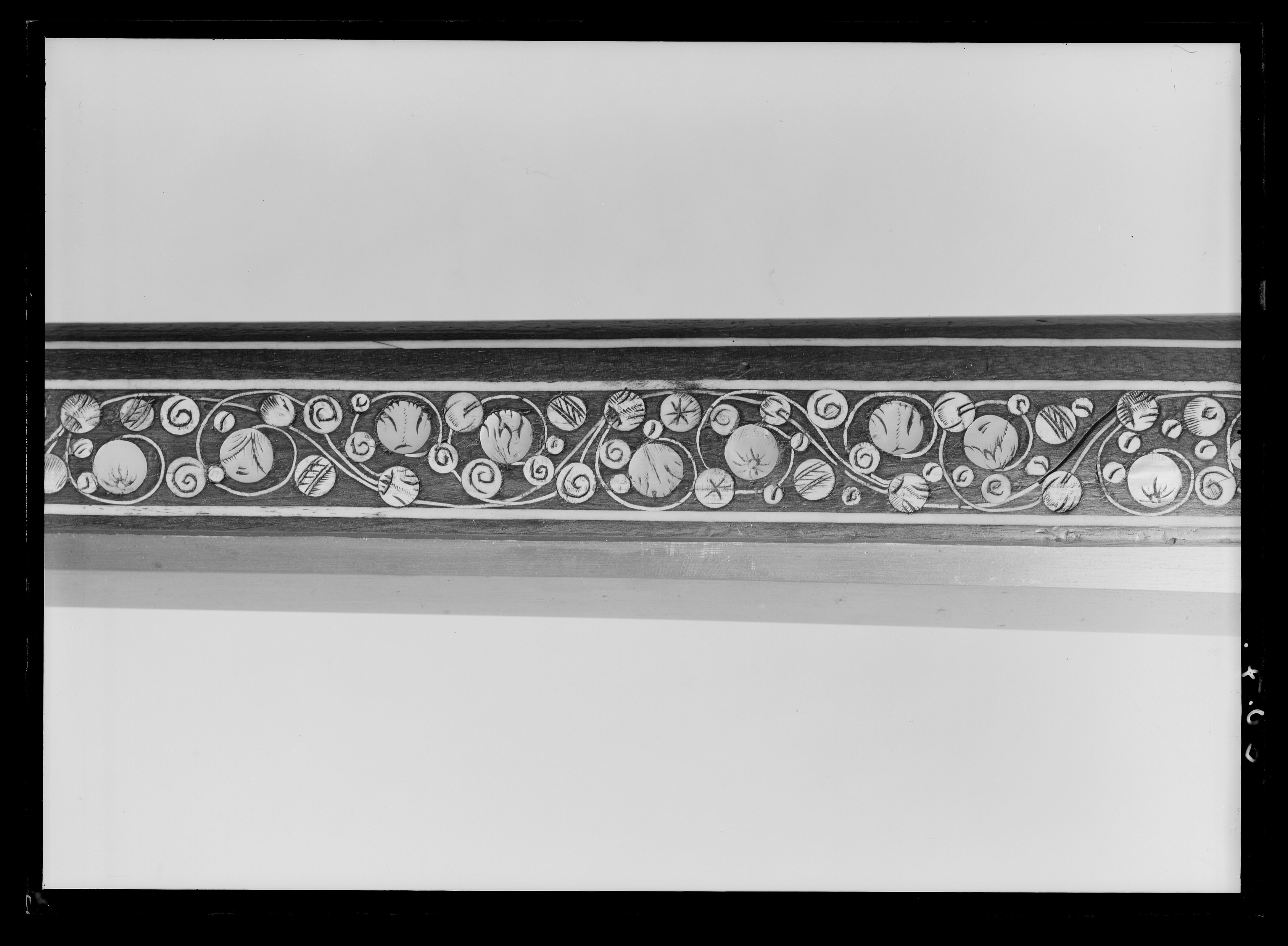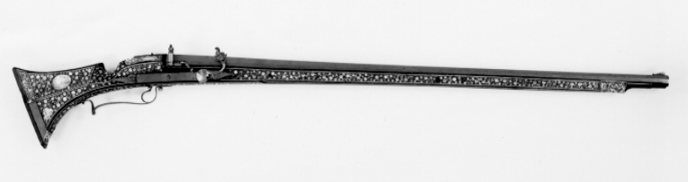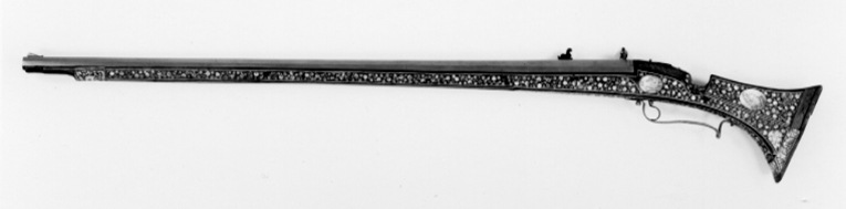Åttsidig, slätborrad pipa med rakt, rektangulärt svansskruvblad. På pipans h. sida fäst en fyrsidig fängpanna med nederkanterna fasade, x i fängpannan. I ena hörnet en skruv med balusterformigt huvud och tvärgående hål, på skruven fäst en skärm med tre trappformiga spetsar, två hål och arm över rektangulärt hål för förlorat sikte. Vridbart fängpannelock med ena hörent utdraget och graverat som hundhuvud ur vars gap det nedåtböjda fingergreppet utgår, svarvad ände. På pipans undersida tre ggr djupt inslagna, ovala, lövliknande stämplar. Riktmedel: Siktet saknas. Vid mynningen fäst ett kulisskorn av stål. Fästning: Pipan fäst med krysskruv underifrån(varbygelskruv) samt två pipstift av trä. Luntlås av stål med hävstångsmekanism, plant låsbleck med ändarna utformade till löv med graverad dekor .S-formig hane med rund, välvd hankropp med ett hål. Hanhalsens kanter fasade, luntklämma med graverat drakhuvud på utsidan. Klämskruv med vinghuvud vars ena arm brutits av. Fästning: två låsskruvar. C-formig avtryckare. Rektangulärt avtryckarbleck av ben med rundade ändar, graverat flätmönster. Helstock av valnöt, muskötkolv med nedskuret tumläge. Sluten laddstocksränna. Stocken dekorerad med benlister och yttäckande inläggningar i form av bladslingor och runda plattor av ben och pärlemor. Längs kolvänden breda benlister med graverad bladdekor, en platta på vardera sidan saknas. Kolvänden ursprungligen täckt av benplatta, över hälen en mässingsskoning. På kolvens sidor på övre halvorna ovala pärlemorplattor med graverade mansbyster, profil h., på h.sida iförd hjälm, på v. sida fez och turban, på nedre halvorna droppformiga pärlemorplattor med bladdekor. Mellan låsskruvarna en oval pärlemorplatta med en naken vildman med klubba. Vid svansskruvbladet urspr. tre benplattor, två större vid sidorna med graverade hermer, (den v. saknas), bakom svansskruvbladet en mindre platta med en graverad lejonmaskaron. Över laddstocksrännans ände en benplatta med en lejonmaskaron. Varbygel av stål, lång med framtill rundad undersida, på bakre hälften plan med fasade kanter, vid övergången ett rundat tvärband, bygeln nedåtsvängd vid bakre stolpen, skruvfästen i form av spetsiga blad, på främre bladet en otydlig stämpel(?).