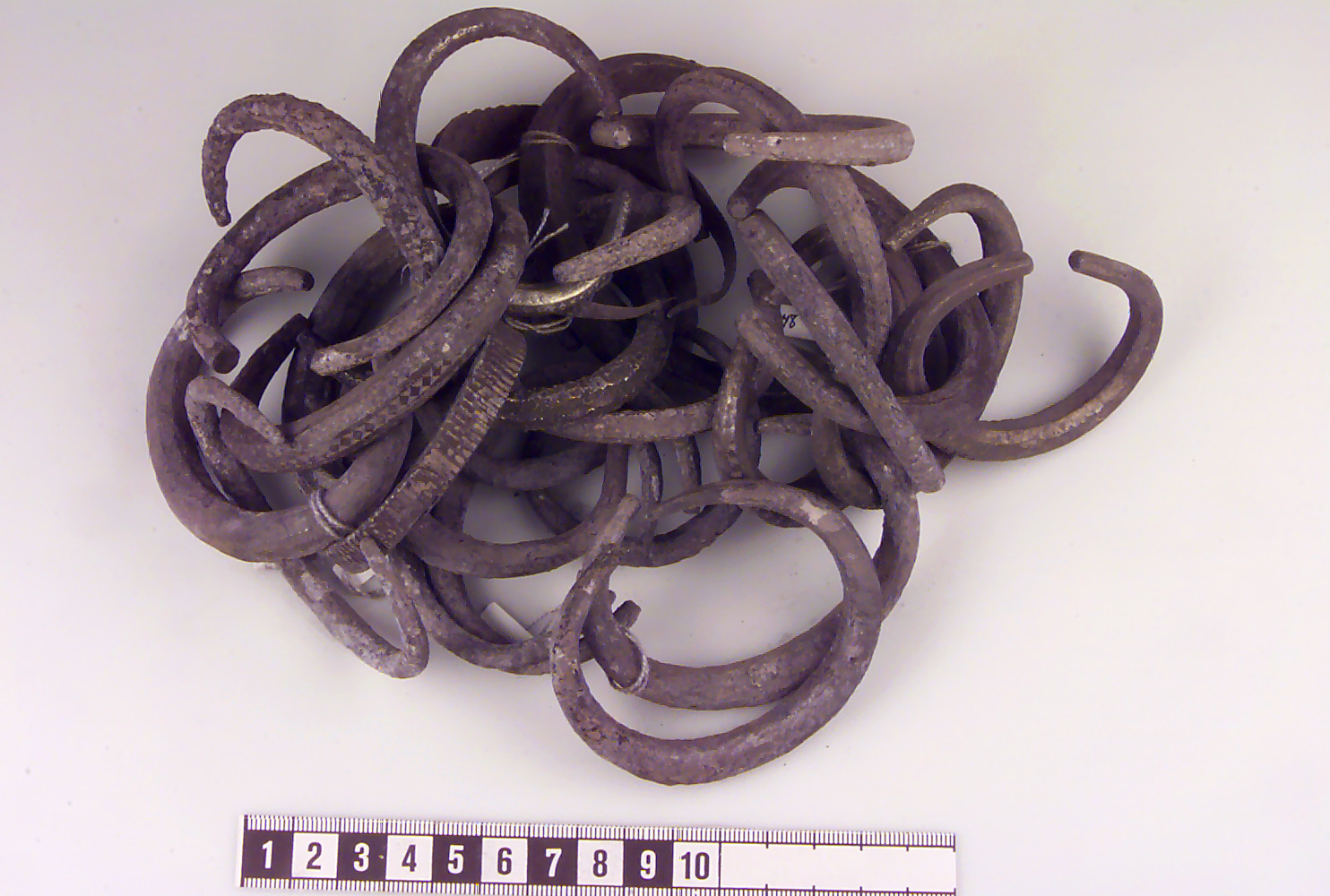 Bestående av två ornerade bandformade armbyglar samt 25 tenformade armbyglar med avsmalnande ändar. Löst sammanfogade. Skadat ytskikt på samtliga. Några stämpelornerade med motställda trianglar, zig-zag band, kryss i rader mm.