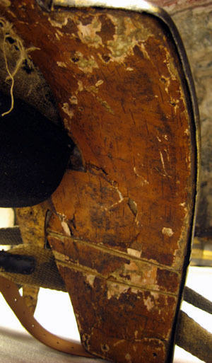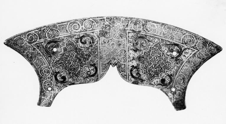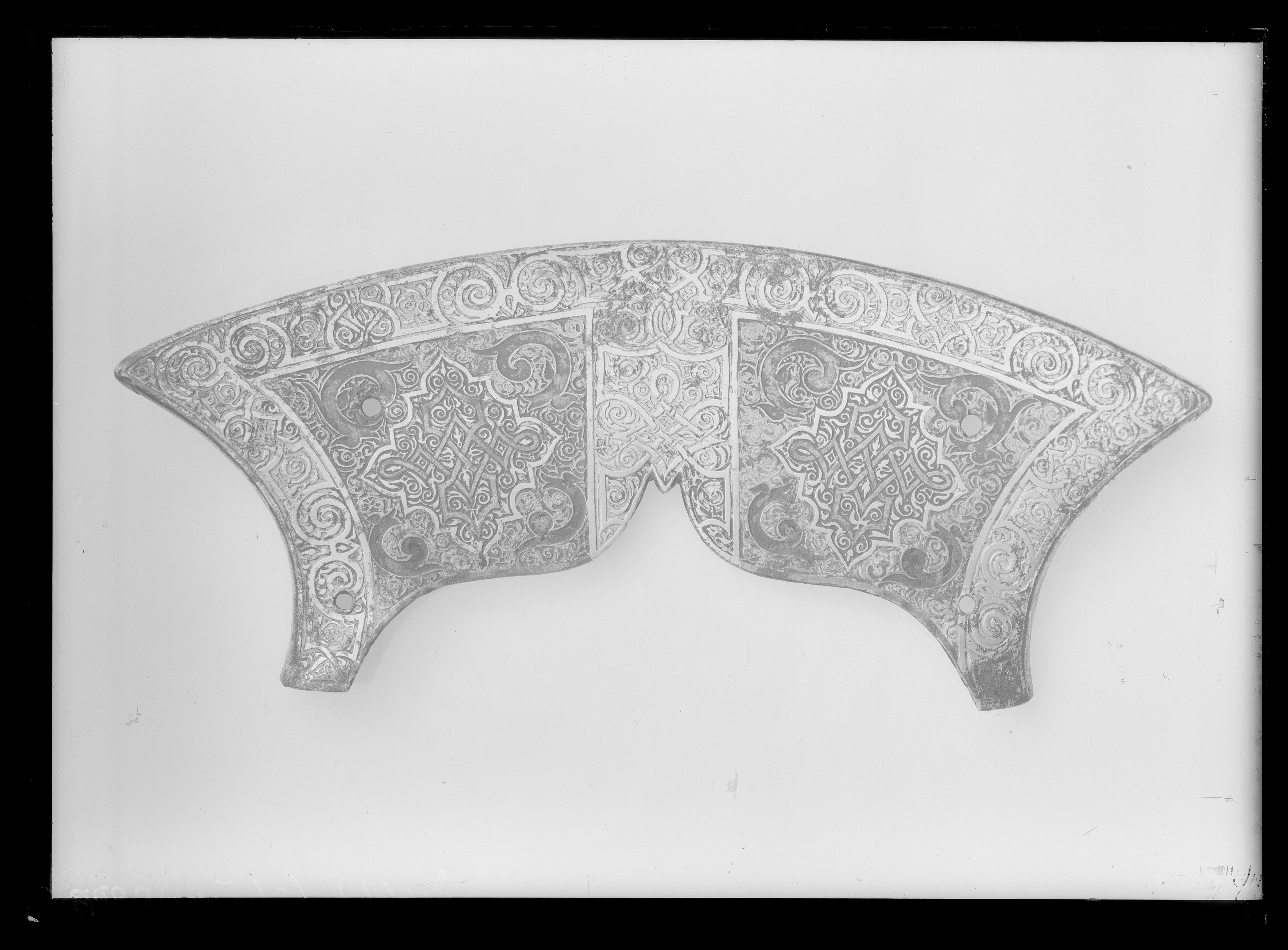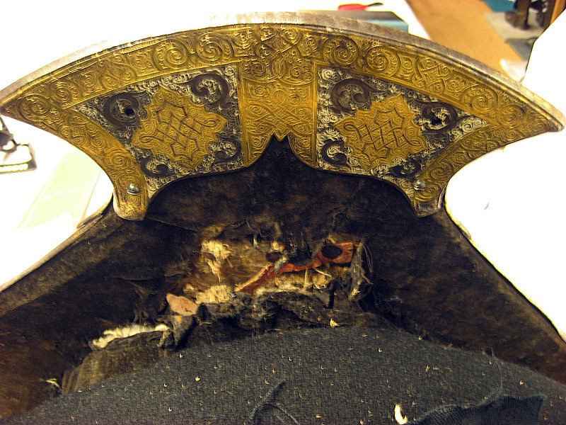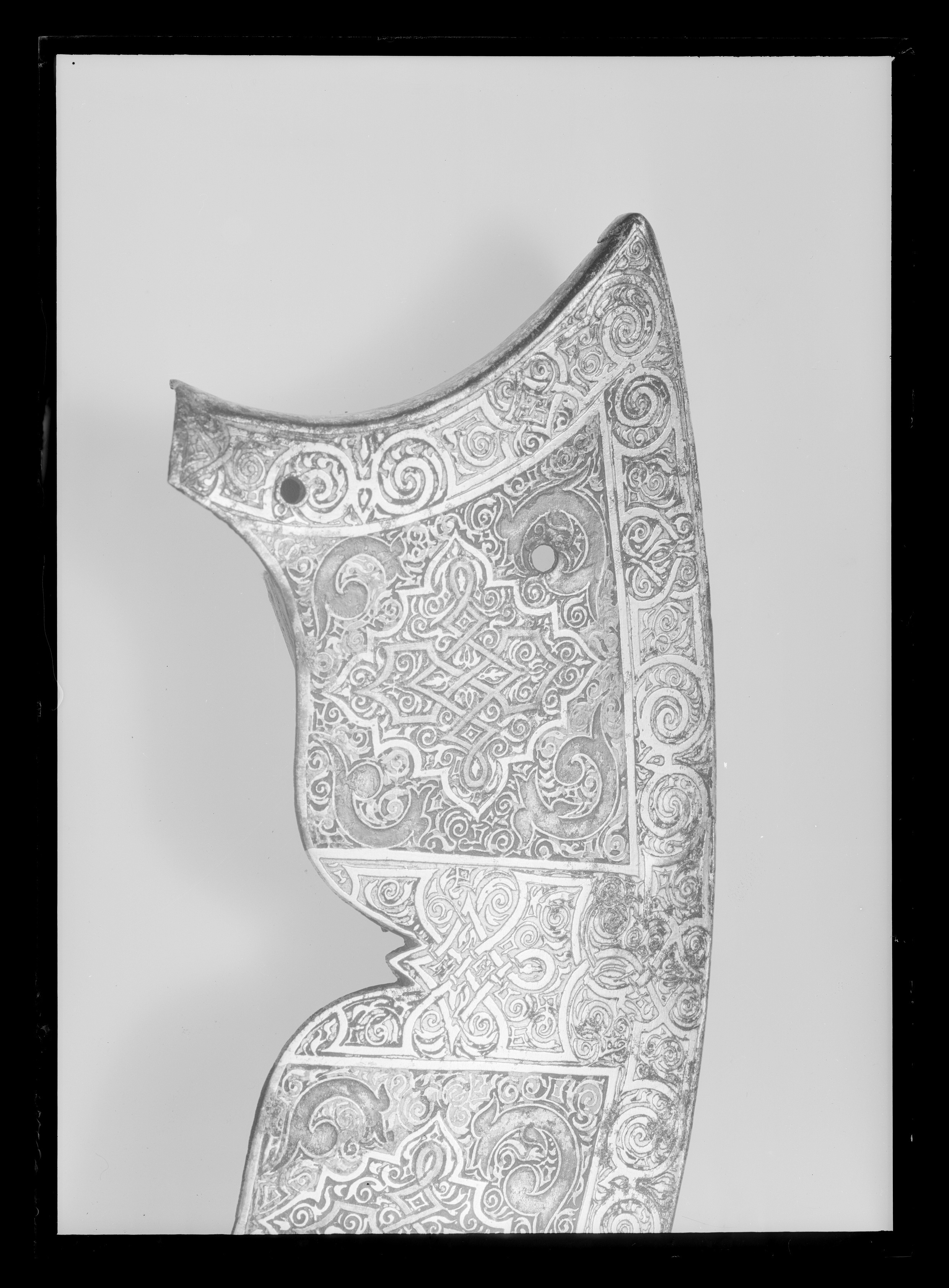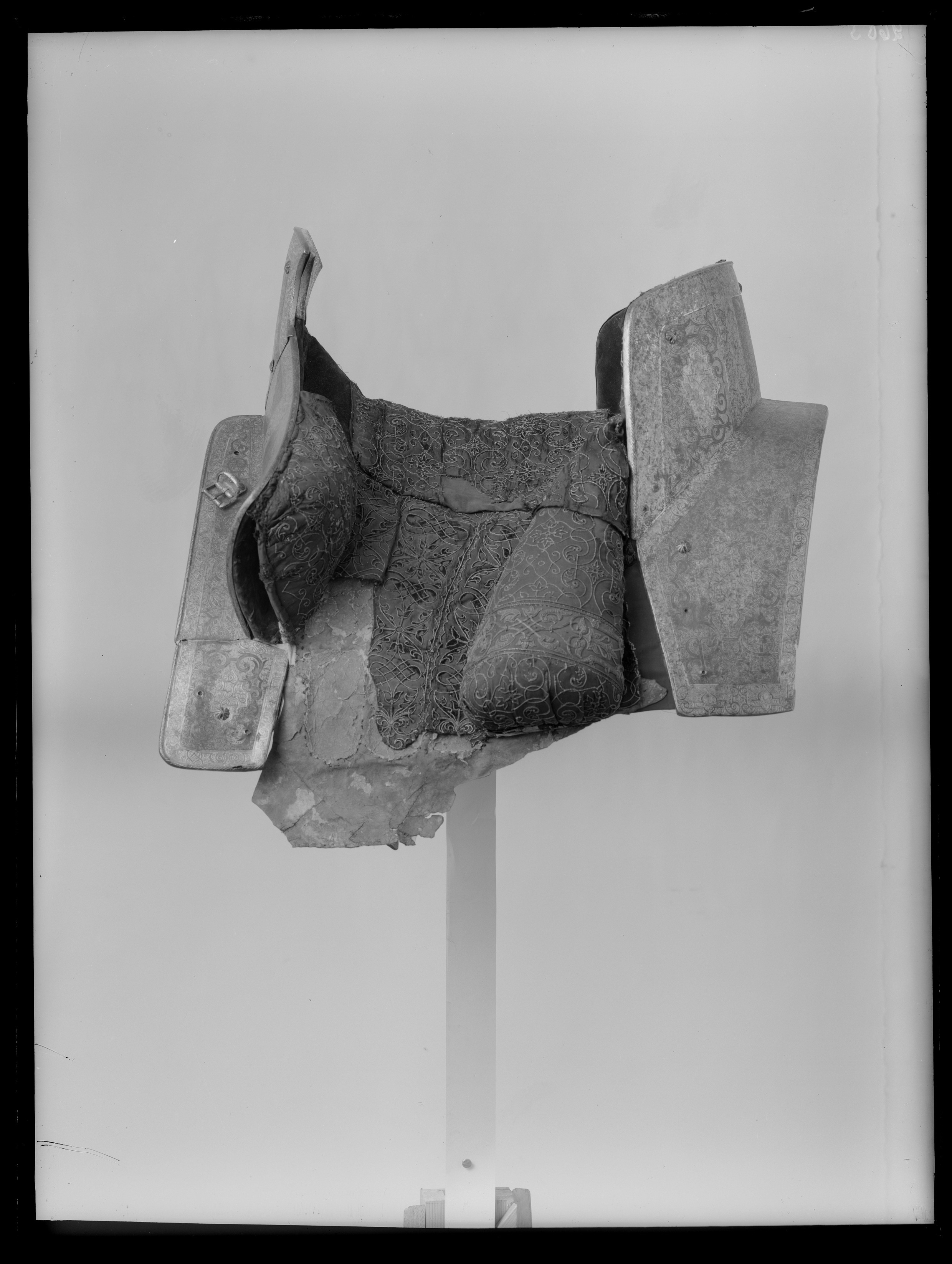 Av driven stålplåt med på utsidan etsad och kallemaljerad dekor. Sammanlagt åtta delar. Bakbom med hög och mot insidan välvd bakre del. Sidostycken, välvda med nedåt löpande svagt avsmalnande och tvärt avslutade ändar. Stomme av lätt välvda träplattor överdragna med skinn, björknäver och en brunaktig färg. Klädd med brun sammet och stoppad med okänt material. Frambom med nedåt vinklade sidor, nertill oregelbundet formade ändar. På höger sida riktad utåt och uppåt och på vänster sida rak med svagt rundad kant. Upptill övergår bommen i en uppåtriktad och inåt välvd platta. Övre kanten konvex med rundade urtagningar i sidorna bildandes utdragna spetsiga kanter. B 225, h 175 mm. Upptill på frambommens kappa en sölja, l 40 mm. Vinklad uppåt 45 grader med ramens bakdel rundad. Bommen vilar på rektangulära kappor, l 420 mm, med rundade kanter. Plåtarna fästade i trästommen med skruvar, skallarna cirkulära, svagt koniska och blomformigt räfflade. På sadelns undersida längsgående stålskenor. I skenornas främre del två rektangulära öglor, b 40 mm. I den främre ett nytt läderband. Baktill två läderremmar, en nyare. Sadelgjord av nytillverkade remmar. Lika på bägge sidor. Under frambommen i var sida 310 mm lång läderrem, möjligen ursprunglig. Sitsen klädd med ett fastsytt svart tyg.