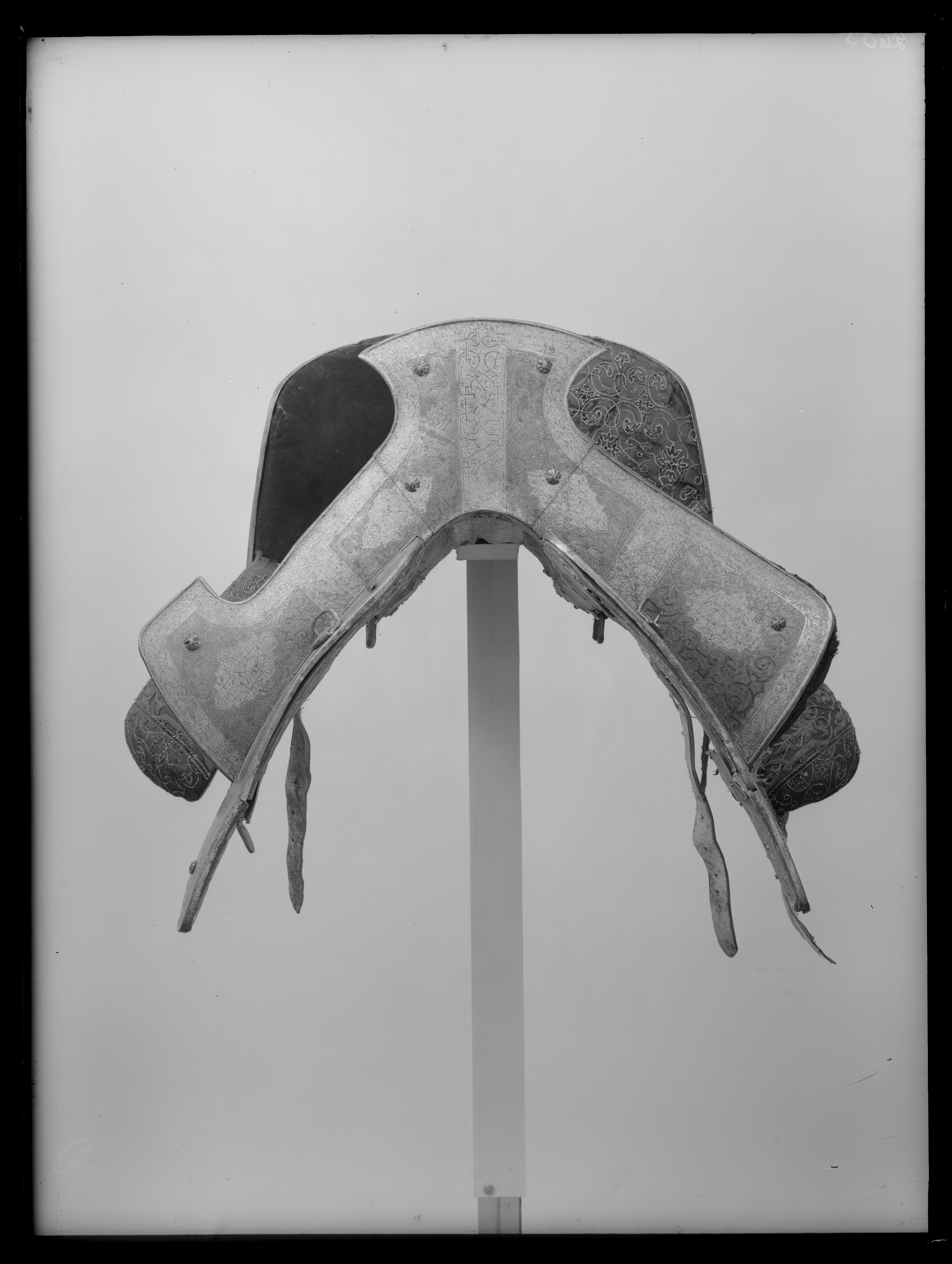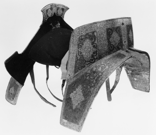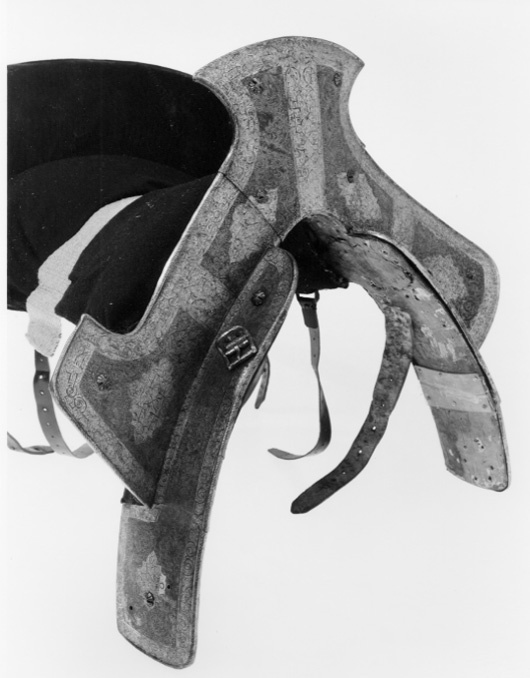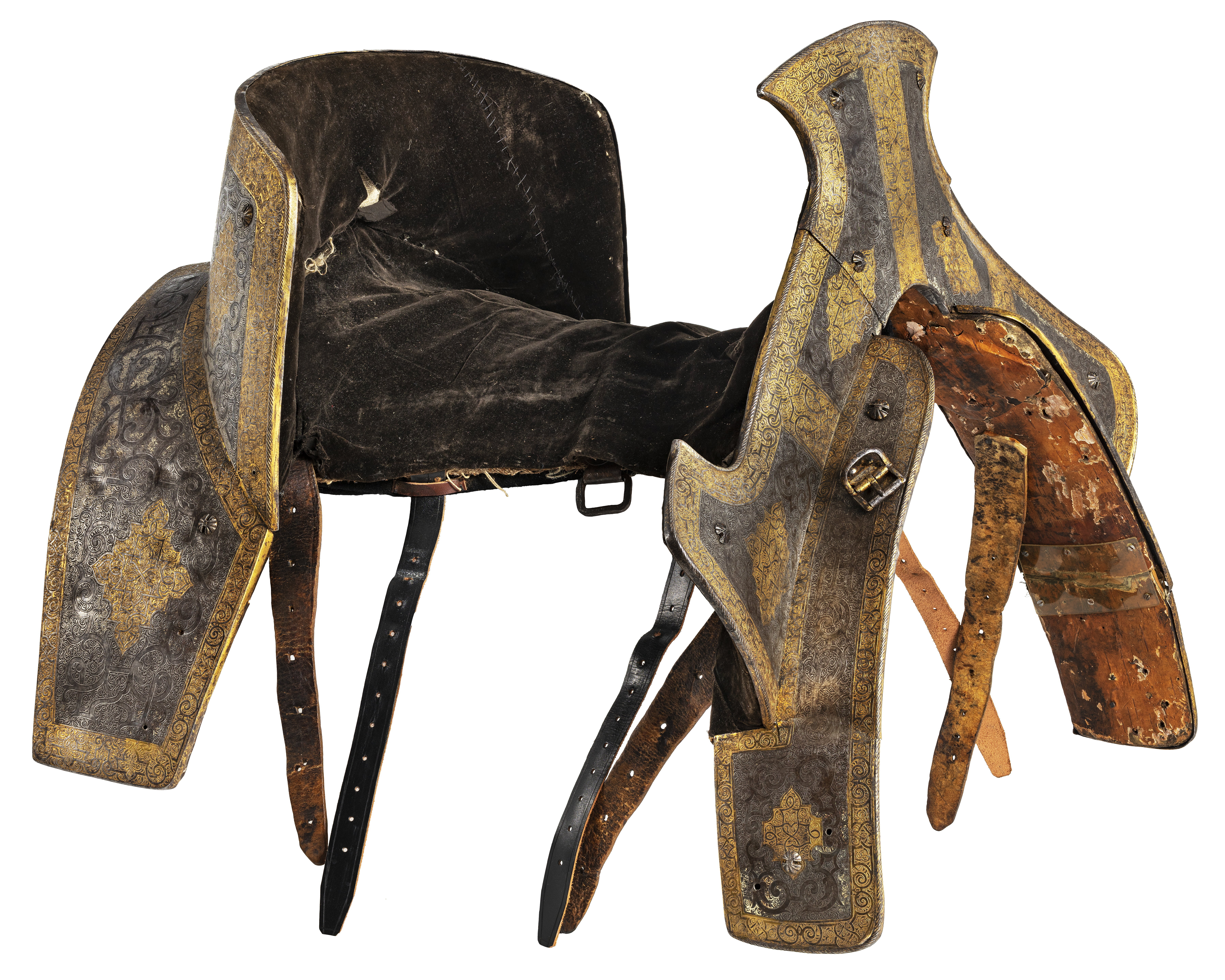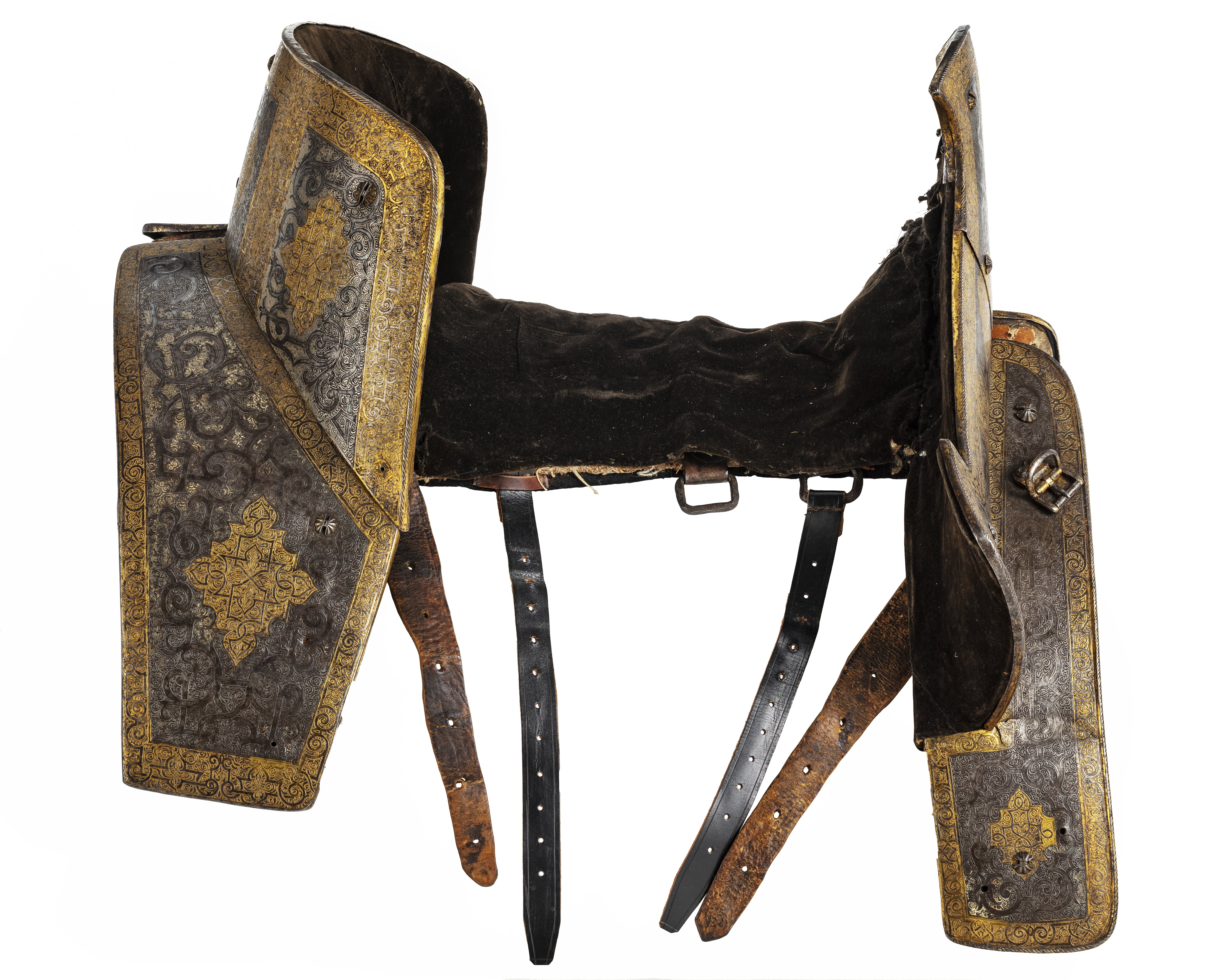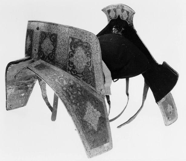 Sadel, ingående i Sigismund Augusts rustningsgarnityr för man och häst. Skänkt år 1574 av prinssessan Anna av Polen till Johan III. Tillverkad på 1550-talet av Kunz Lochner i Nürnberg.