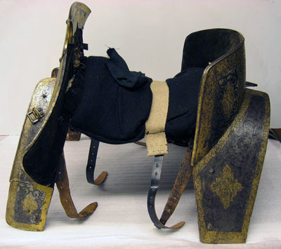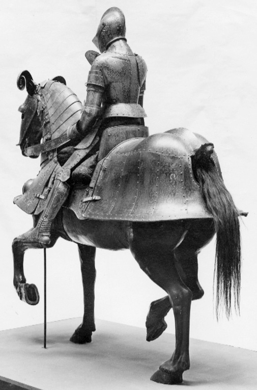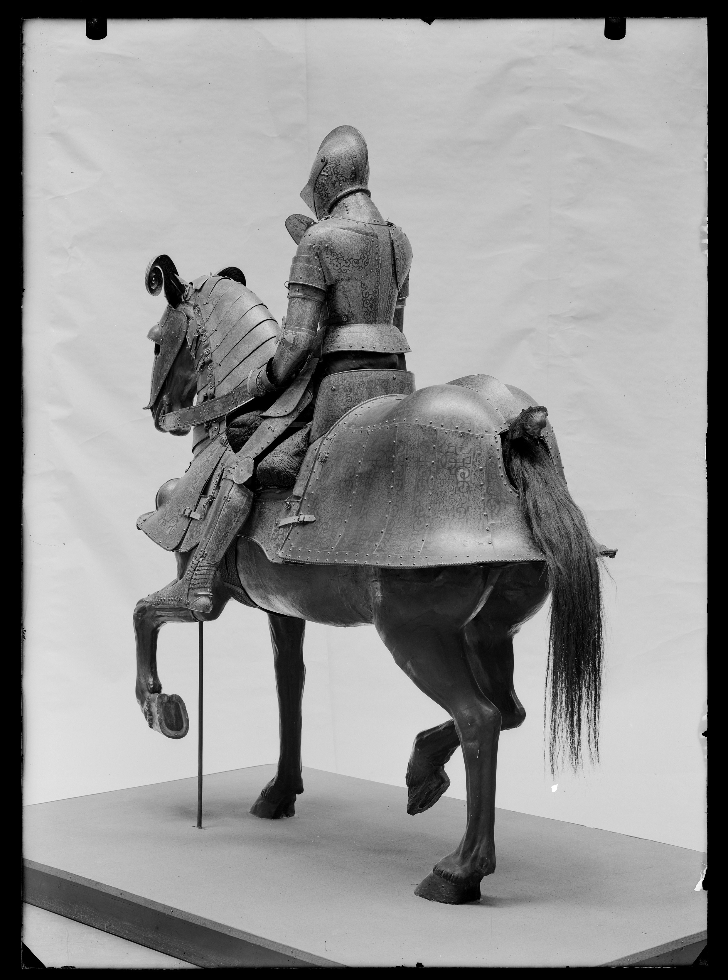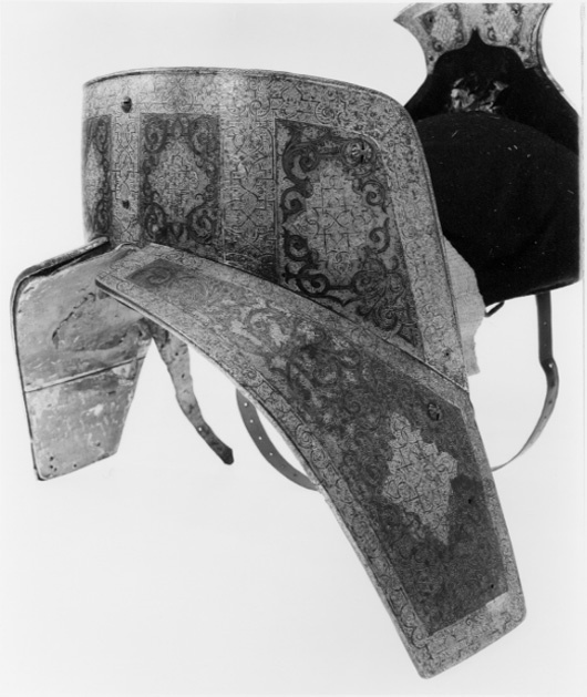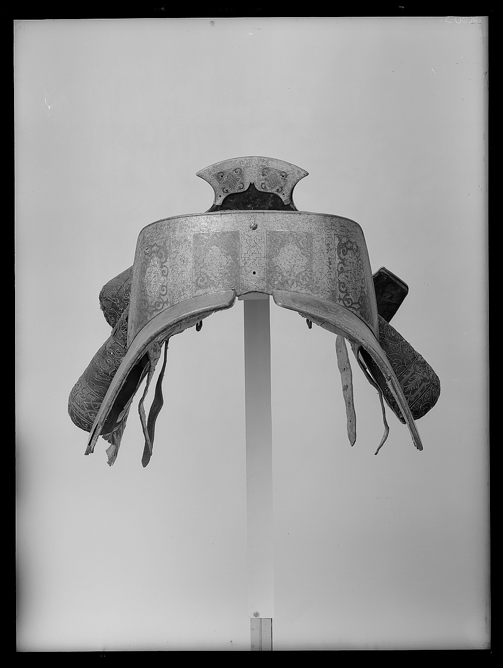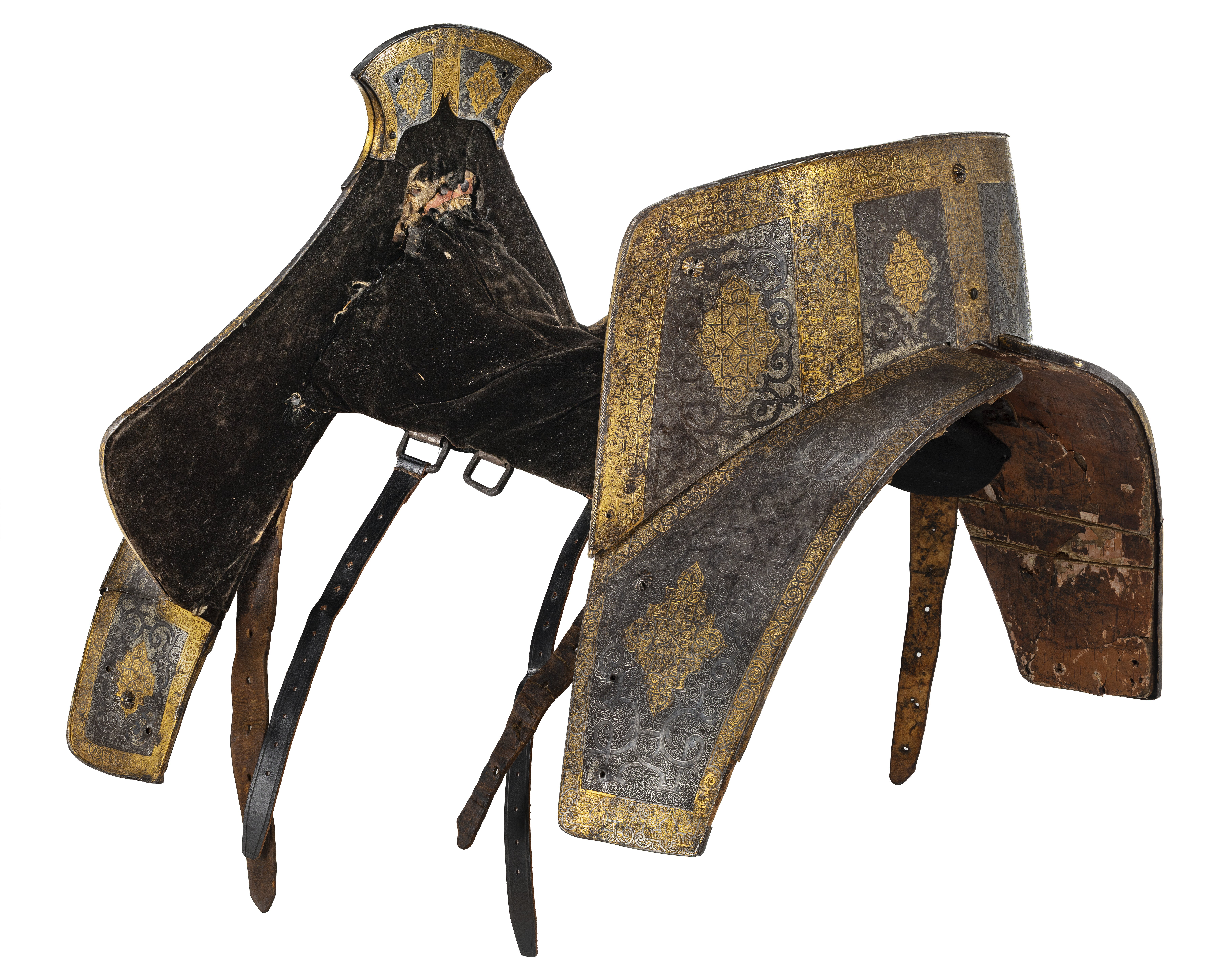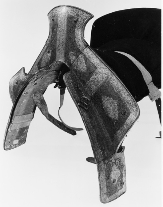 Sadel, ingående i Sigismund Augusts rustningsgarnityr för man och häst. Skänkt år 1574 av prinssessan Anna av Polen till Johan III. Tillverkad på 1550-talet av Kunz Lochner i Nürnberg.