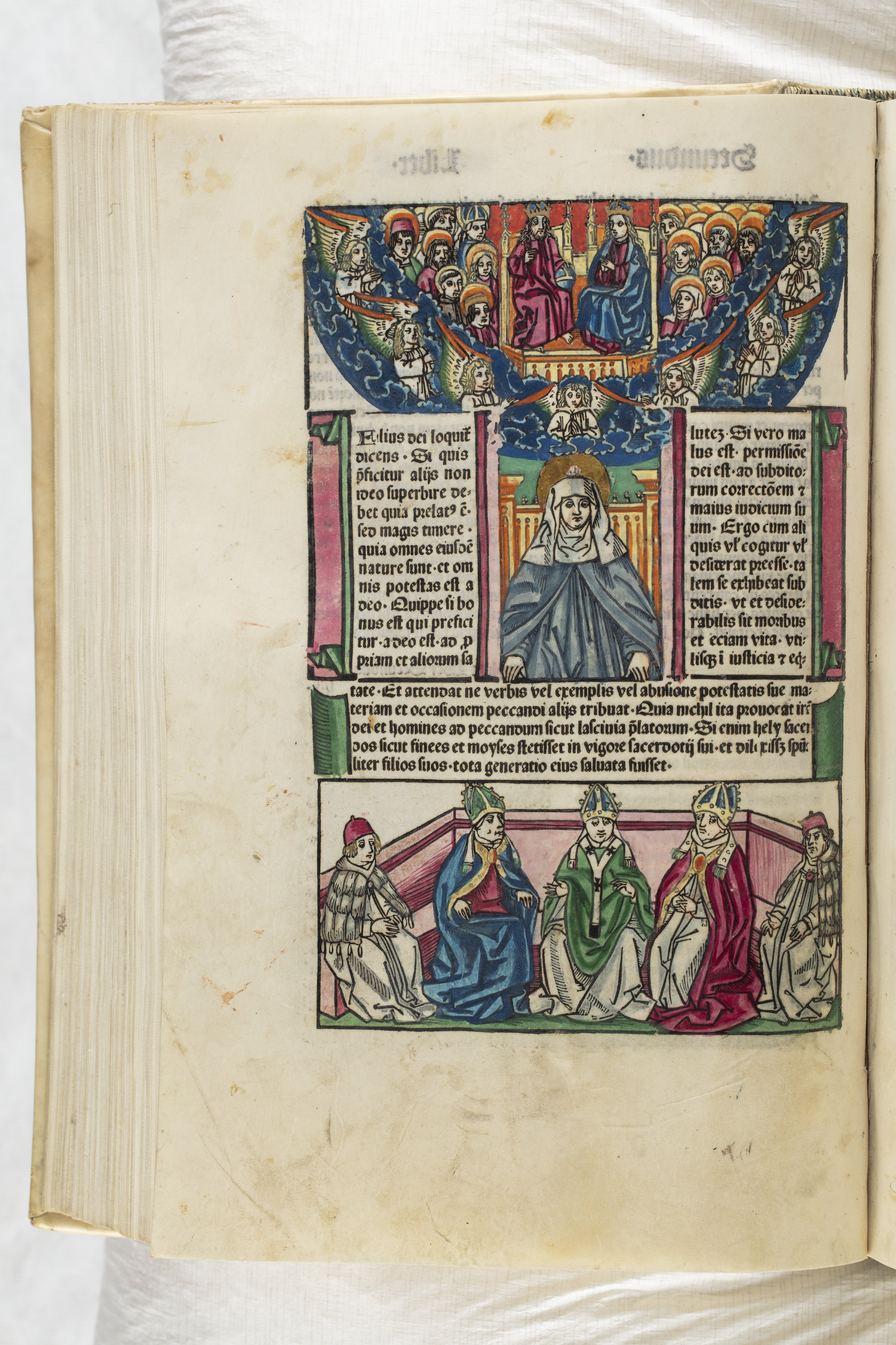 Pergamentband. Pärmfyllnad: papp. Tryckt på pergament med handkolorerade illustrationer utförda i träsnitt.