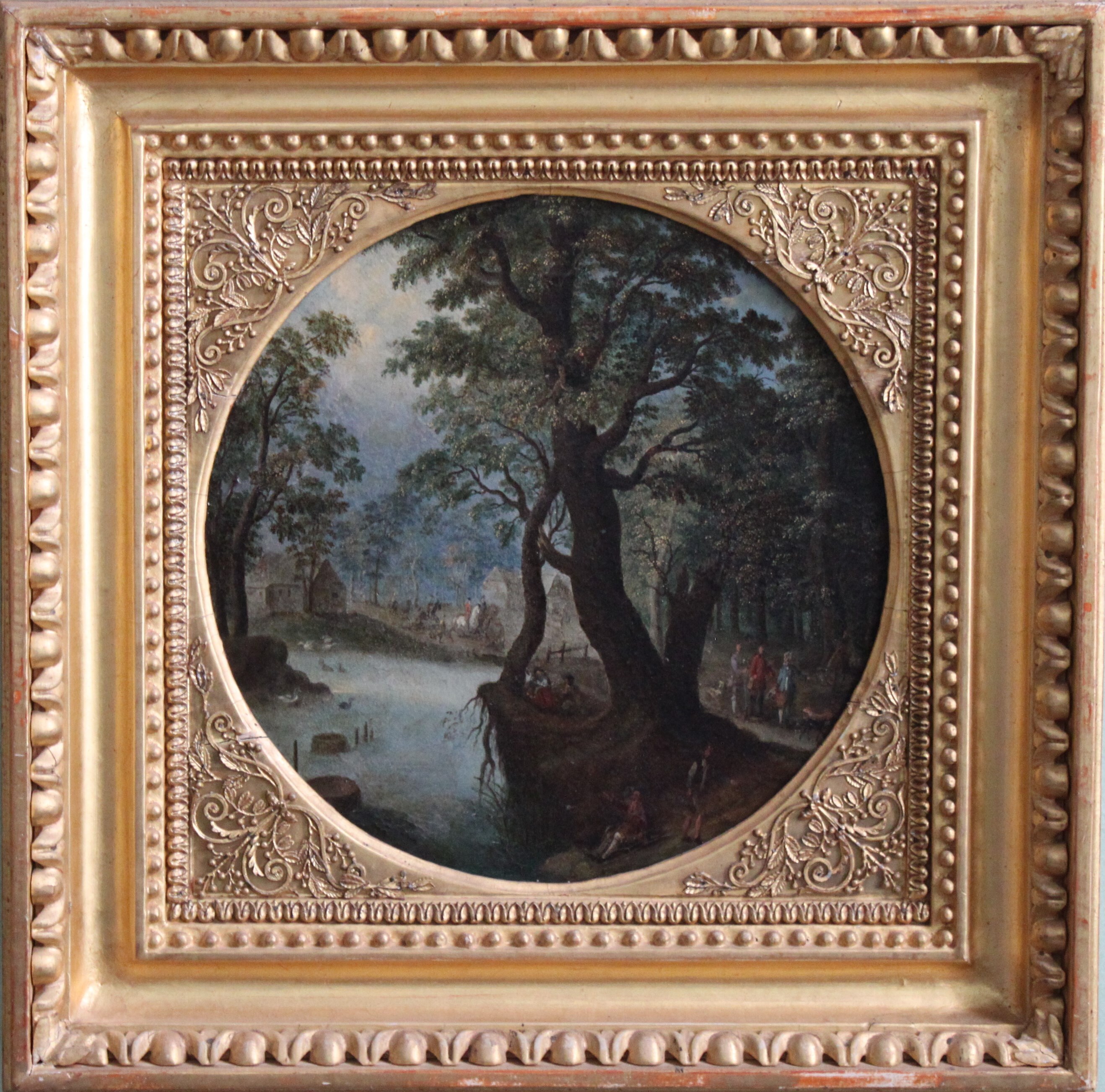 Landskap med två mörka träd i förgrunden. Ljusare bakgrund. Till vänster vatten. Jaktsällskap framför hus, vilande personer och metare. På baksidan av plåten "4" med ljus färg ca 2 cm. -- "54" med vit krita ca 1 dm. -- Vit lapp maskinskrivet "4683" , 1,5 x 3,5 cm. Rektangulär , förgylld ram med empireornament av bly i svicklarna. Ramlistens bredd 70 mm. På ramens baksida "23" svagt rödfärgat , ca 7 mm. Rött lacksigill "NL" eller "LN" på svickeln. På baksidan av ramen "4683" vit lapp maskinskrivet , 1,5 x 3,5cm.