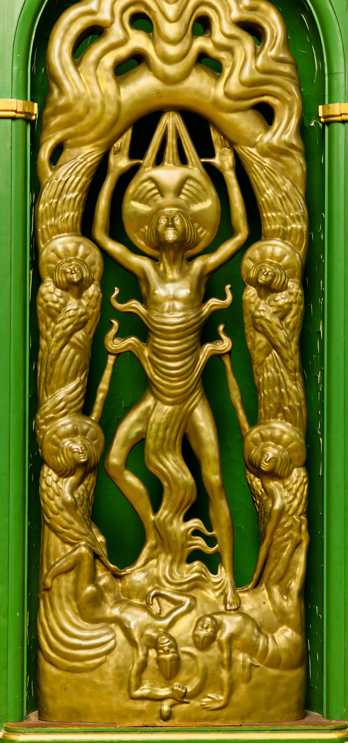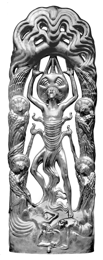 Skulptur. KRISTI UPPSTÅNDELSE, figurgrupp i ljus brons. Föreställer Jesus med gloria som färdas till himlen, omgiven av fyra änglar. Modellerad efter beställning av Wilhelmina von Hallwyl av hennes dotter Ellen Roosval 1922.