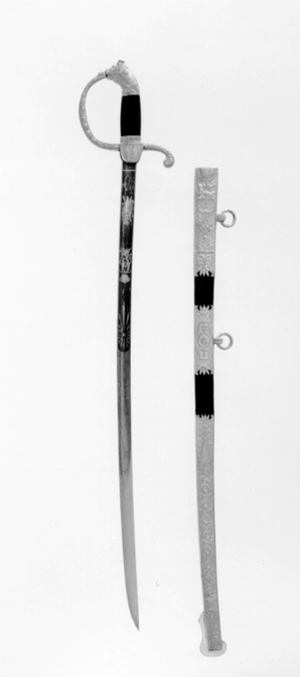 Balja av svärtat läder med breda beslag av förgylld mässing med snidad och punsad dekor. Munbleck 290 mm högt. Upptill med ovalt slätt urtag för styrskena, strålande nordstjärna därunder fana, bladornament samt konturerad nederkant. Mellanband 84 mmhögt med ett ringformigt ornament med krona på ena sidan och svärdfäste på andra sidan, kantdekor av bladornament. Doppsko 280 mm lång med kantdekor av bladrankor samt därefter en löst tvinnad ek- och lagerranka därefter kantdekor av blad. Släpsko högre framtill än baktill samt konturerad. På munbleckets och mellanbandets bakre kant rund räfflad hållare med koppelring.