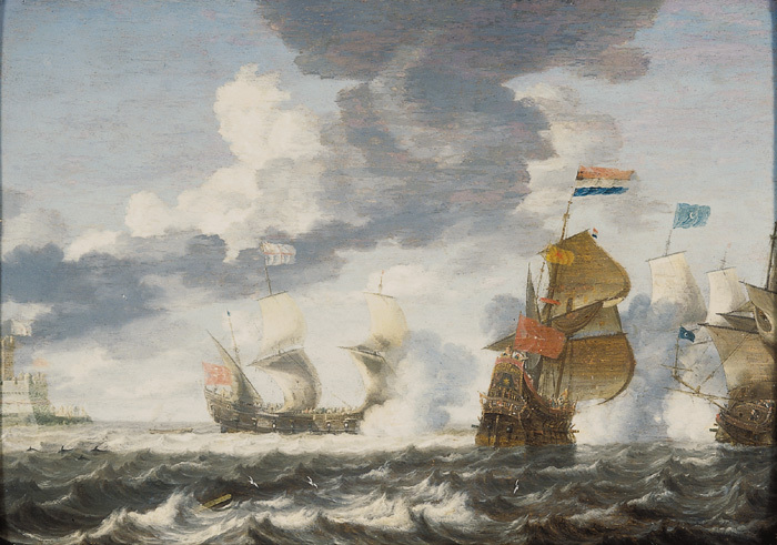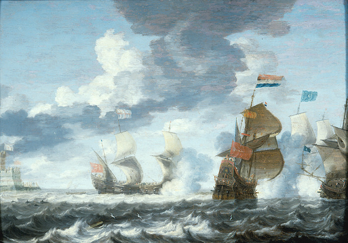 - Sjöstrid mellan holländare, engelsmän och barbaresk-sjöröfvare. Upprördt grått haf, i förgrunden med ett mörkare bälte. I förgrunden något åt höger ett stort brunt tremastadt holländskt skepp med fören snedt bortåt höger, förmasten med fock- och märsseglen hissade, stormasten med hissadt märssegel och till hälften beslaget storsegel, kryssmasten med hissadt latinsegel, alla segel i gråbrunt samt med lagningar i brunt och grått; å kryssmasten en gulbrun flagga med ett rödt lejon åt höger (grefvarnas af Holland vapen), å stormasten och förmasten holländska flaggan; akterspegeln rikt utsirad med förgyllda sniderier, längst upp en brygga med snidad balustrad, hvarå en brun oval sköld, därunder en åttauddig stjärna i guld mot blågrön botten, under denna två öfver hvarandra liggande bryggor med balustrader, i midten å den nedre en oval sköld med en silfverbjälke i rödt fält (Österrikes husvapen?); nedtill på ömse sidor om rodret en utskjutande kanonmynning, längs styrbordssidan ett batteri af sex kanoner med utskjutande mynningar i rödt och grönt; från den närmast fören affyras ett skott; å babords sida två dylika kanonmynningar syn Längst till höger ett stort gråbrunt fartyg, halft åt vänster, endast förskeppet med galjon synligt; blindan och bofvenblindan beslagna; å förmasten märsseglet till hälften nedfiradt, fockseglet hissadt; en del af stormastens märs- och storsegel synlig; å bofven-blindemasten mörkgrön gäckengös med hvit halfmåne; å förmasttoppen en flik af en mörkgrön flagga; å fören och å galjonsväggen sniderier; i fören otydlig röd galjonsbild, å babordssidan en kanonglugg med en grön kanonmynning, å styrbords sida två långt utskjutande kanonmynningar; i galjonsväggen till vänster en glugg, till höger i en öppning en man i hvit turban och mörka kläder; å däcket otydligt framskymtande besättning, en man siktande med ett gevär mot det förut; beskrifna fartyget, i hvit turban och gråa kläder. Mellan de båda fartygen ett annat, med endast märsseglet synligt å förmast och stormast, för öfrigt bortskymdt af kanonröken; å stormasten grön flagga med hvit halfmåne samt å förmasten en röd. Till vänster om det först beskrifna skeppet, något längre bort, ett annat, fören åt höger, för- och stormaster med hissade segel samt å kryssmasten till hälften hissadt latinsegel, å stormasten en stor engelsk flagga (rödt St. Georgs-kors i hvitt falt), å förmasten en röd flagga samt å kryssmasten en grön; i aktern en röd flagga, hvarå en ur ett grått moln åt vänster framsträckt arm i gult, hållande en sabel; bakom flaggspelet en gul lanterna på stång; å styrbords sida sju utskjutande kanonmynningar; fören skymd af tät grå kanonrök; å däcket manskap med kläder i gråbrunt, brunt, rödt och grönt. Ett stycke akter om fartyget en tom gråbrun roddbåt. Midt för denna längre mot horisonten två gråbruna segelfartyg. Till vänster en fästning å grågrön grund och med upptill förkroppad och krenelerad ljust grågrön sköldmur; vid högra sidan en stång med fana i otydliga färger i rödt och guld; till vänster å fästningen ett kreneleradt högt grårödt fyrsidigt torn, å detta en engelsk flagga (rödt St. Georgs-kors i hvitt fält); å tornets krön två samt inom sköldmuren flere otydliga figurer. Bortom fästningen å stranden flere dylika. I förgrunden tätt öfver vattnet tre flygande hvita fåglar, i vattnet en gråbrun planka och längst till vänster fyra tumlare. Himlen ljusblå med ljusgråa moln, framfor dessa svartgråa rökmoln. Vind och ljus från vänster. Till vänster, å den ur sjön uppskjutande plankstumpen, signerad: På trä (ek). Höjd: 0.415 m.; bredd: 0.595 m. BONAVENTURA Peeters d. ä., döpt 23 Juli 1614 i Antwerpen, d. 25 Juli 1652 i Hoboken, en by i närheten af denna stad; synes hafva gjort stora sjöresor och var sedan 1634 mästare i Antwerpen; marin- och landskapsmålare samt etsare. Enligt Alfred von Wurzbach: »Niederländisches Künstler-Lexikon», Zweiter Band, Wien und Leipzig 1910. Se Olof Granberg: »Inventaire général des trésors d’art, peintures & sculptures, principalement de maîtres étrangers (non Scandinaves) en Suède, K Tome I, Stockholm 1911, nå 337 (sid. 76), och Tome II, nå 358 (sid. 98; plansch 85). Ram (gammal): Svartbetsad och polerad samt med ornerad dagerlist i gips; på blindram af furu. Profil som figuren (orig. 8/i): Glas. Höjd: 0.595 m.; bredd: 0.77 m. Midt å baksidan ett sigill i rödt lack: ^ v^nster om ^etta ett stansadt monogram: >Ö[T samt i midten upptill en fastklistrad hvit papperslapp, hvarå skrifvet med svart bläck (orig. YJ: \t2é.\ Inköpt af Wilhelmina von Hallwyl, f. Kempe, 7 Oktober 1904 i H. Bukowskis Konsthandel (innehafvare C. U. Palm), Arsenalsgatan 2 D, Stockholm, se räkning samma dag. Betald 8 Oktober 1904, se Rescontra (Wilhelmina VON Hallwyl) och Toilettbok. Pris: Kr. 400, se räkning. Inköpt tillsammans med B.80—B.86 och B.88—B.91 till sammanlagdt pris af Kr. 22 000, se räkning. Likviden erlagd med Kr. 12500, se Toilettbok, samt med Kr. 9500, gåfva till Wilhelmina von Hallwyl, f. Kempe (häraf Kr. 3000 se Rescontra [Walther von Hallwyl] och Kr. 6500 från Johanna Kempe, f. Wallis). Af direktören C. U. Pålm inköpt å auktion hos Frederik Muller & C:ie i Amsterdam 21 September 1904 å Dr. H. VAN der Burghs i Haag samling för Fl. 300.