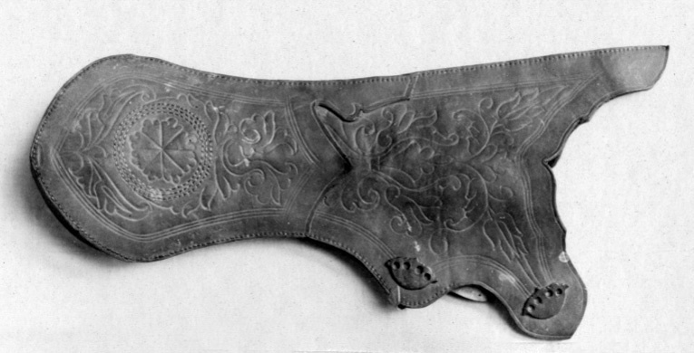 Koger av brunt läder, sytt med försilvrad koppartråd. Infälld botten. På utsidan svärtat och ornerat med pressad dekor i form av kantlinjer och stiliserar växtmönster. På nedre delen konturerad flik. Mitt på koncentriska cirklar av försilvrad koppartråd. I ena sidan två genombrutna knoppformiga beslag av mässing. Insidan slät med ljusa läderremmar för bäranordning.