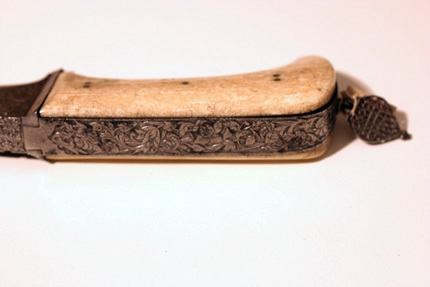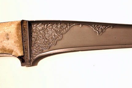 Upptill framåtböjt fäste klätt med fastnitade plattor av valrossbete, beslaget nedtill med stål med sliten bård av påslaget guld, runt fram- och baksidan skena av stål, dekorerad i relief. På fästets ovansida genombruten kläpp eller bygel av stål. Klinga av damaskerat stål, eneggad, 47 mm bred vid fästet, ryggen något konkav, förstärkt och bred 15 mm med snidad dekor av blomsterornament invid fästet och smal ås längs mitten. Klingan dekorerad med snidade blommor intill fästet och en bit längs ryggen.