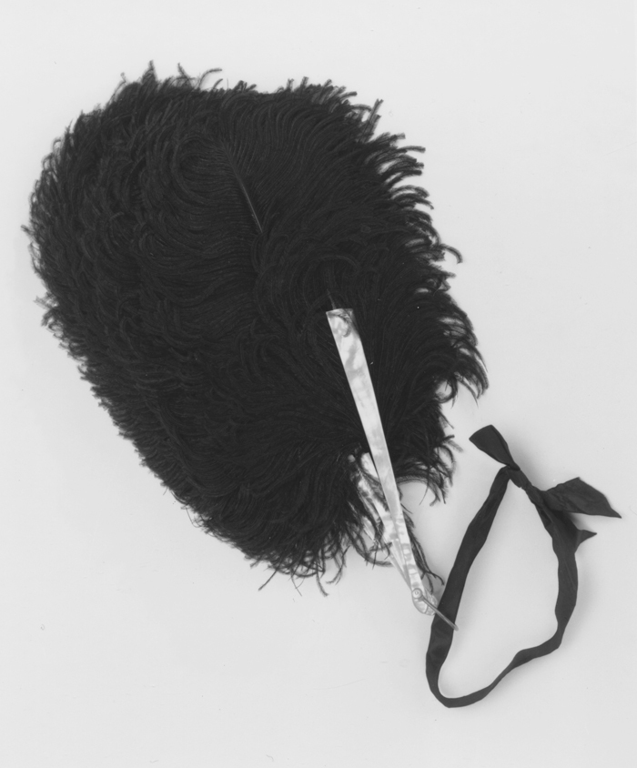 SOLFJÄDER Av 16 st svarta strutsfjädrar med fästen av pärlemor. Ett svart sidenband håller ihop pärlemorstagen. 34 cm lång. Har tillhört Ellen Roosval. Gåva 1952 av professor Johnny Roosval (protokoll 82 º 5).