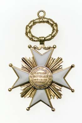 Vitemaljerat malteserkors av förgyllt silver, kulor på spetsarna. Mellan korsarmarna raka och böljande, förgyllda strålar. Svagt välvd medaljong täckt med blå, genomsynlig emalj, därpå fäst tre fasetterade, femuddiga, förgyllda stjärnor. Förgylld kant med sicksackdekor. Baksidans medaljong svagt välvd och förgylld, relieftext i mitten: "LATVIJAS // REPUBLIKA // 1918 G. 18. NO//VEMBRIS", runtom: "PER ASPERA AD ASTRA". Mellan den övre korsarmens spetsar två "fladdrande" band, tre otydliga stämplar på ena sidan, upptill en rörformig ring, däri fäst en oval, förgylld eklövskrans, upptill en ring.
