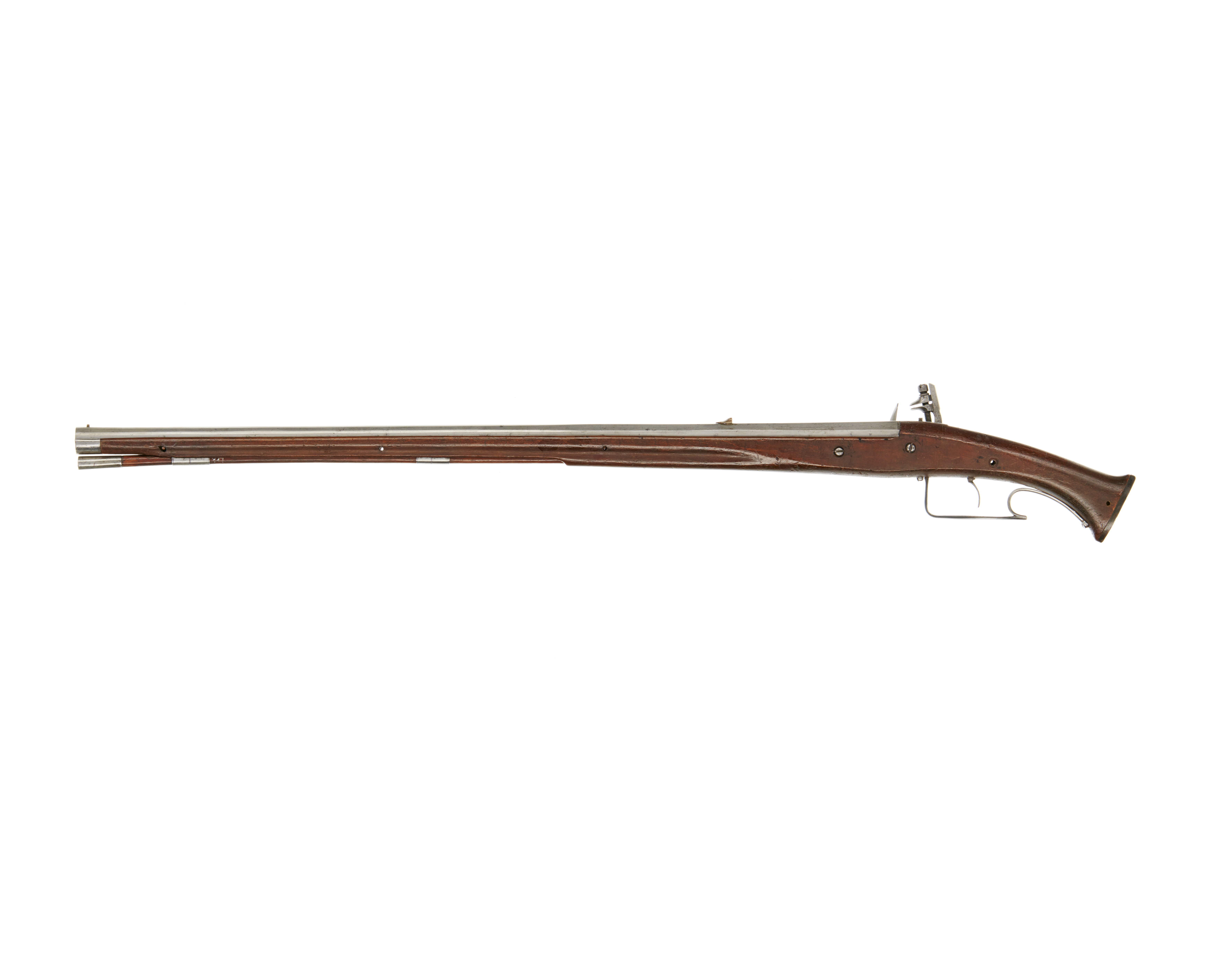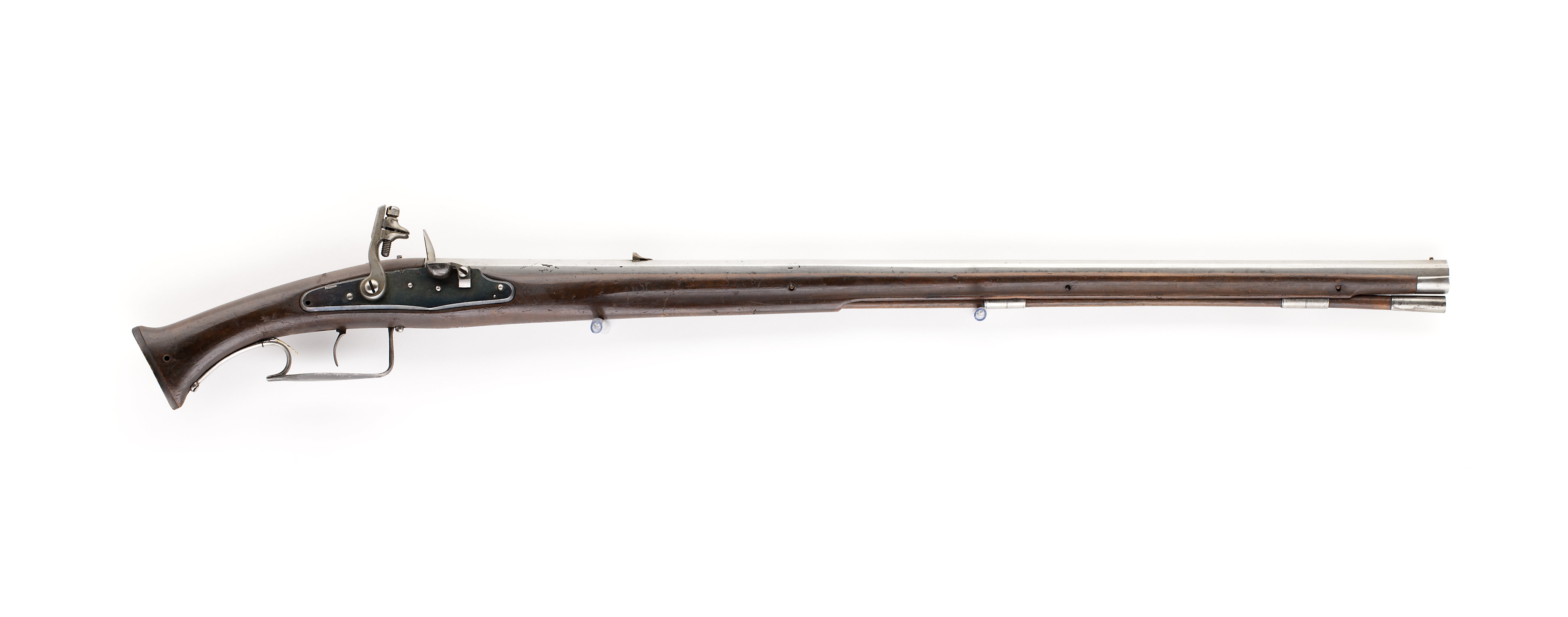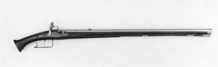 "Åttsidig", åttaräfflad pipa med svag trumf, obearbetad undersida, främre delen med fasade kanter. På kammaren stämpel: "M V" samt en graverad linje och tre fyrauddiga stjärnor. Svagt koniskt svansskruvblad med tvärt avskuren, bakre ände. Riktmedel: Sikte av brons(?) och korn av mässing. Fästning: Tre häften. Pipan fäst med krysskruv underifrån samt tre pipstift av trä. Hjullåsformigt, blånerat flintlås med plant låsbleck, fasade kanter. Svagt s-formig, platt, oblånerad hane, rak hangren med rundad baksida, rektangulära käkar, överkäken lös, cylindriskt käkskruvhuvud. Rundad, blånerad fängpanna. Batteri med invändigfjäder, oblånerat fängpannelock och eldstål, båda välvda, eldstålet smalt med åsning nertill. Nöt utan studel. Invändiga låsdelare ndast grovfilade. Fästning och avtryckare: Ursprungligen tre låsskruvar, den främre saknas. Avtryckaren svagt framåtsvängd med rak avslutning. Helstock av mörkbetsat trä (päron?). Spetsoval kolvände med kolvkappa av horn. Beslag av stål, två rörkor, näsband. Varbygel av stål med rester av blånering, framstolpen inskruvad i kolven, bygeln platt, rombisk, bakre stolpen C-formig, slät bakre arm. Tillbehör: Laddstock av stockens trä, l: 628 mm, invändigt gängad stålskoning i framänden, l: 39 mm, bakändens skoning fast i rännan.