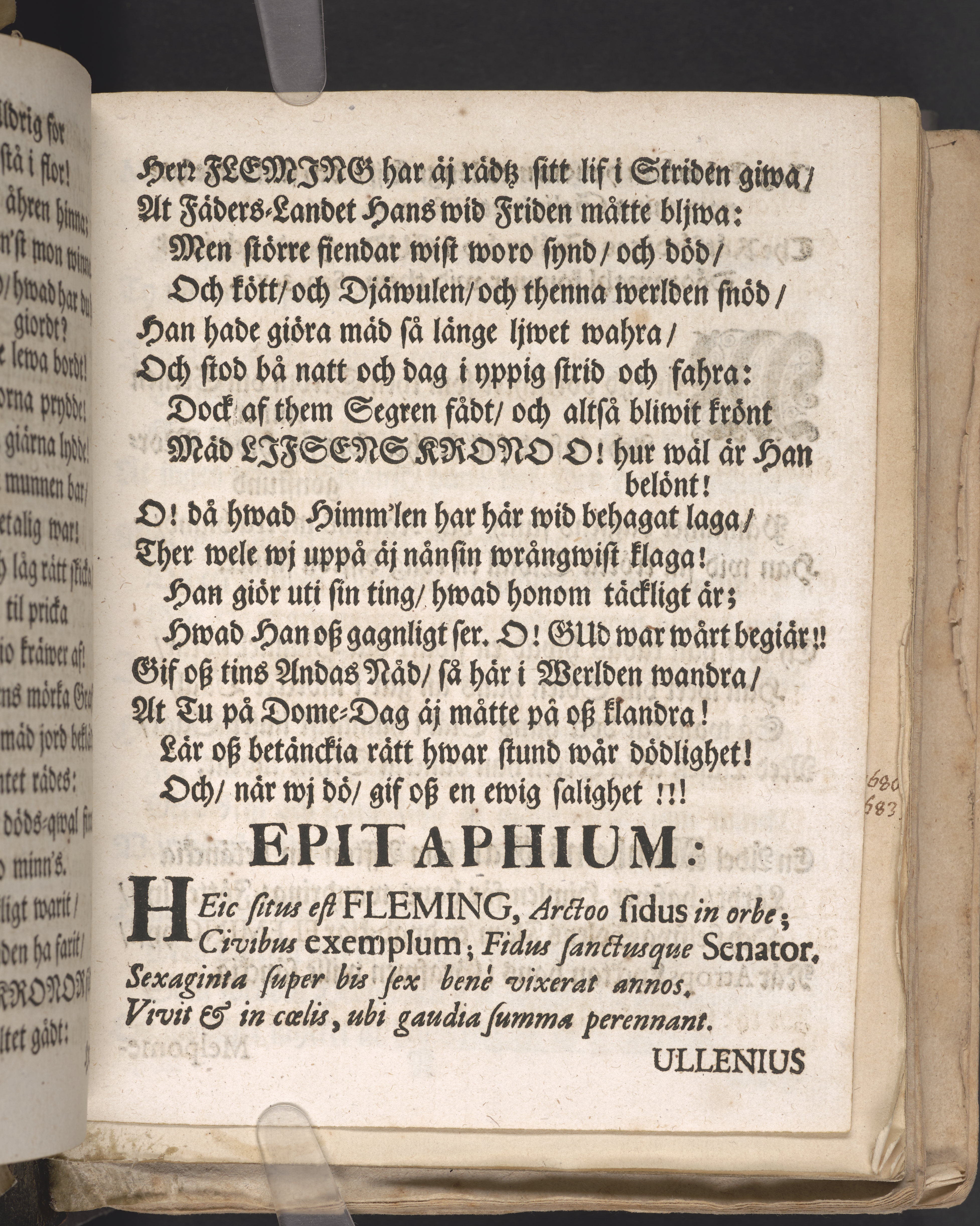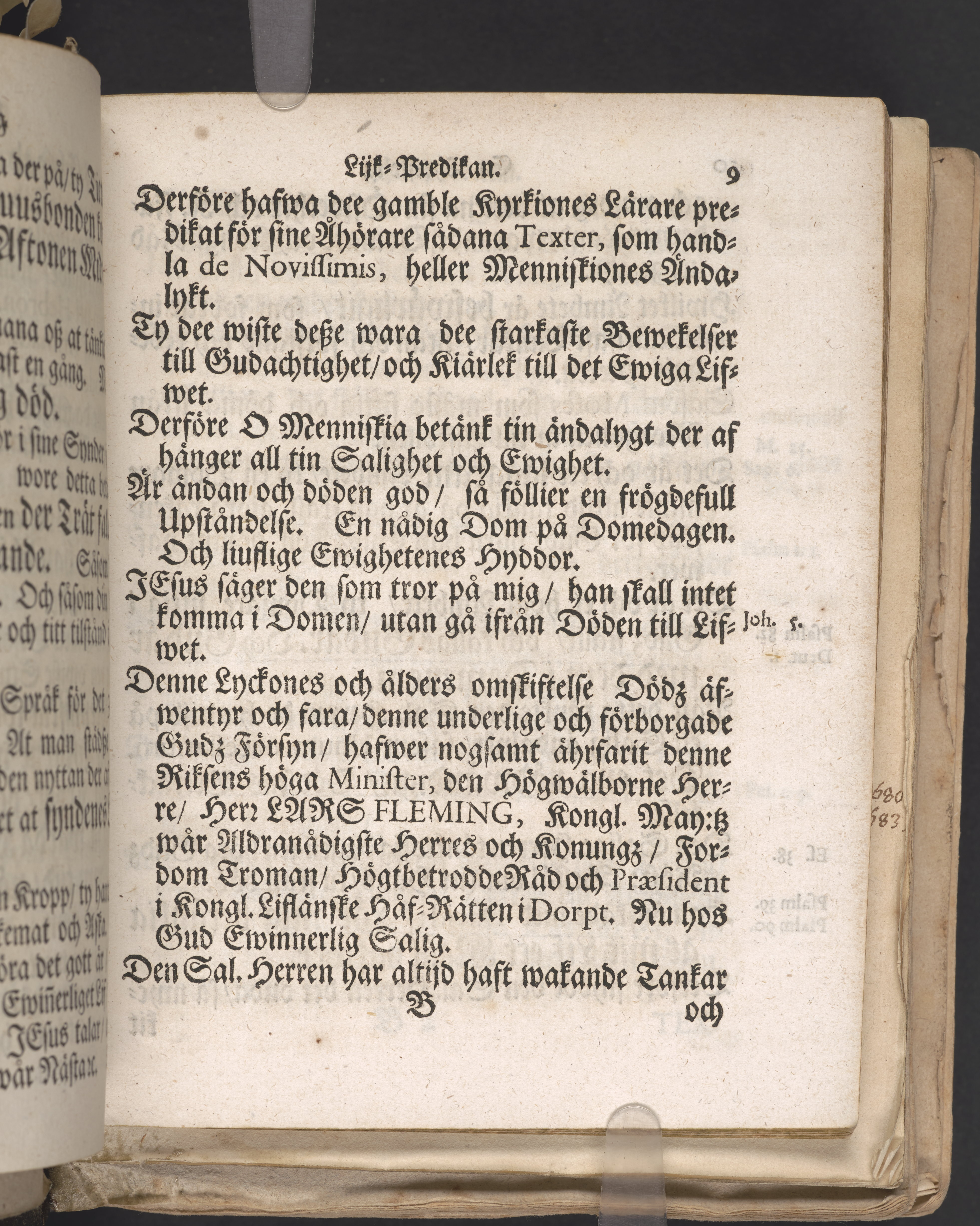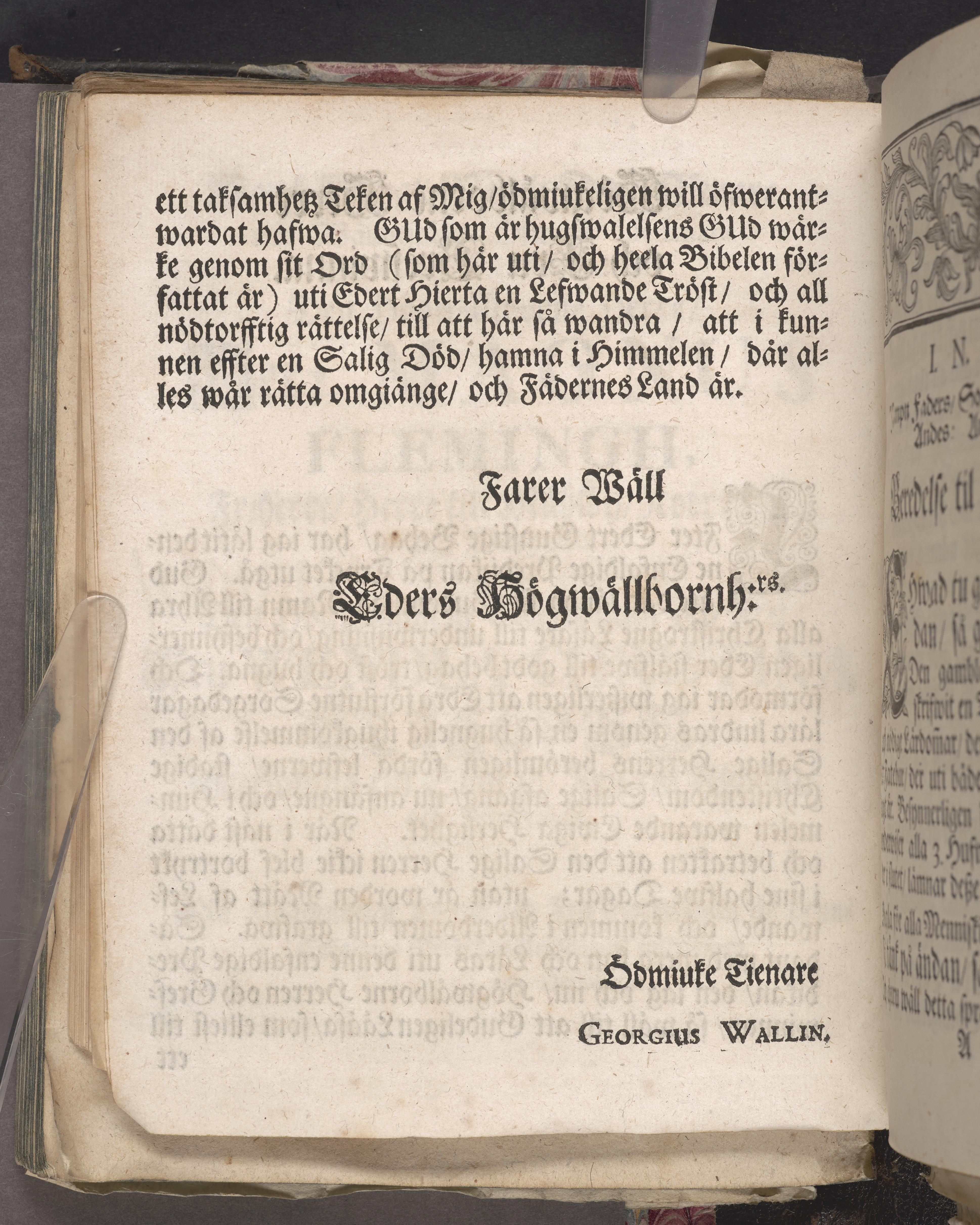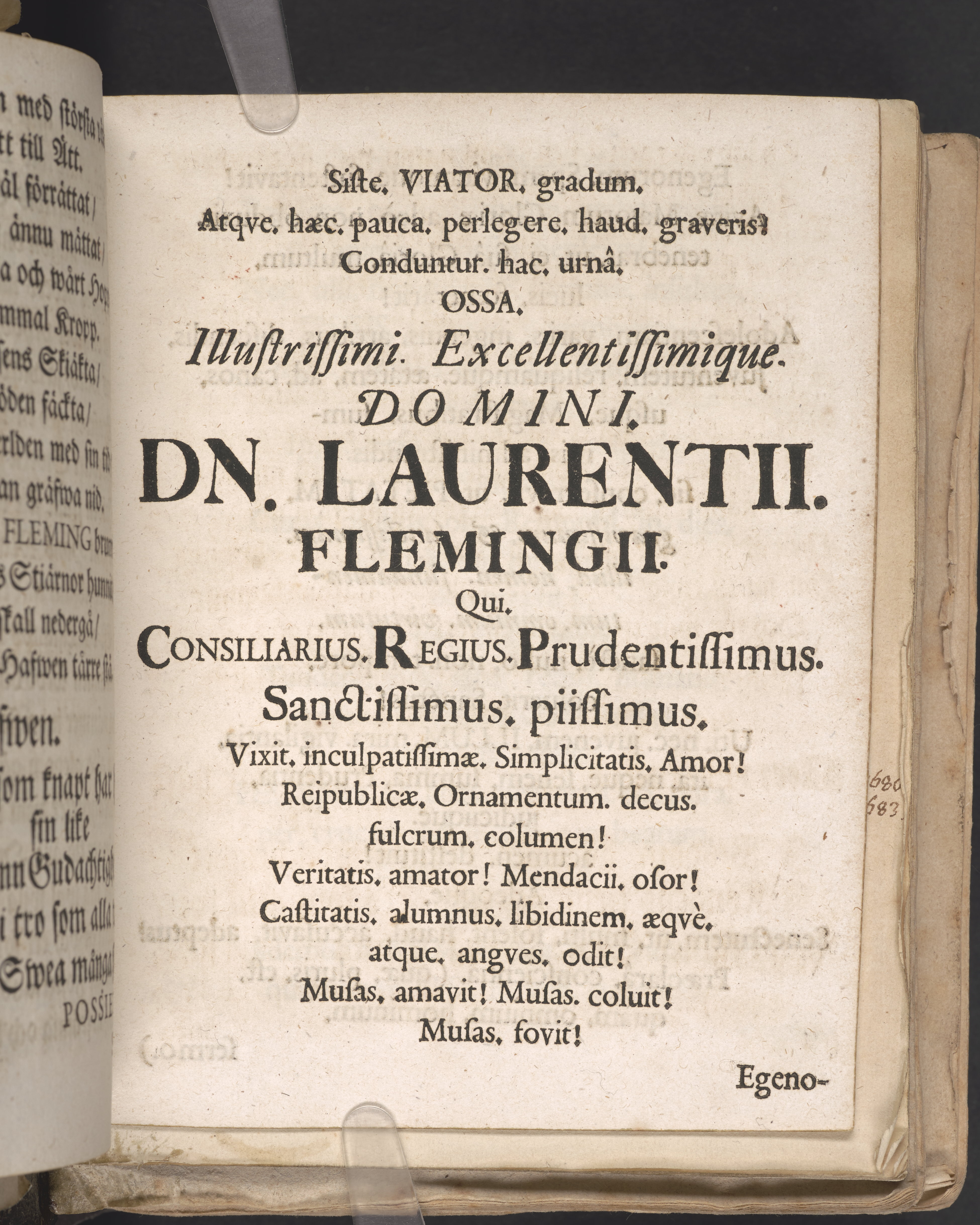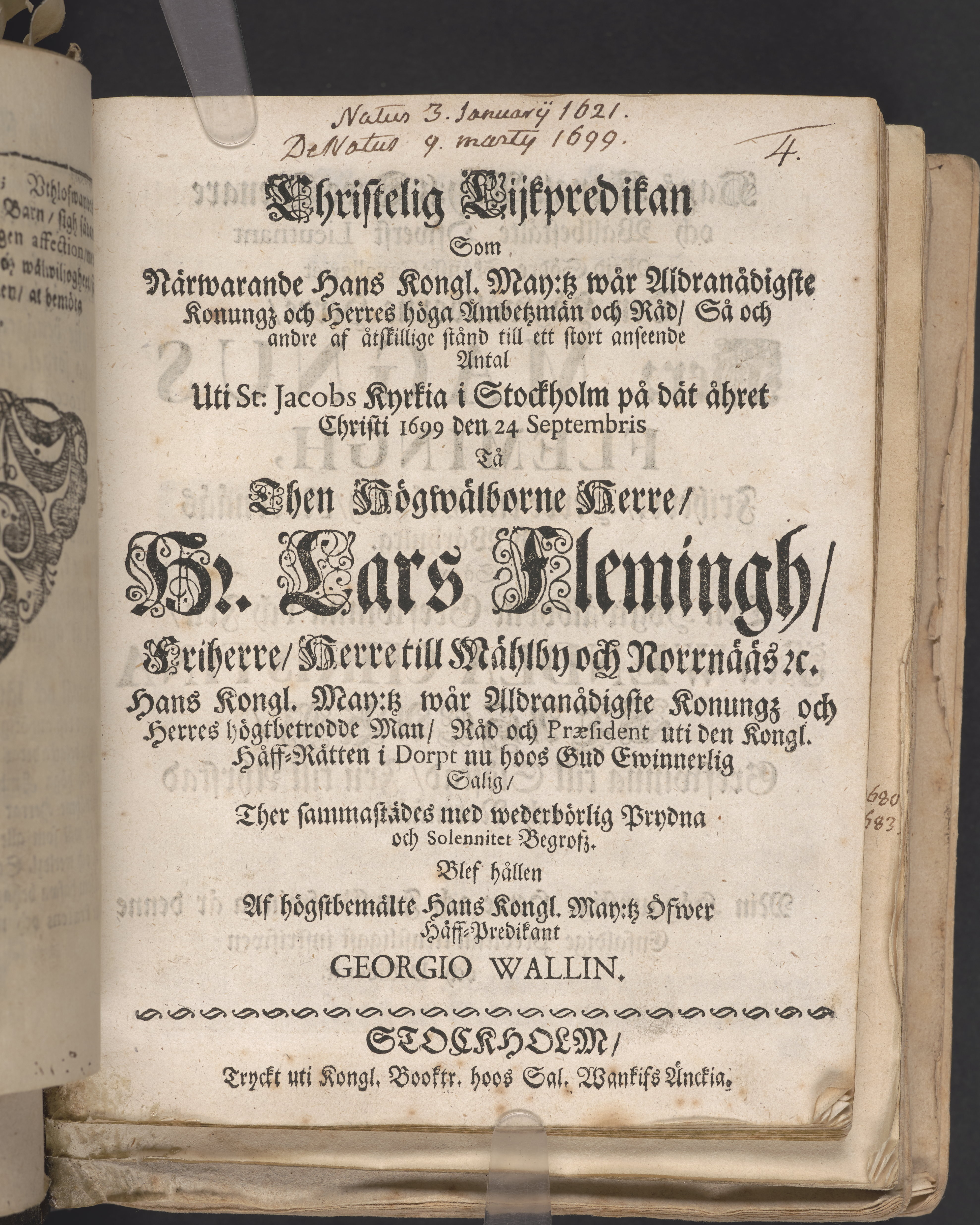 Christelig lijkpredikan som ... uti St. Jacobs kyrkia i Stockholm på dät åhret Christi 1699 den 24 septembris tå then högwälborne herre, Hr. Lars Flemingh, friherre, herre till Mählby och Norrnääs ... begrofsz. Blef hållen af ... Georgio Wallin. Stockholm, tryckt uti kongl. booktr. hoos sal. Wankifs änckia.